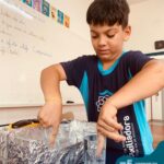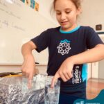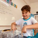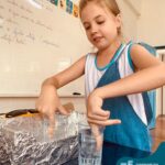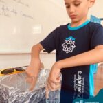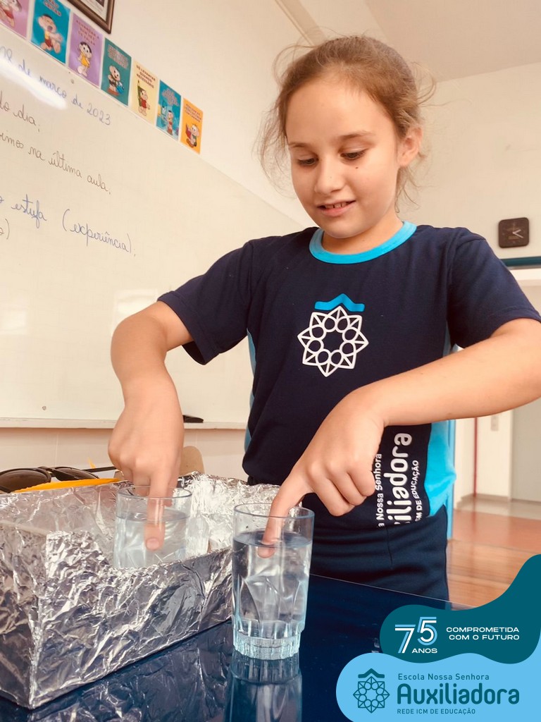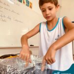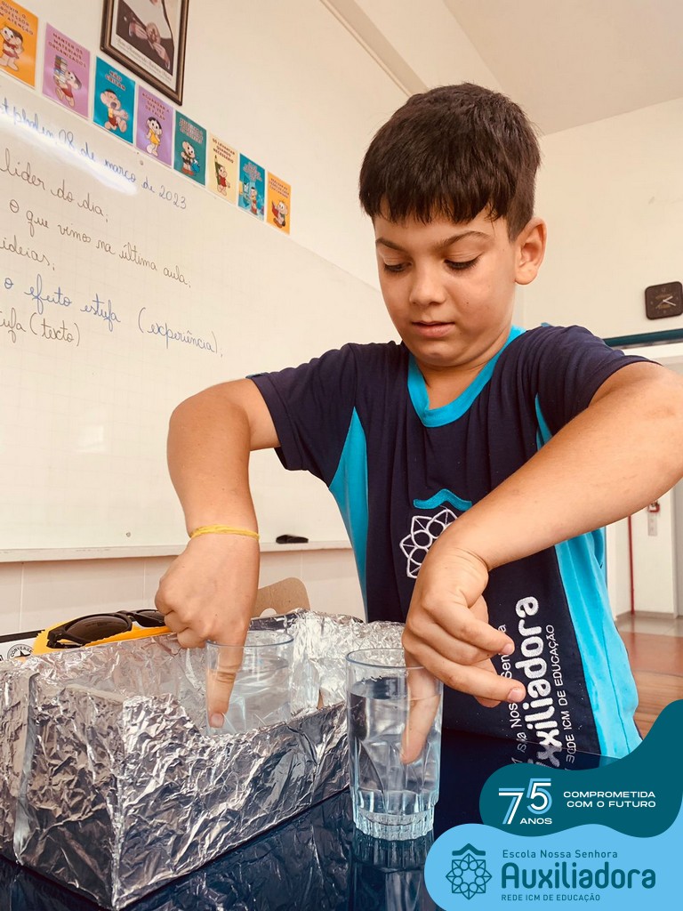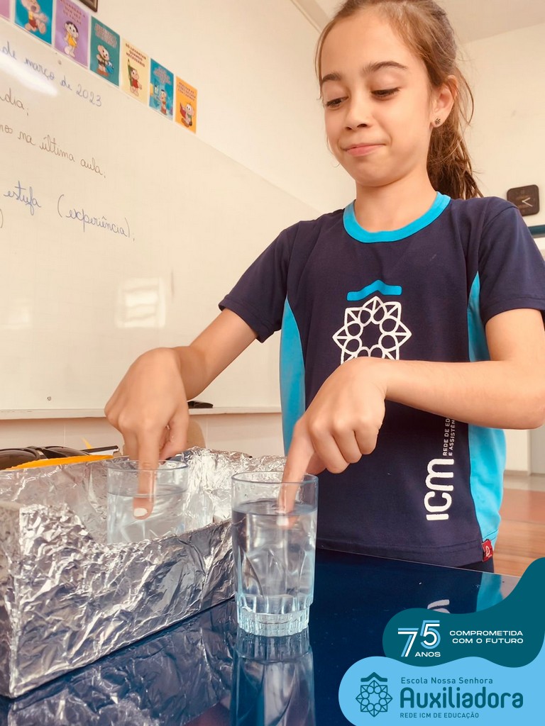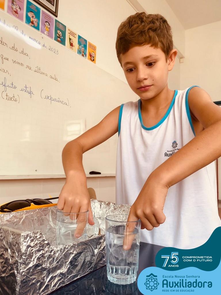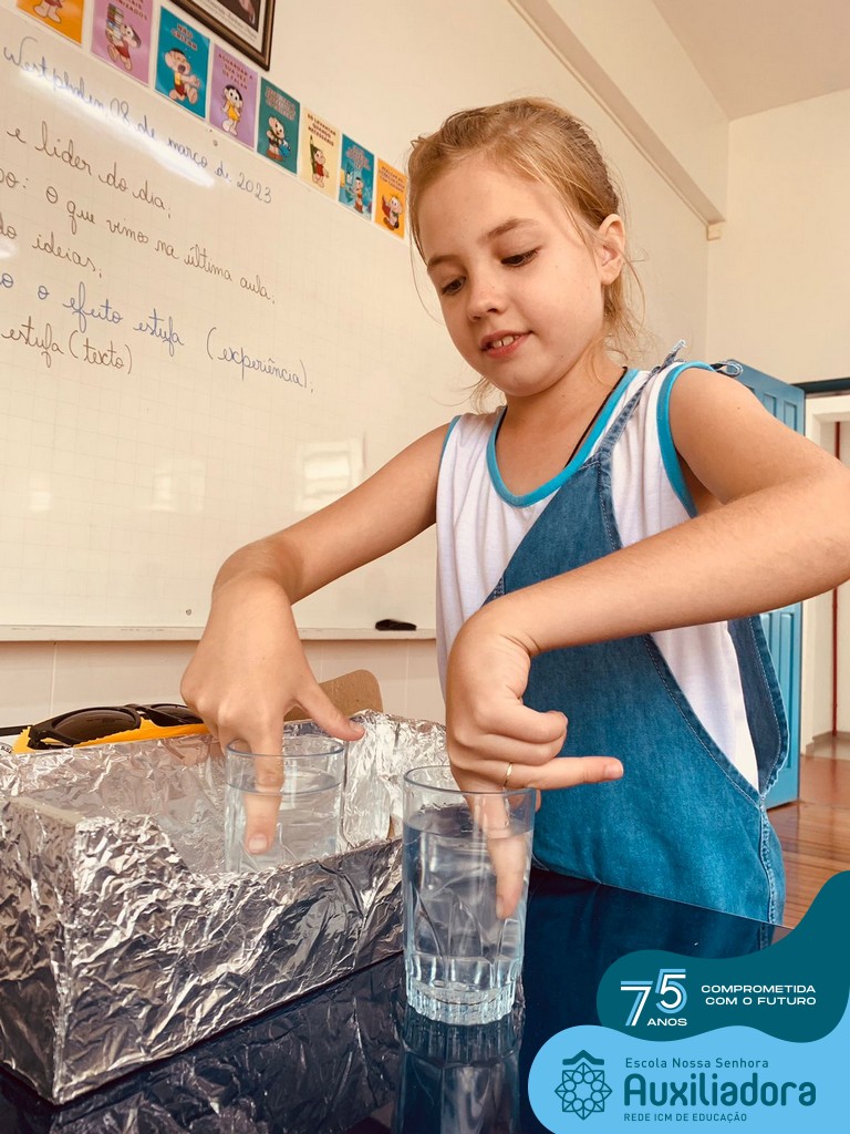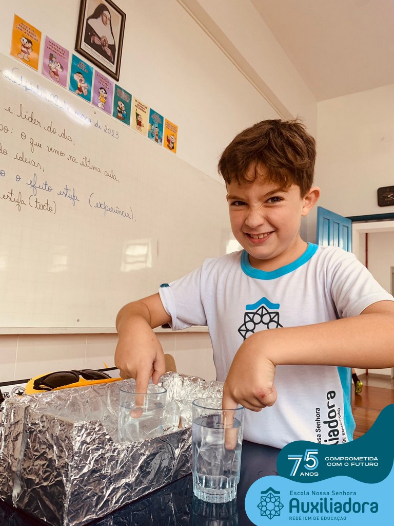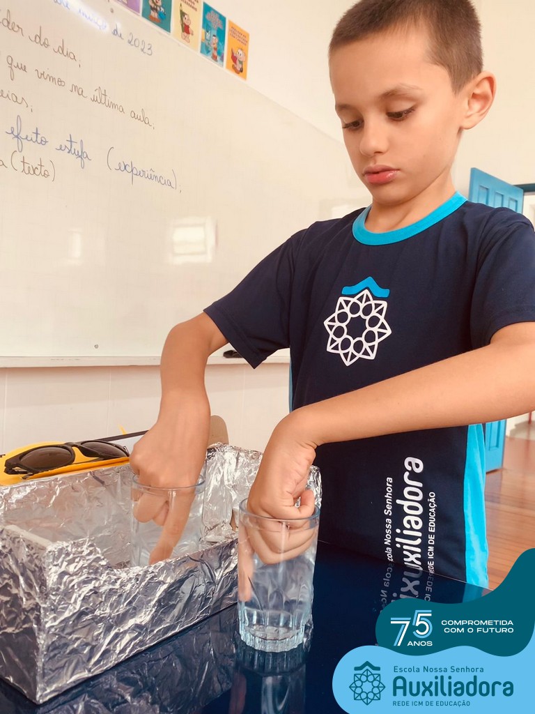 Você sabe o que é o efeito estufa? A turma do 4º ano soube que ele é responsável por manter as temperaturas médias globais, evitando que haja grande amplitude térmica e possibilitando o desenvolvimento dos seres vivos. Através da experiência “Simulador de efeito estufa” conseguiram entender como uma parcela da irradiação solar fica retida na atmosfera. Para isso, deixaram exposto ao sol dois copos com água: um deles, representando a Terra, ficou dentro de uma caixa forrada com papel alumínio (superfície terrestre) e foi coberto com papel filme PVC (atmosfera), 20 minutos depois surpreenderam-se com o resultado.