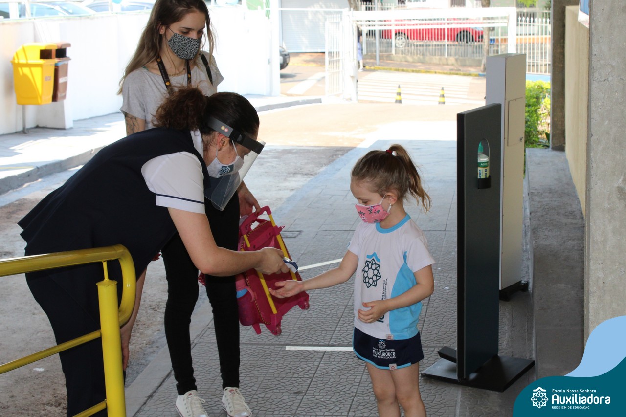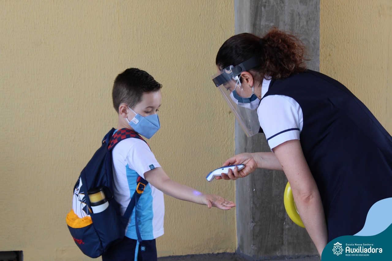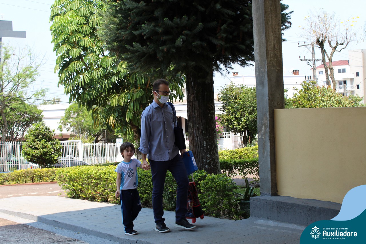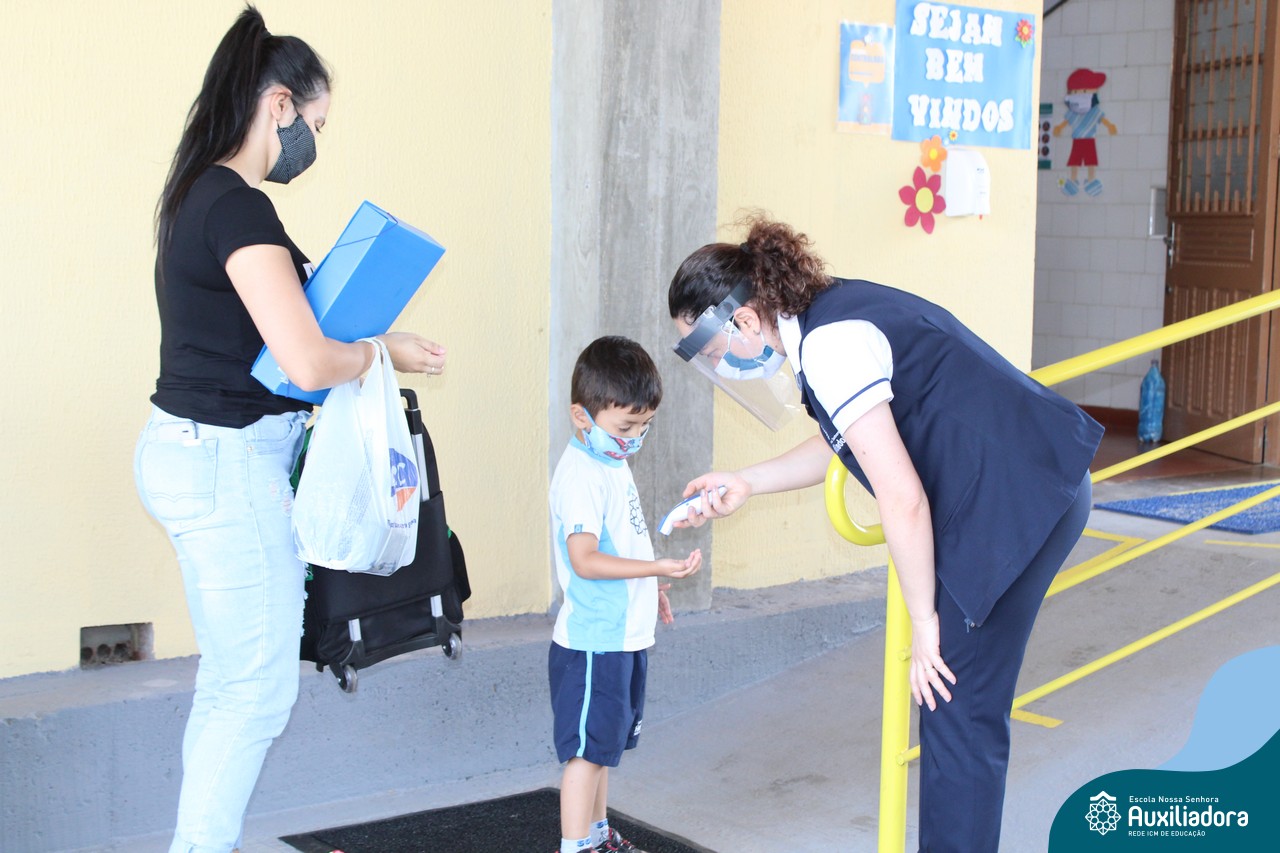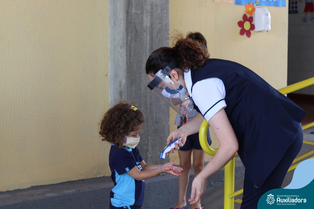 Os alunos e seus responsável passaram por todos os protocolos de segurança e prevenção ao Covid 19 na entrada da escola.
