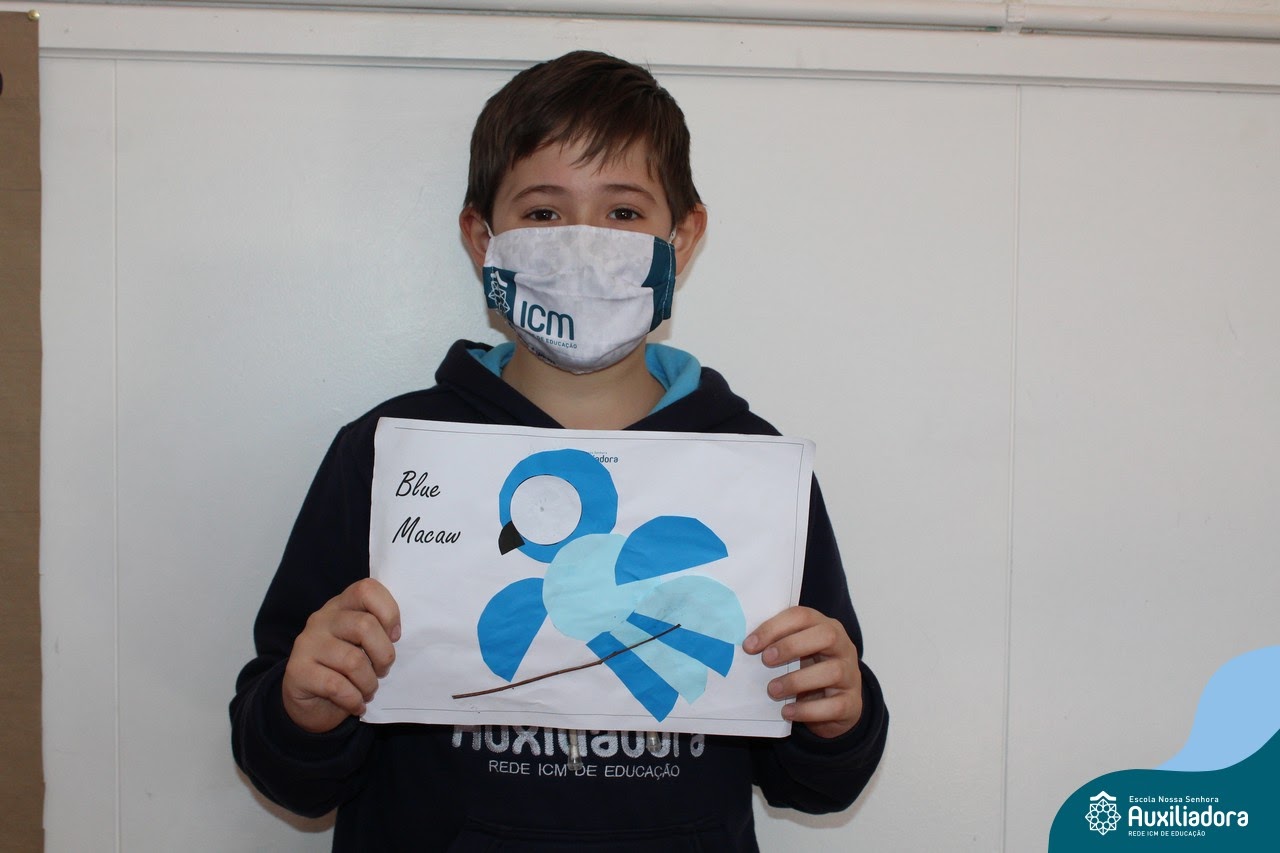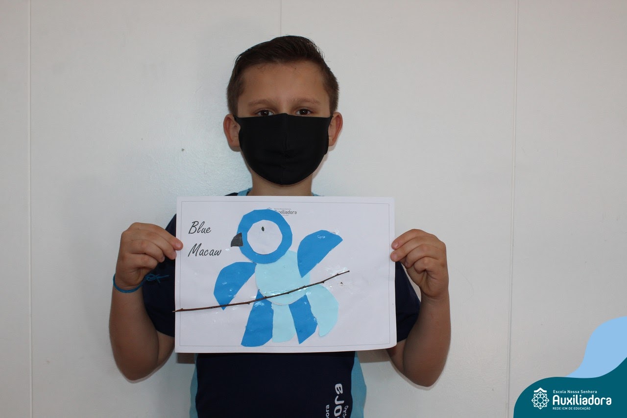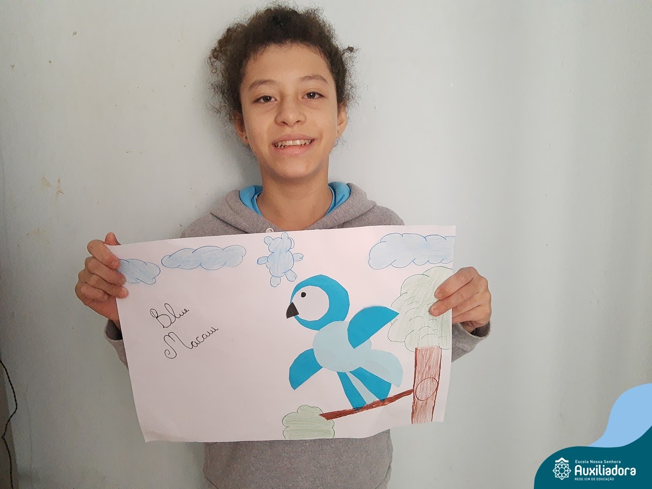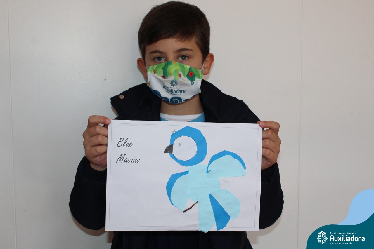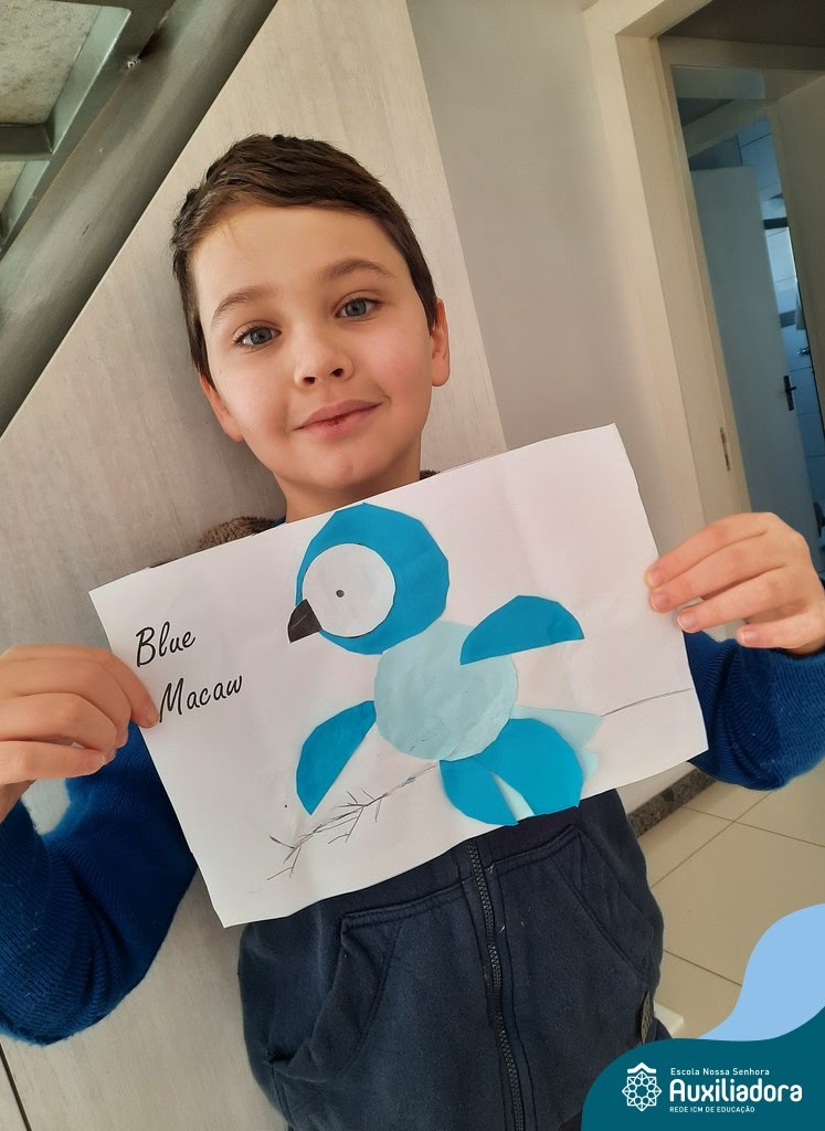 Por fim, como forma de produção de conhecimento, os alunos realizaram uma colagem simbolizando a Blue Macaw, pássaro brasileiro, de beleza ímpar e que merece proteção.