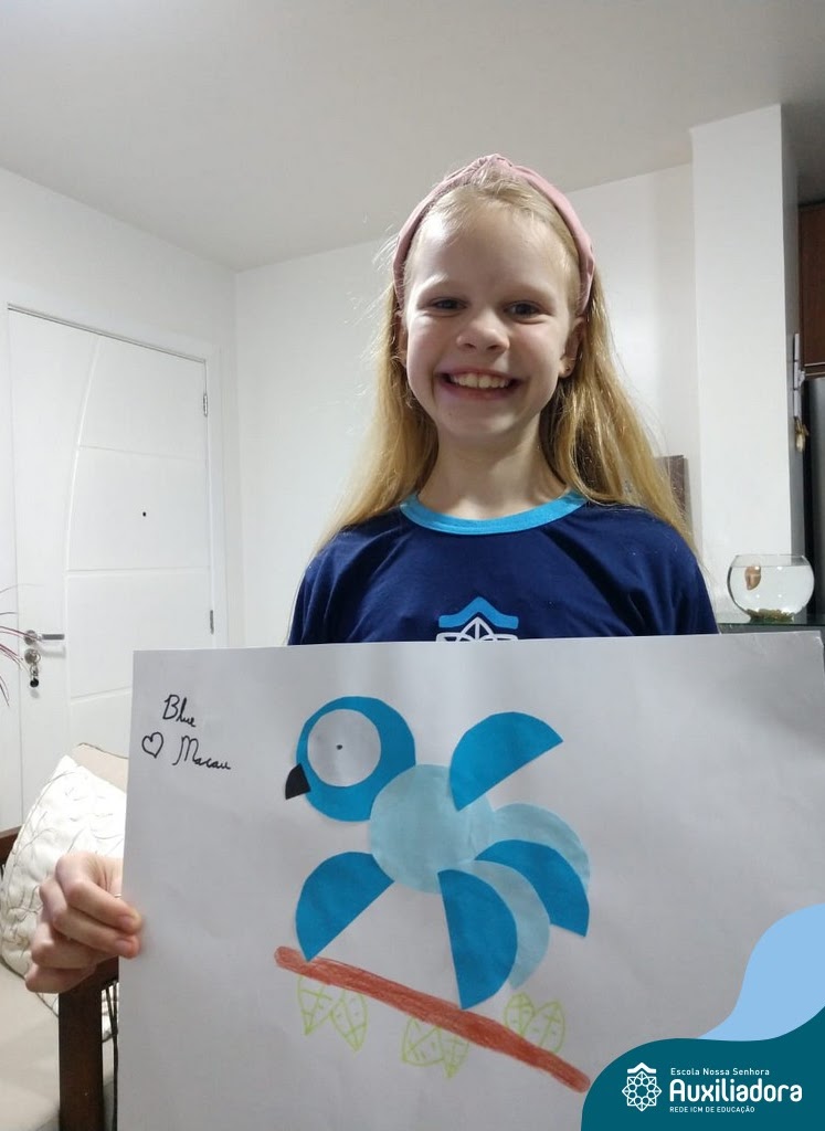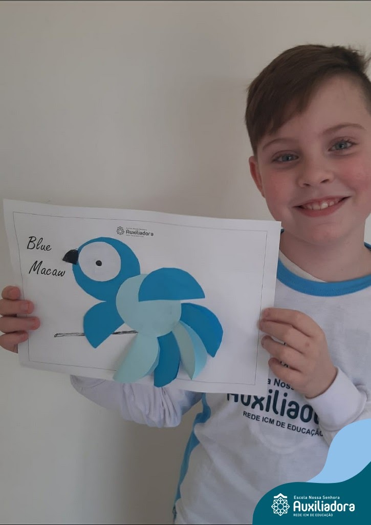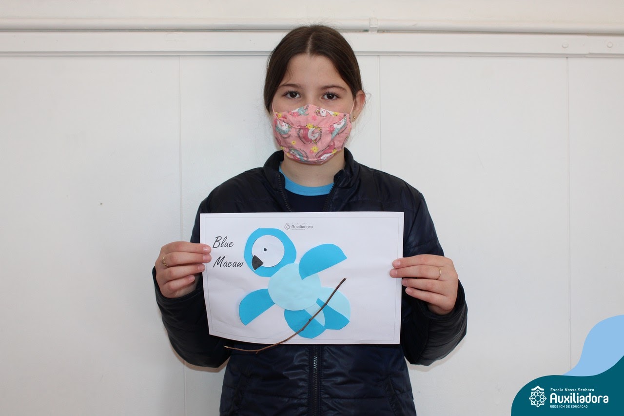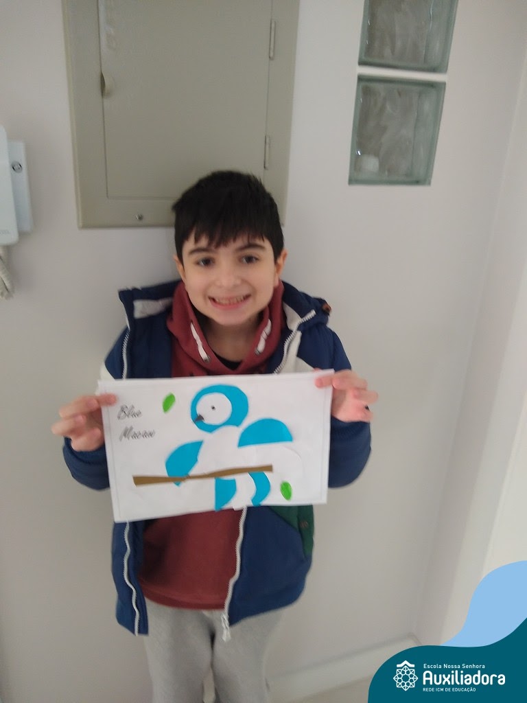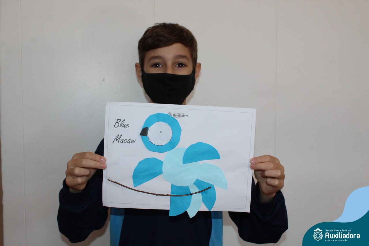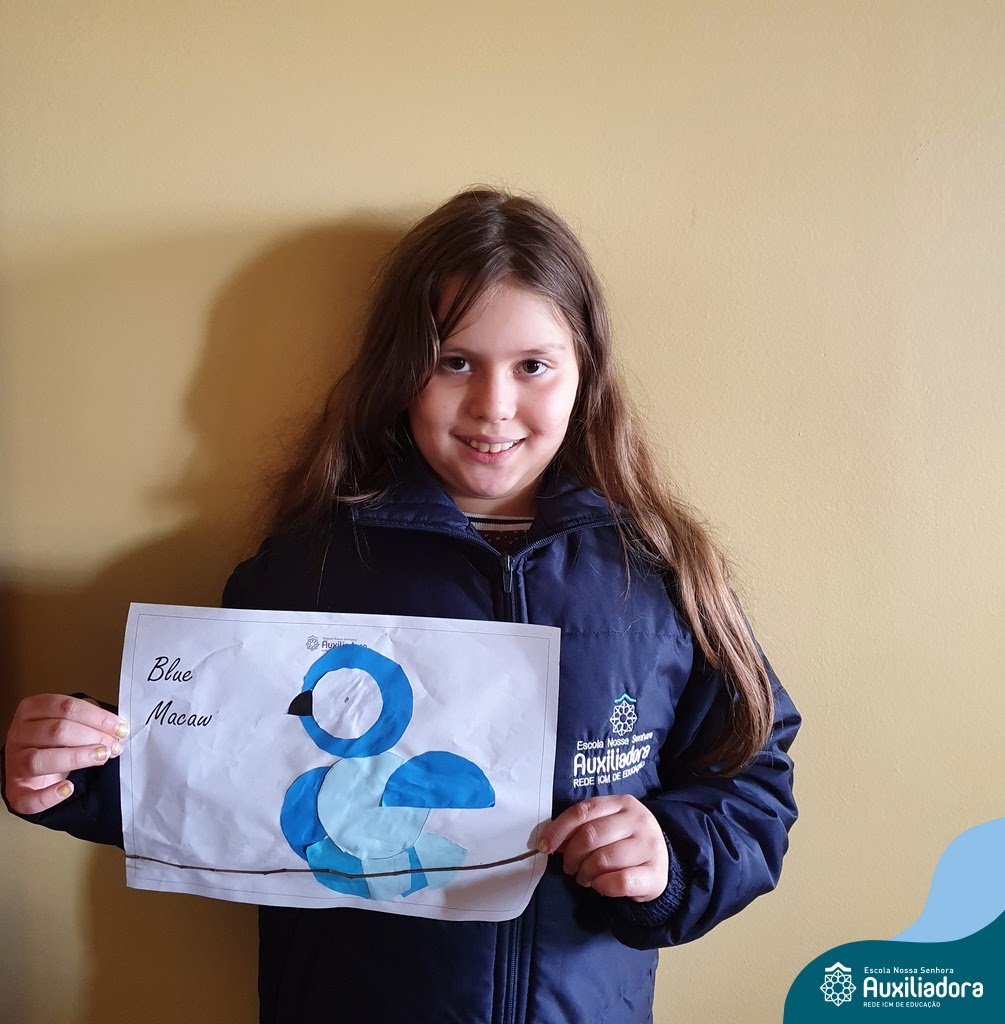 Por fim, como forma de produção de conhecimento, os alunos realizaram uma colagem simbolizando a Blue Macaw, pássaro brasileiro, de beleza ímpar e que merece proteção.
