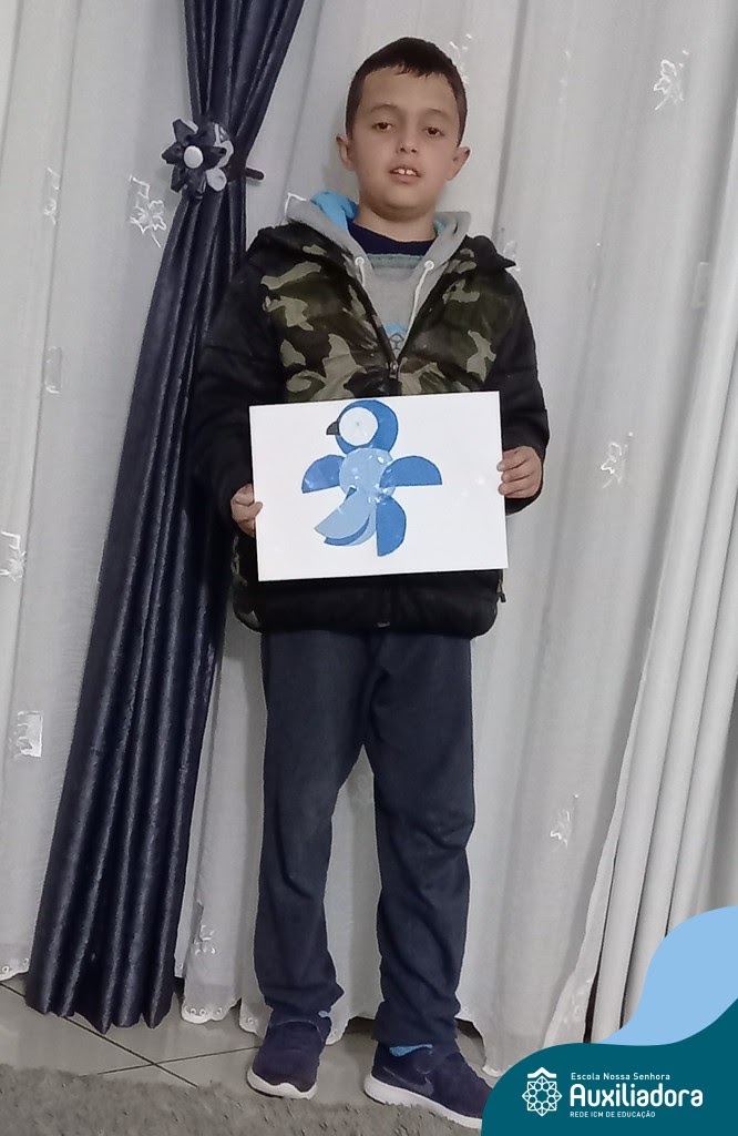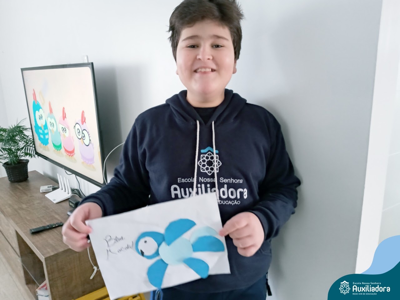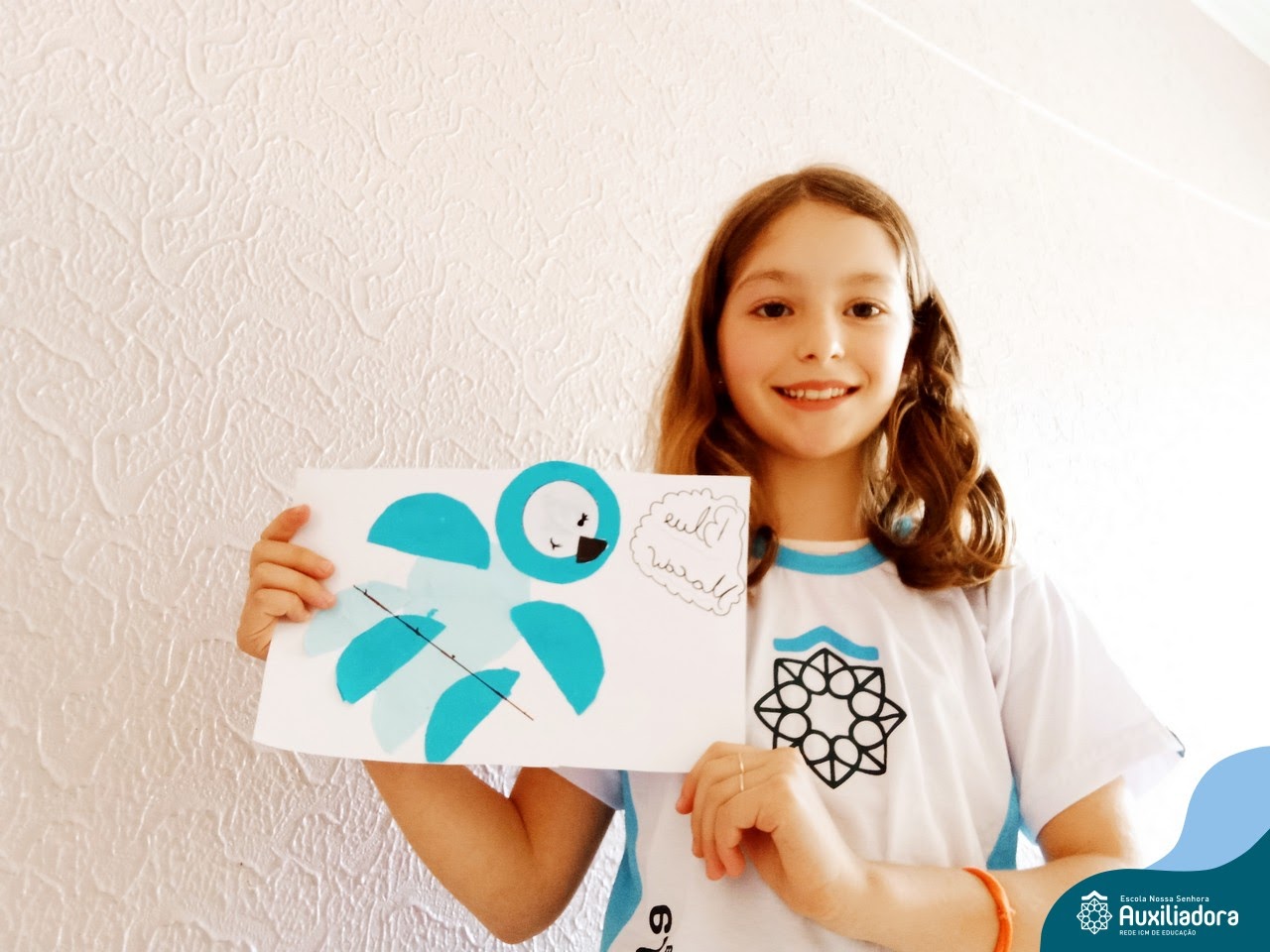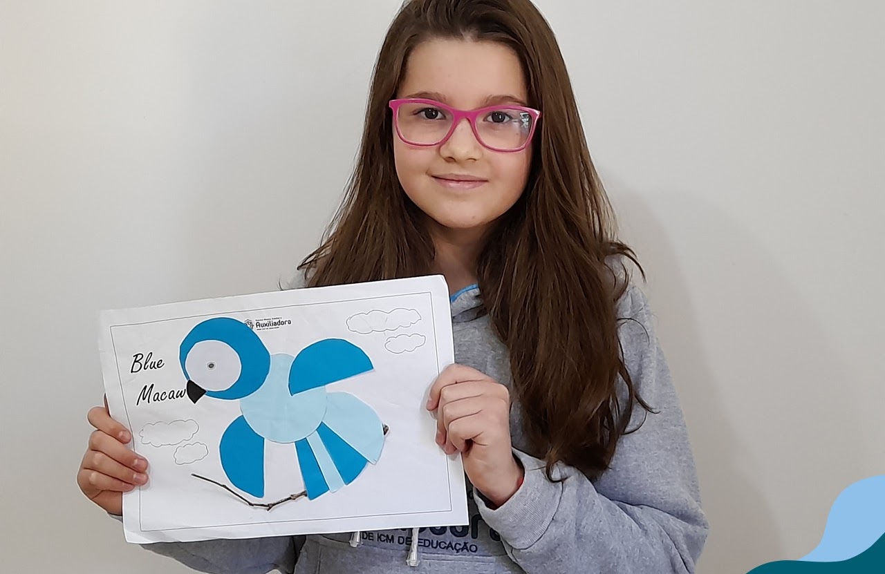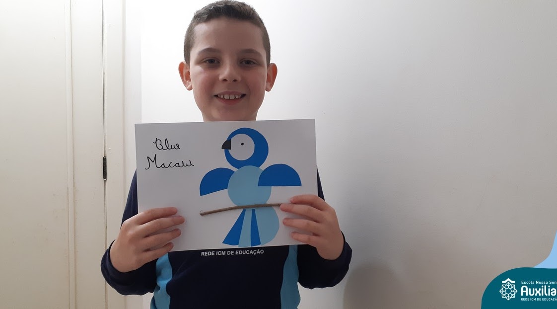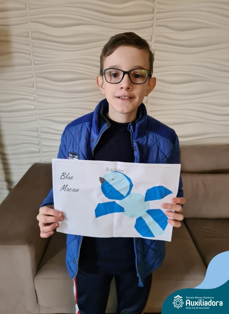 Por fim, como forma de produção de conhecimento, os alunos realizaram uma colagem simbolizando a Blue Macaw, pássaro brasileiro, de beleza ímpar e que merece proteção.
