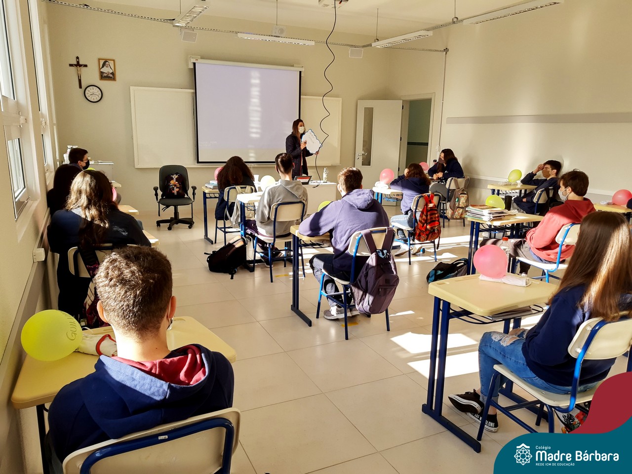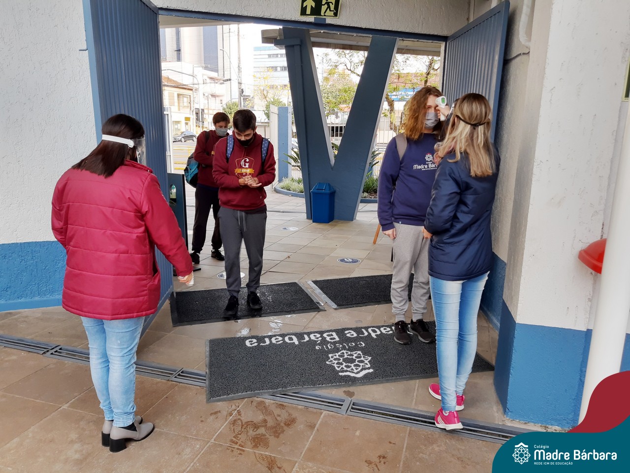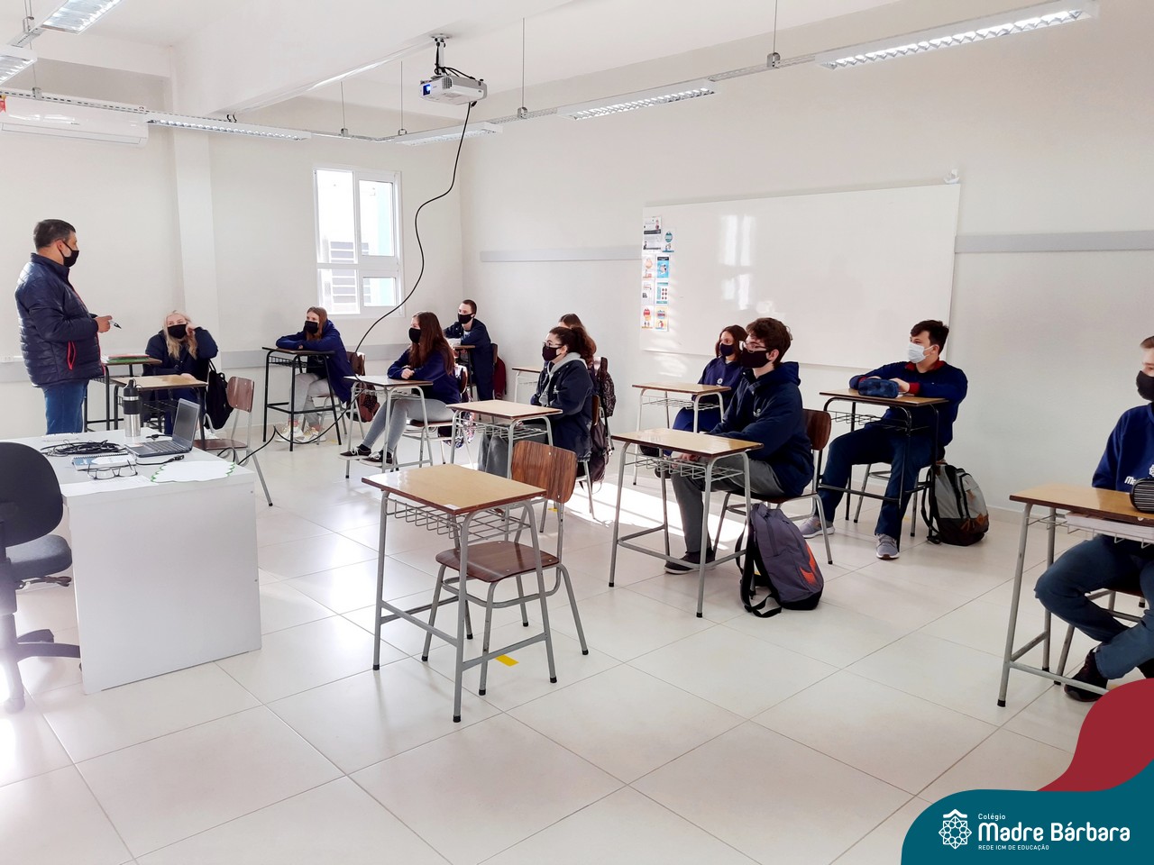 Lajeado (RS) | Nesta segunda-feira (21) o Colégio Madre Bárbara – Rede ICM retornou com as aulas presenciais das turmas de Ensino Médio. Com todos os protocolos, medidas e cuidados de higiene e segurança, 85 jovens estão retornando para a escola. Destes, farão revezamento em dois grupos (A – semana 1 e B – semana 2), preenchendo 50% da capacidade da sala. O Colégio conta com equipes responsáveis pelo fluxo de entrada e saída, com checklist de aferição da temperatura, conferência do uso correto de máscaras, higienização dos pés no tapete sanitizante e limpeza das mãos com álcool gel. Além disso, os corredores do Colégio e as salas estão com todas as sinalizações de distanciamento e segurança.