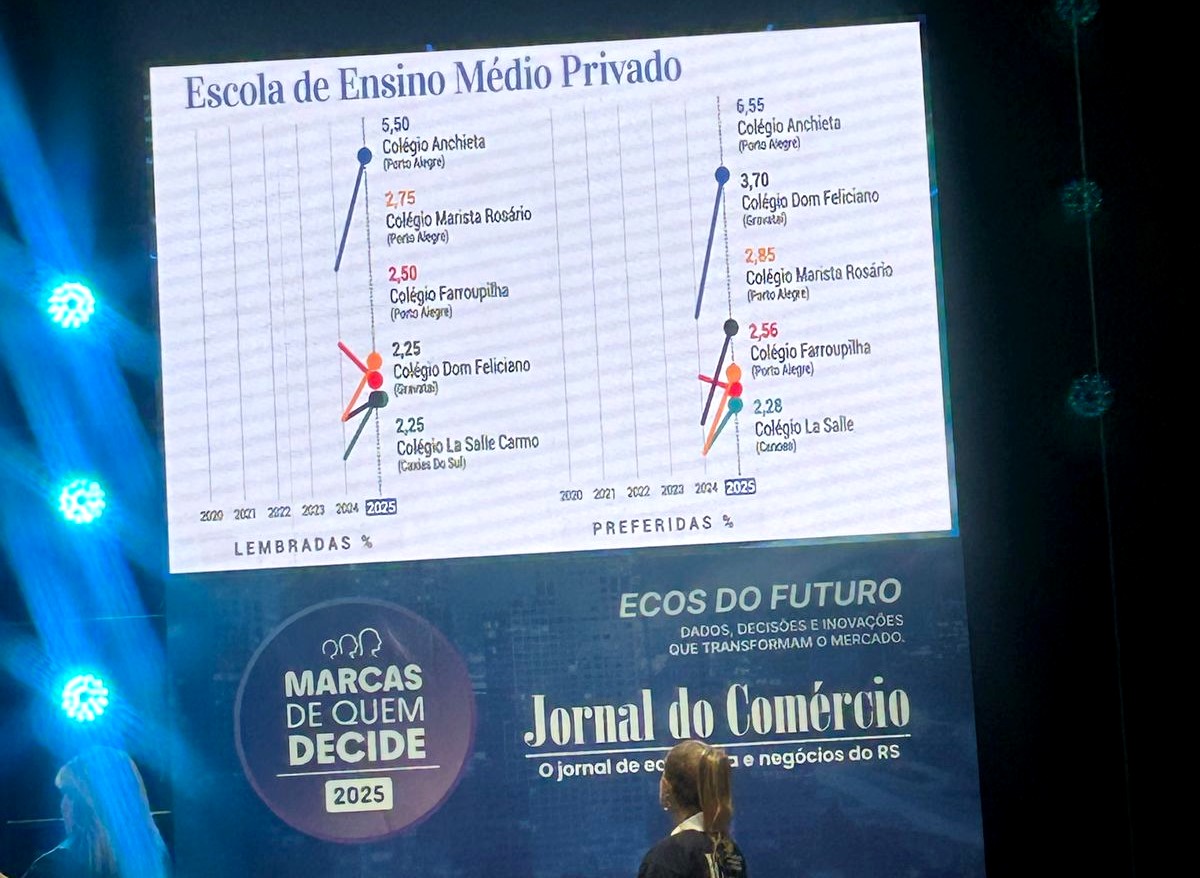 Na categoria Escola de Ensino Médio Privado, o Colégio Dom Feliciano obteve um desempenho notável mais uma vez. No quesito “Mais Lembrada”, ficou em quarto lugar, enquanto na categoria “Preferida” alcançou a segunda posição, confirmando o crescimento da instituição na lembrança e preferência do público.