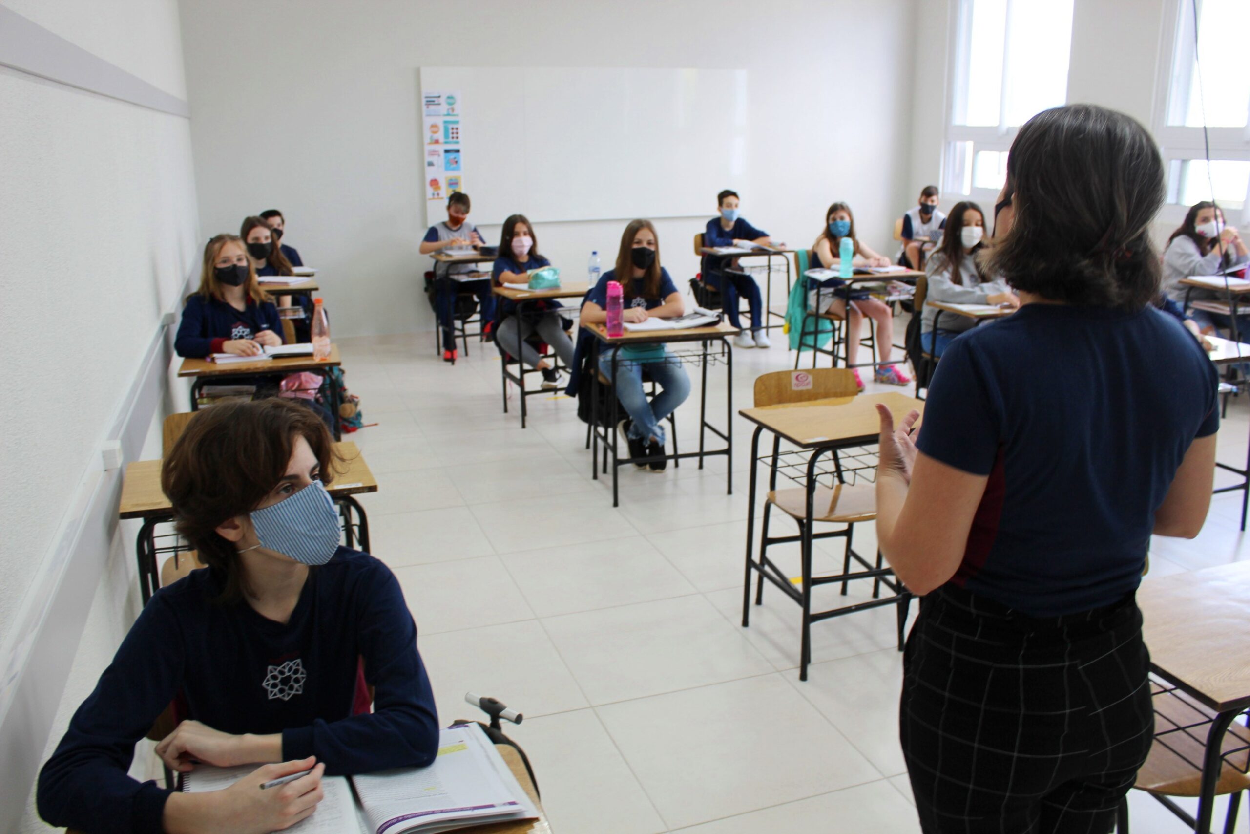 Lajeado/RS – Nesta quarta-feira (28) o Colégio Madre Bárbara – Rede ICM retornou com as aulas presenciais das turmas de 6º a 9º ano do Ensino Fundamental – Anos Finais. Com todos os protocolos, medidas e cuidados de higiene e segurança, 114 estudantes estão retornando para a escola. As turmas que voltaram para o presencial e ultrapassarem a capacidade física, farão revezamento em dois grupos (A – semana 1 e B – semana 2), preenchendo 50% do espaço da sala de aula. Os alunos que permanecem em casa terão as aulas remotas síncronas com a aula presencial.