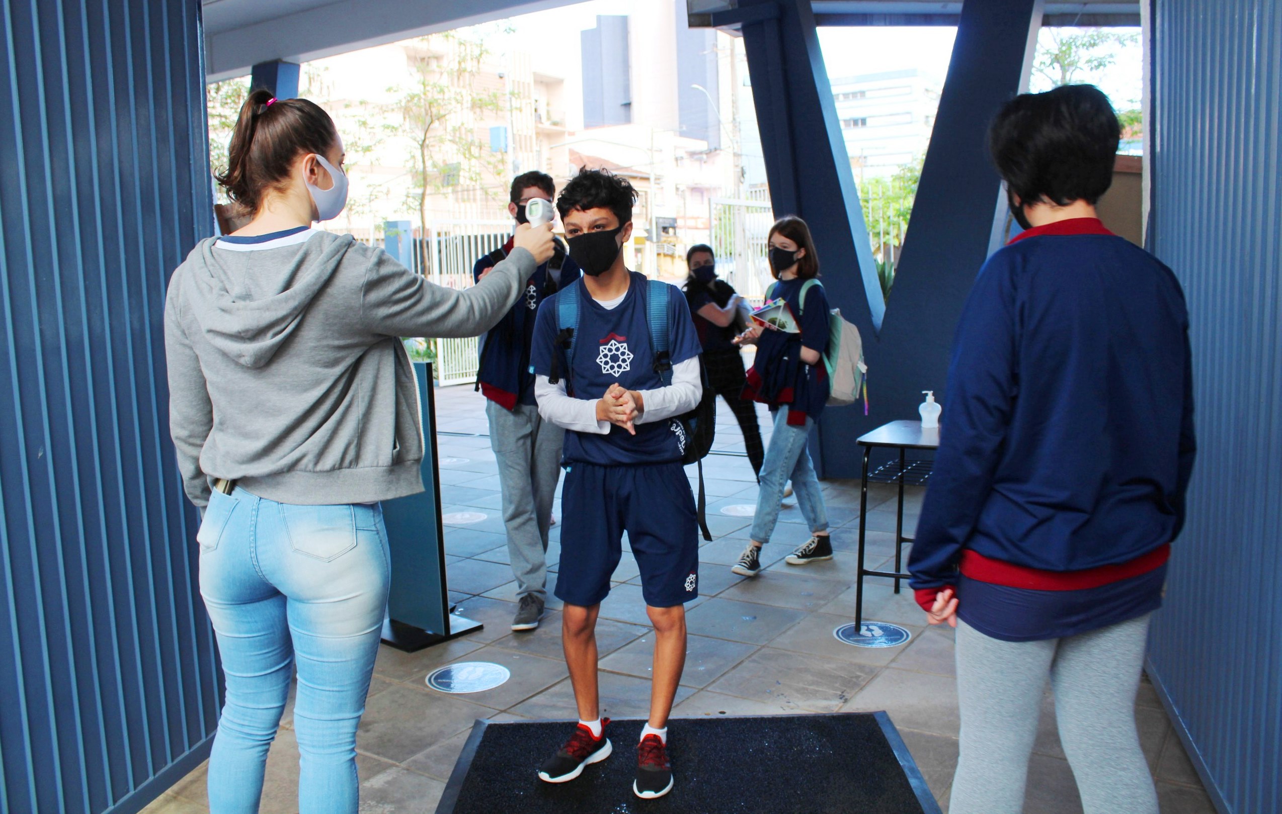 O Colégio conta com equipes responsáveis pelo fluxo de entrada e saída, com checklist de aferição da temperatura, conferência do uso correto de máscaras, higienização dos pés no tapete sanitizante e limpeza das mãos com álcool gel. Além disso, os corredores do Colégio e as salas estão com todas as sinalizações de distanciamento e segurança.