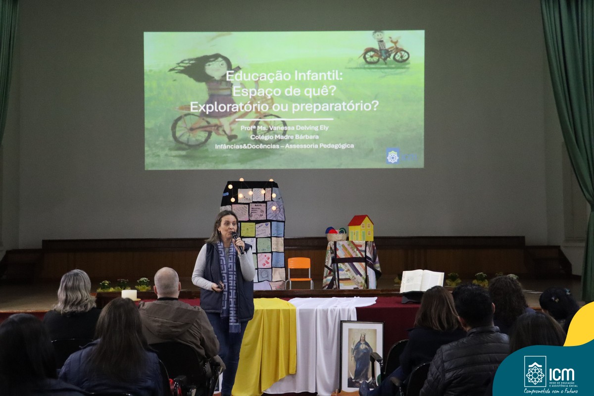 Na parte da manhã, os professores acompanharam uma formação geral conduzida pela especialista Vanessa Ely, do Colégio Madre Bárbara, de Lajeado (RS), que abordou o tema “Educação Infantil: espaço de quê? Exploratório ou preparatório?”. Já no turno da tarde, os educadores participaram de oficinas práticas que aprofundaram temas fundamentais para a ação pedagógica, como letramento e numeramento, produção textual, iniciação científica, musicalização, corporeidade, documentação pedagógica, mundo bilíngue e ensino religioso.
