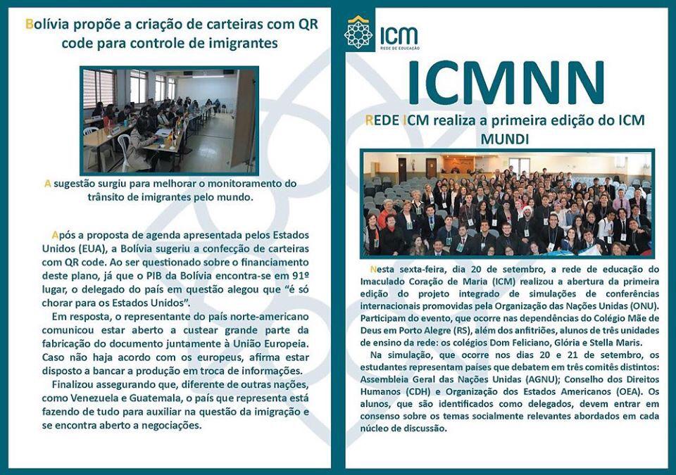 O I ICM Mundi foi acolhido pelo Colégio Mãe de Deus, de Porto Alegre/RS. A Diretora da unidade, Irmã Sueli Rosane Gonzatti, elogiou o evento pela habilidade que desenvolve em cada alunos: “Esta é uma experiência única. Que este evento desperte nos alunos o desejo de querer saber mais, de serem protagonista em suas realidades. Acredito que nesse modelo de simulação para transformar vidas, por isso, vejo o ICM Mundi com esperança e alegria. Aqui, cada um está construindo novos conhecimentos, desenvolvendo novas habilidades e sendo autores de novos caminhos, sobretudo, diante de tantos problemas que assolam o país e o mundo, com respeito, ética e responsabilidade, primando pela vida e pela ética” disse a diretora.