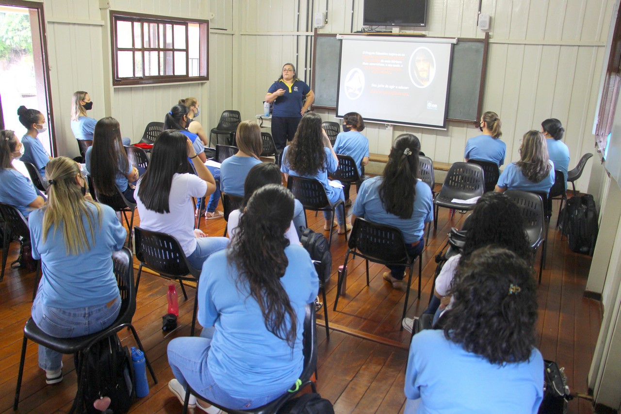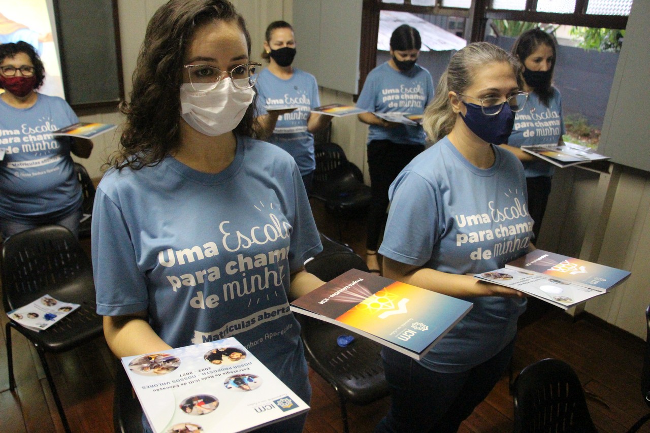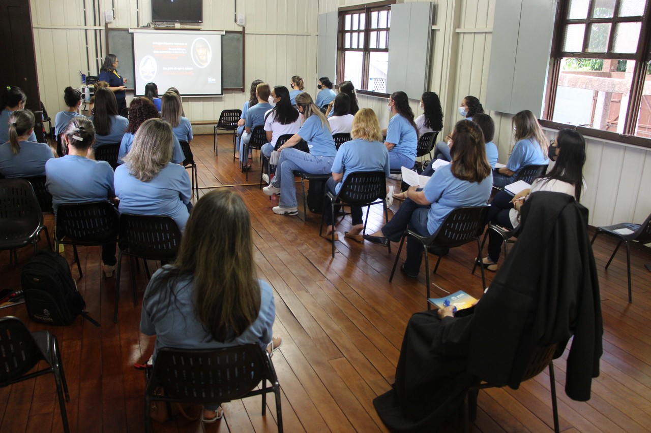 Tanto o Projeto Educativo como a Proposta de Valor tiveram seus conteúdos apresentados pela assessora pedagógica da Rede ICM, professora Lenir Moraes. Em seguida, cada educadora recebeu um exemplar e um botton da instituição.