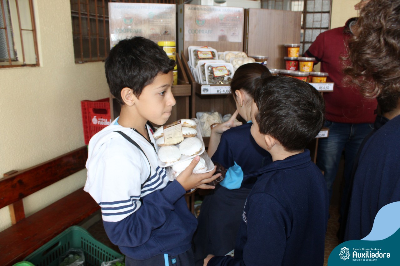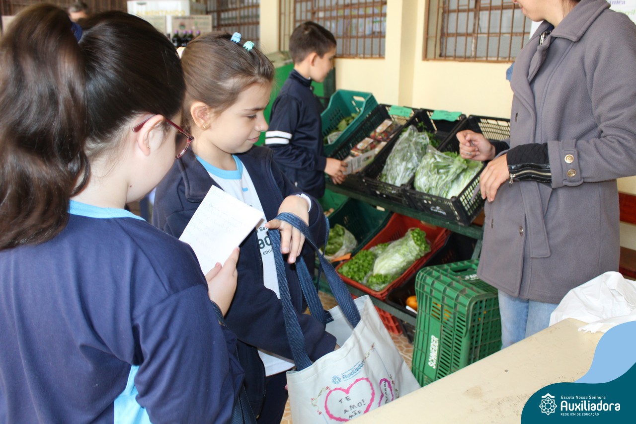 Lições de alimentação saudável, educação financeira e ecologia na feira da Escola Auxiliadora