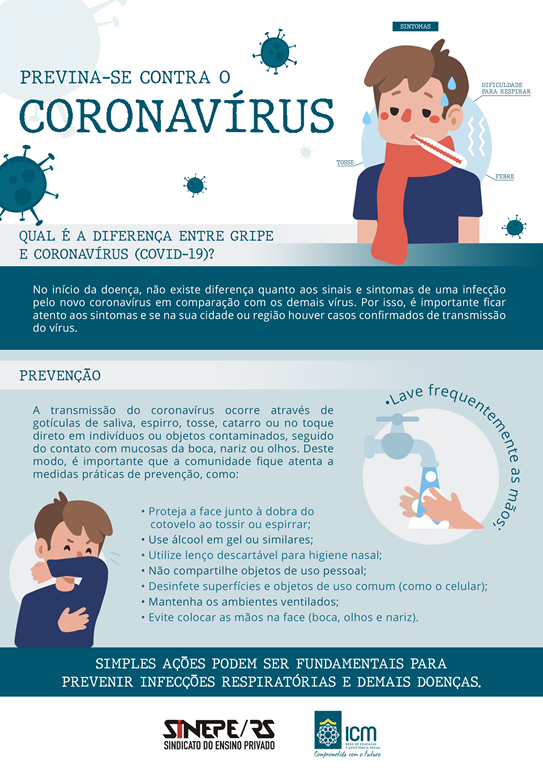 Seguindo orientações disponibilizadas pelo Sindicato do Ensino Privado do Rio Grande do Sul, o SINEPE/RS, e o Serviços Especializados em Engenharia de Segurança e em Medicina do Trabalho (SESMT) da Rede ICM, foi produzido cartaz com as seguintes orientações: