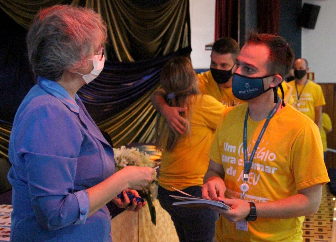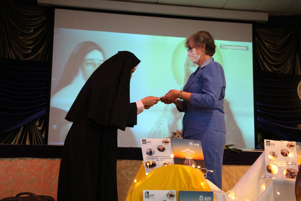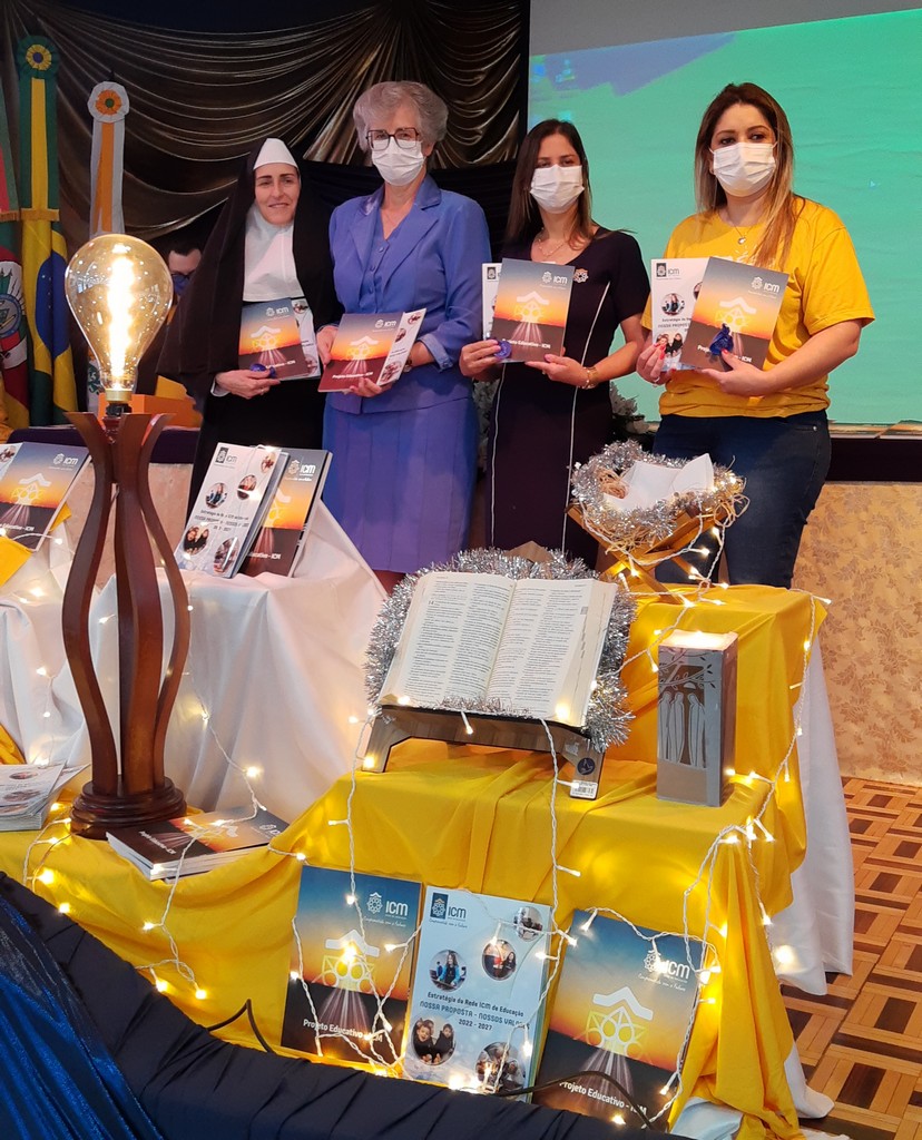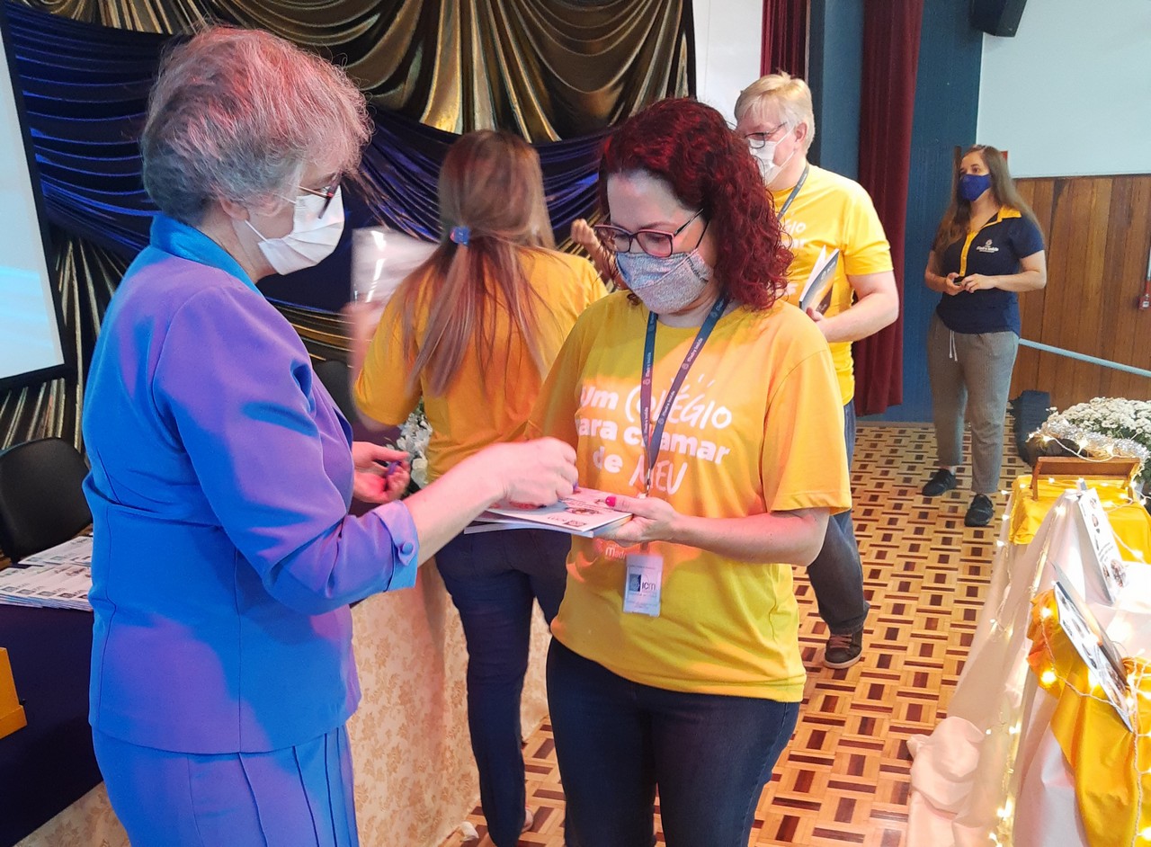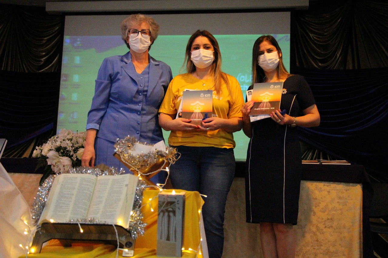 A Diretora, Irmã Claire, e a vice-diretora, professora Vanessa Rodrigues, foram as primeiras a receberem os exemplares do Projeto Educativo e da Proposta de Valor. A entrega foi feita pela Irmã Elenar Luisa Berghahn, coordenadora do Setor Educação. Depois, os educadores também receberam seus exemplares e um botton da Rede ICM.