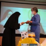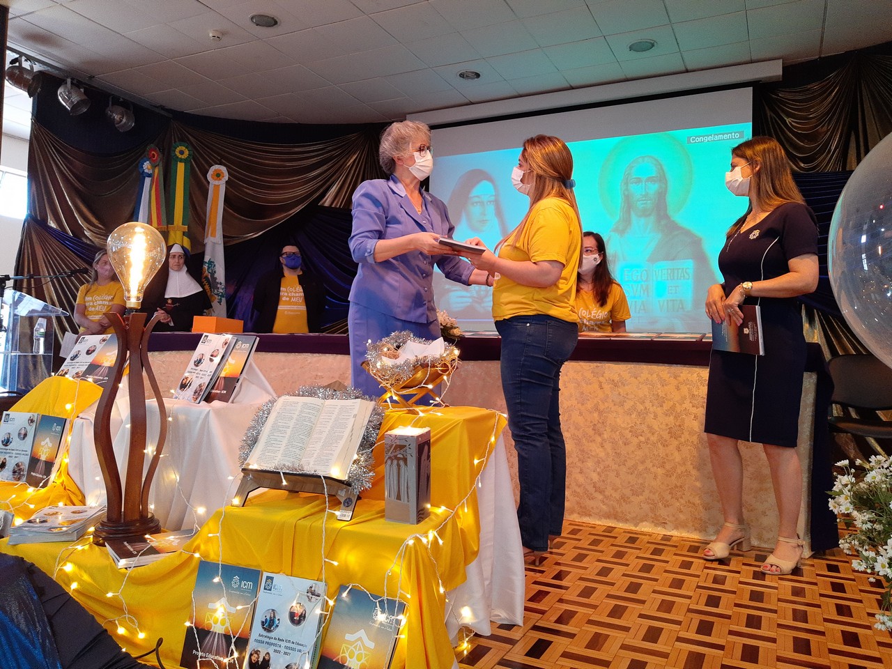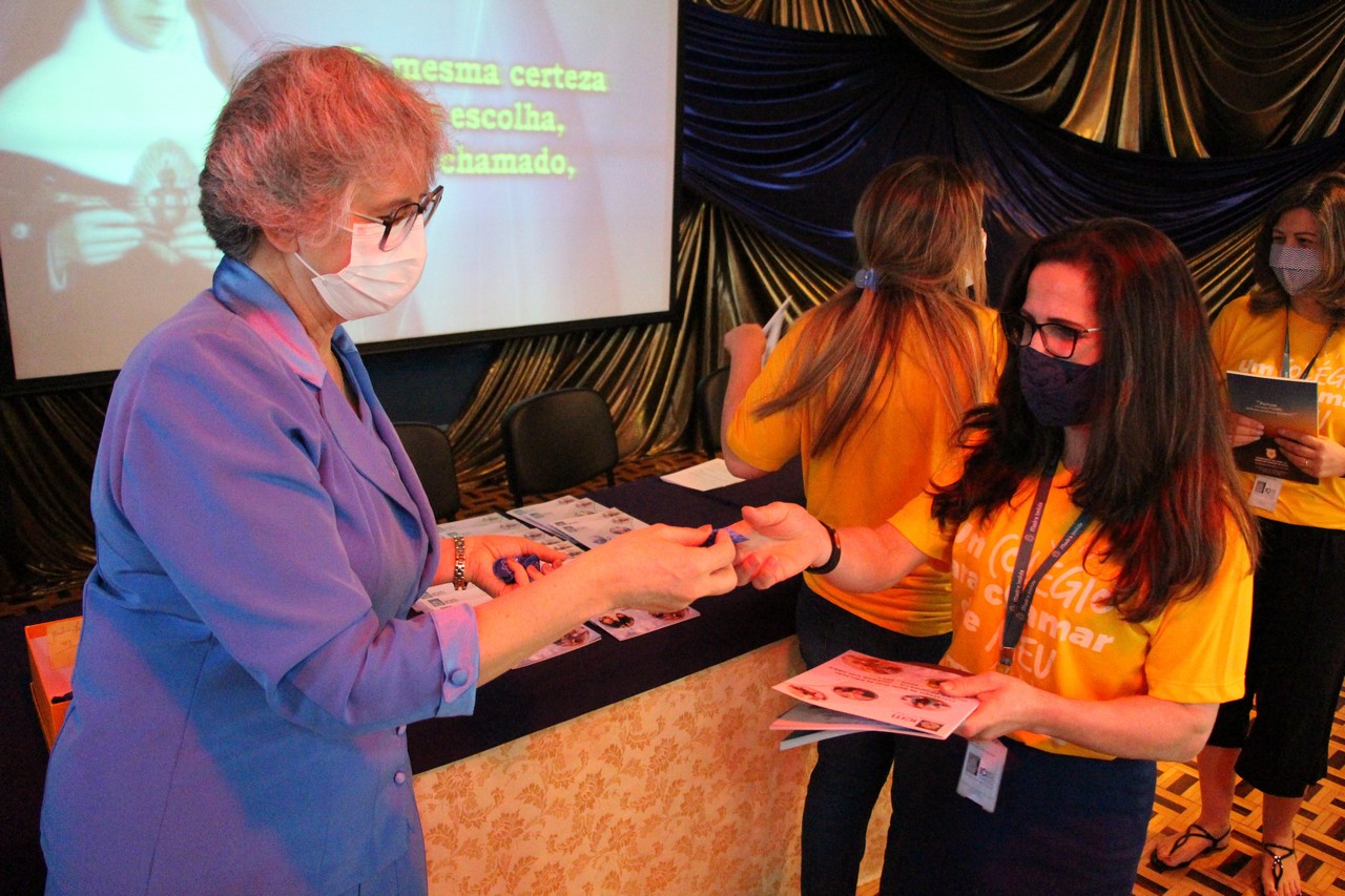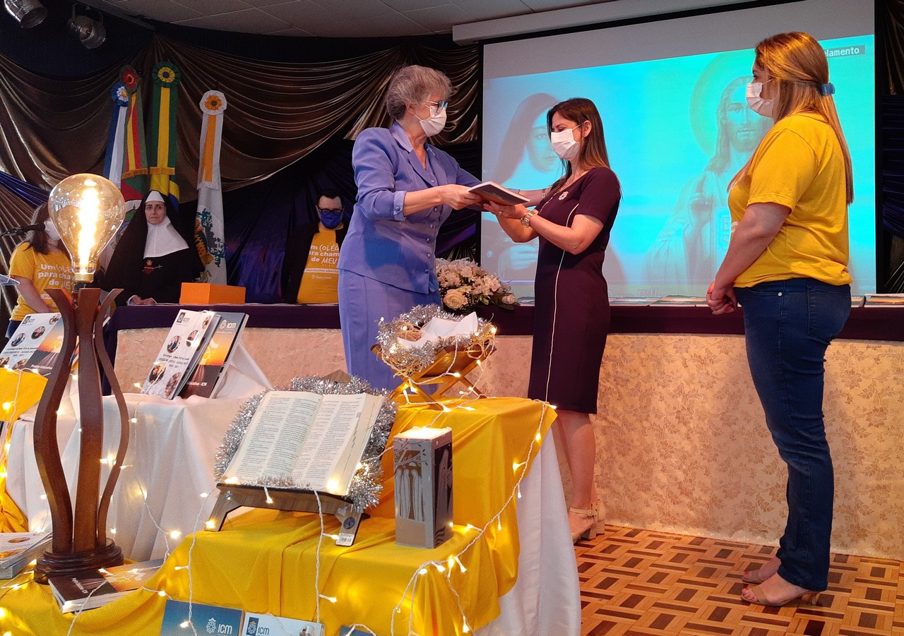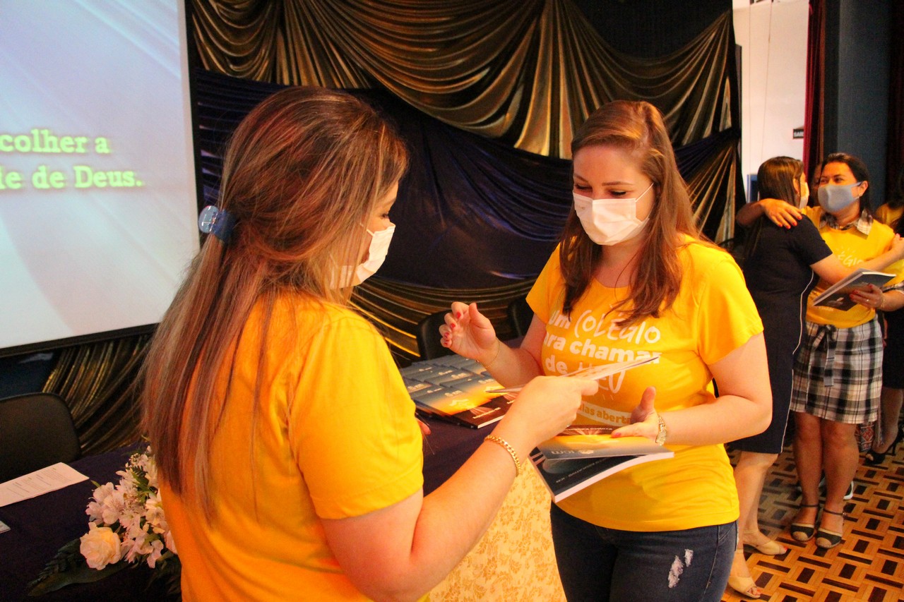 A Diretora, Irmã Claire, e a vice-diretora, professora Vanessa Rodrigues, foram as primeiras a receberem os exemplares do Projeto Educativo e da Proposta de Valor. A entrega foi feita pela Irmã Elenar Luisa Berghahn, coordenadora do Setor Educação. Depois, os educadores também receberam seus exemplares e um botton da Rede ICM.
