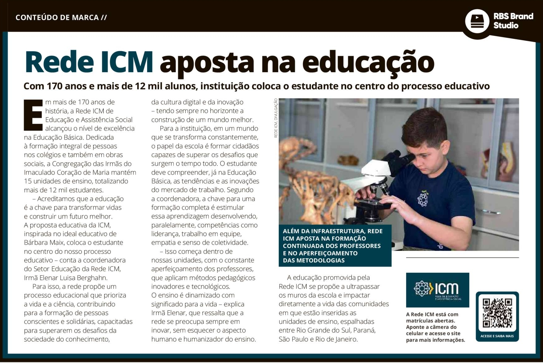 A Rede ICM é destaque no caderno “Guia da Escola”, do Jornal Zero Hora desta segunda-feira, 16 de outubro. O conteúdo de marca detalha a proposta educativa ICM que une conhecimento e vida e impacta na formação dos mais de 12 mil estudantes. A publicação traz com declarações da Irmã Elenar Luisa Berghahn, coordenadora do Setor Educação. A íntegra da publicação está disponível no stories.