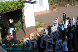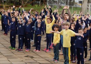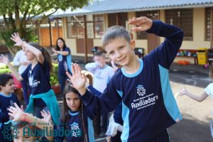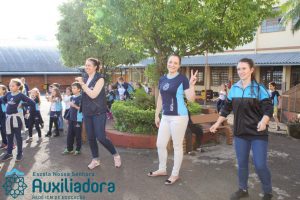 Na Escola Nossa Senhora Auxiliadora, de Frederico Westphalen (RS), os alunos da educação infantil e fundamental 1 participaram de atividade coletiva no pátio da unidade de ensino. Atividades como Alongamento, brincadeiras e esportes não deixou ninguém sem movimentação.