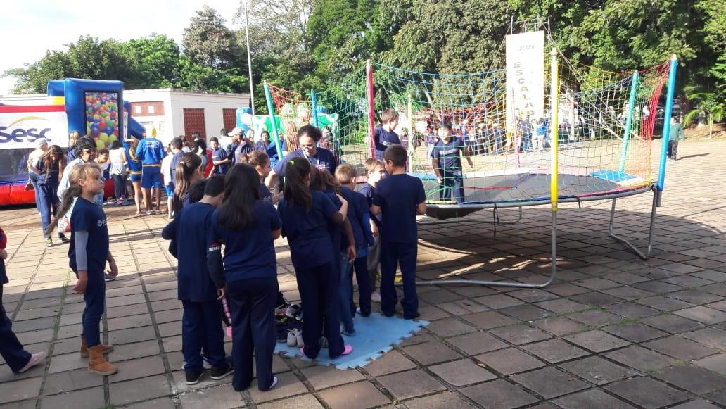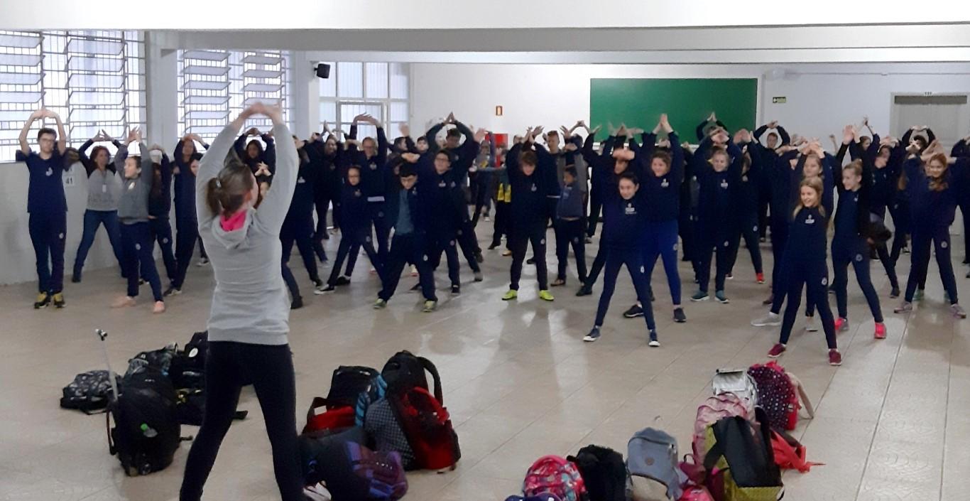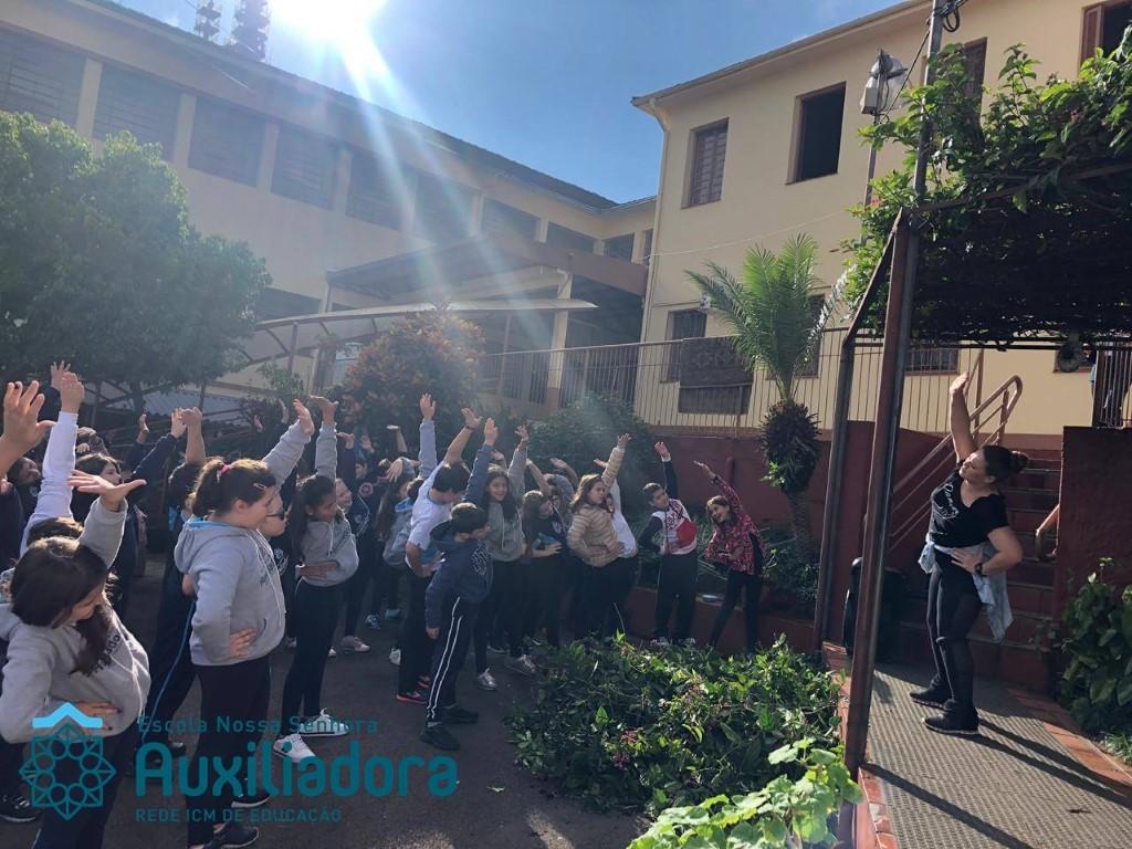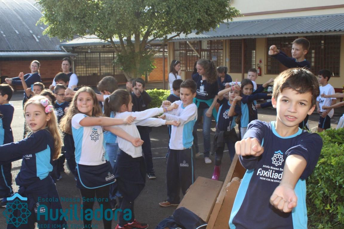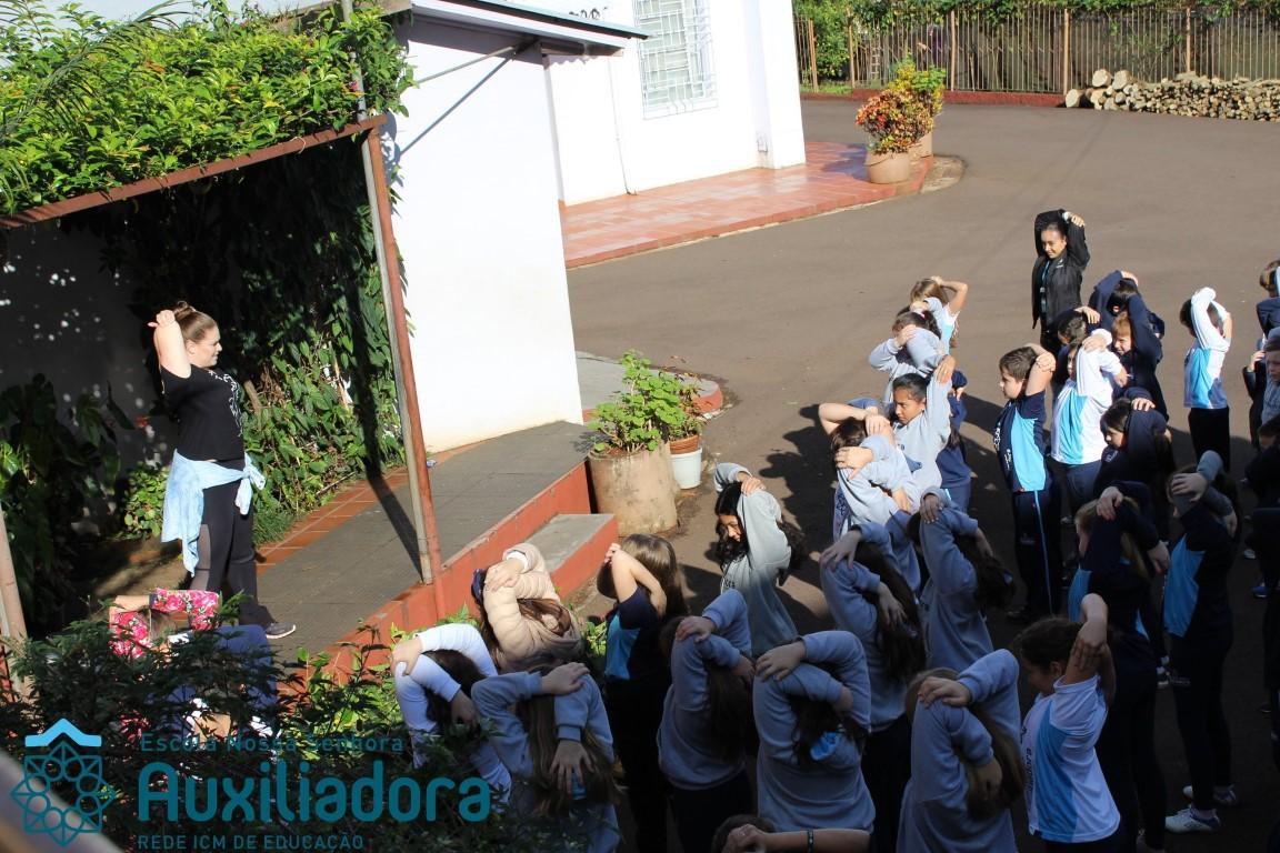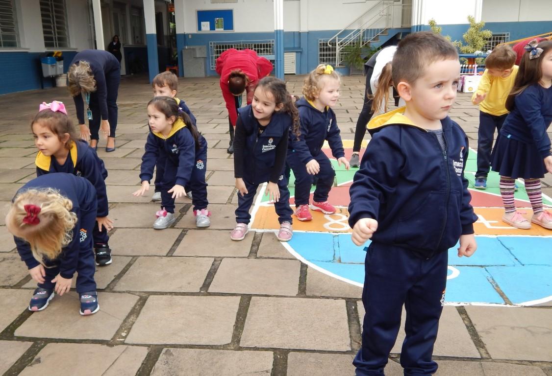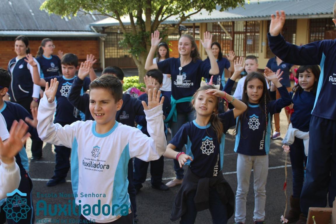 Na Escola Nossa Senhora Auxiliadora, de Frederico Westphalen (RS), os alunos da educação infantil e fundamental 1 participaram de atividade coletiva no pátio da unidade de ensino. Atividades como Alongamento, brincadeiras e esportes não deixou ninguém sem movimentação.