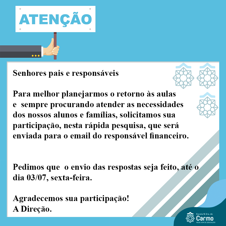 Apesar da publicação no diário oficial do município do Rio de Janeiro, em 29/06/2020, segunda-feira, estamos comunicando que NÃO retornaremos às aulas presenciais, no mês de julho.