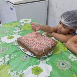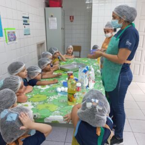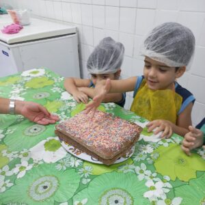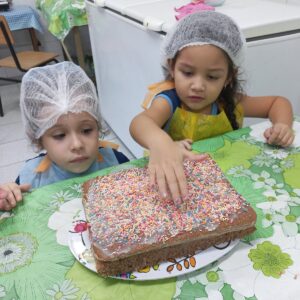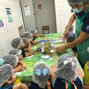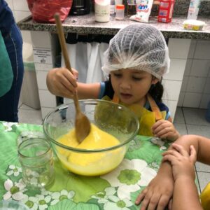 Seguindo uma receita junto às professoras, os pequenos puderam experimentar a construção de habilidades relacionadas à Matemática e ao Letramento.