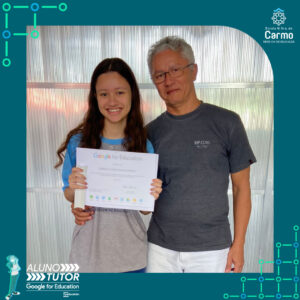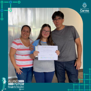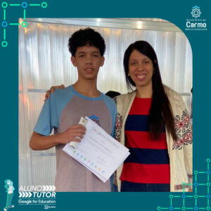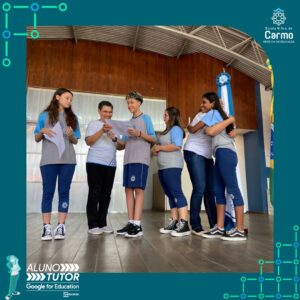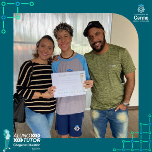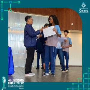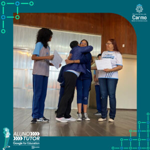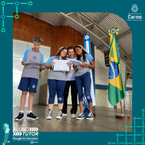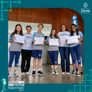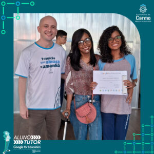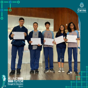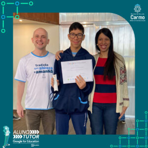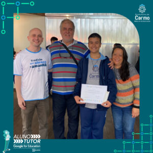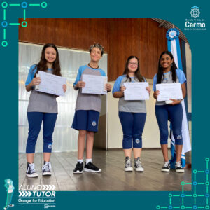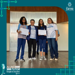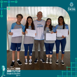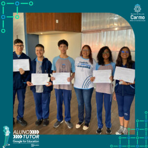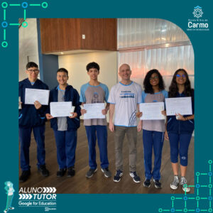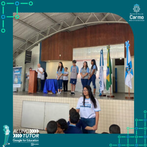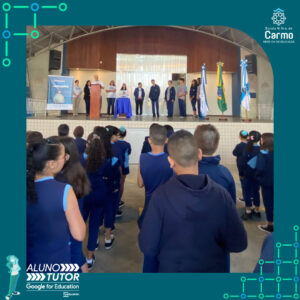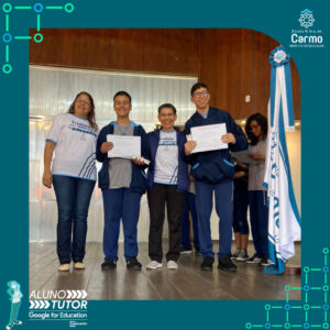 Somado a esse lindo momento, em cada turno, foram certificados os estudantes participantes do Programa Aluno Tutor Google. O Programa Aluno Tutor é uma jornada gamificada de aprendizagem das ferramentas do Google Workspace, uma proposta de projeto de intervenção na comunidade escolar baseada nos Objetivos de Desenvolvimento Sustentável.