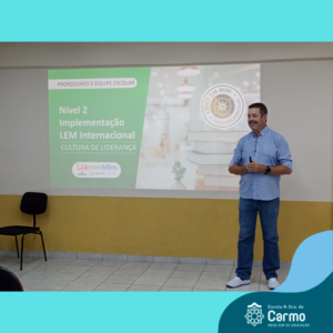E voltada especialmente para o grupo de professores, a formação na sexta-feira foi assessorada pelo representante César Rinaldi, da SOMOS Sistemas de Ensino.  O conteúdo da formação tratou do programa socioemocional “Líder em Mim” – Implementação LEM internacional: cultura de liderança. O programa estudado “é uma abordagem de transformação escolar que trata os desafios universais de aprendizado acadêmico, cultura e liderança como componentes inter-relacionados”, a fim de criar, junto a cada professor, estudante e família, no ambiente escolar, o crescimento e o fortalecimento de uma cultura de liderança.