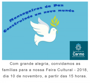 Com grande alegria, convidamos as famílias para a nossa Feira Cultural – 2018, dia 10 de novembro, a partir das 15 horas.