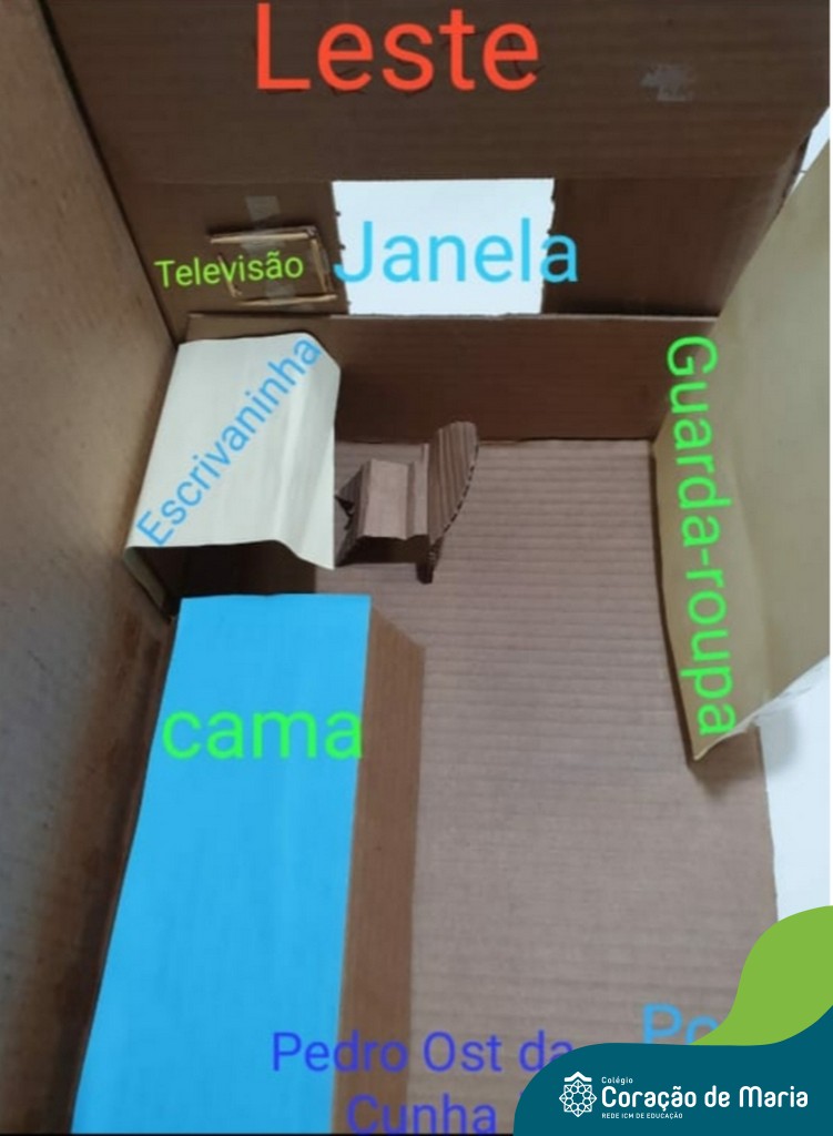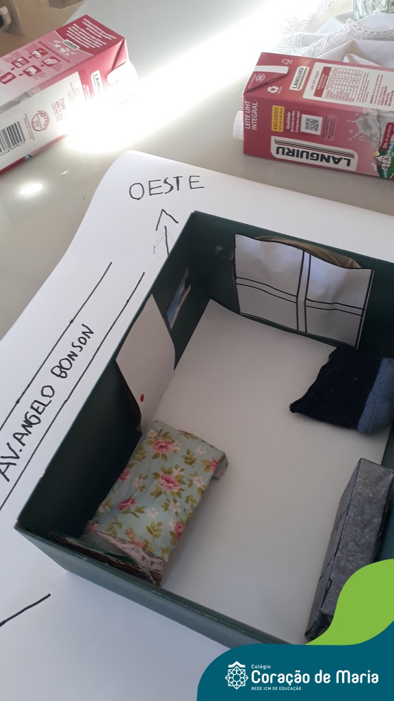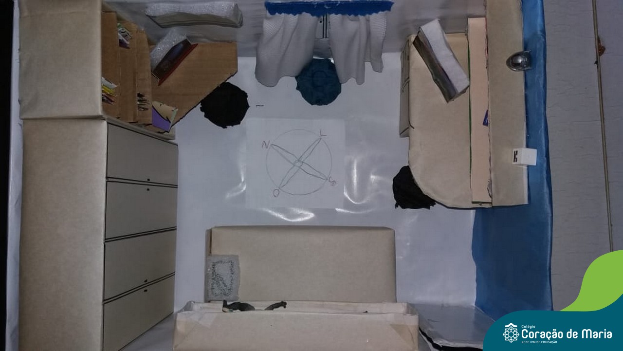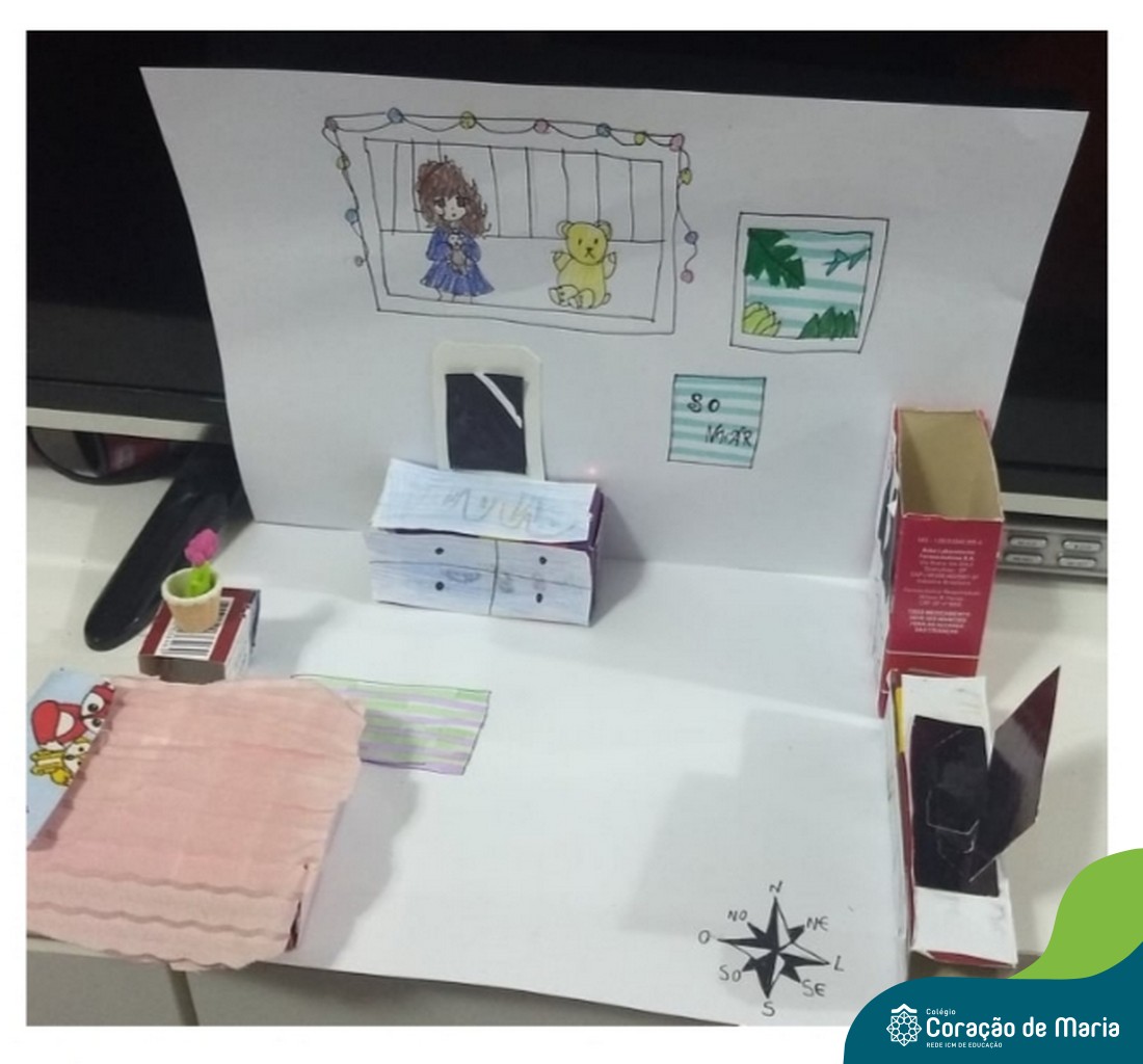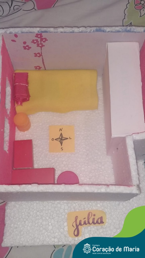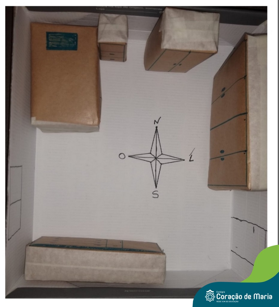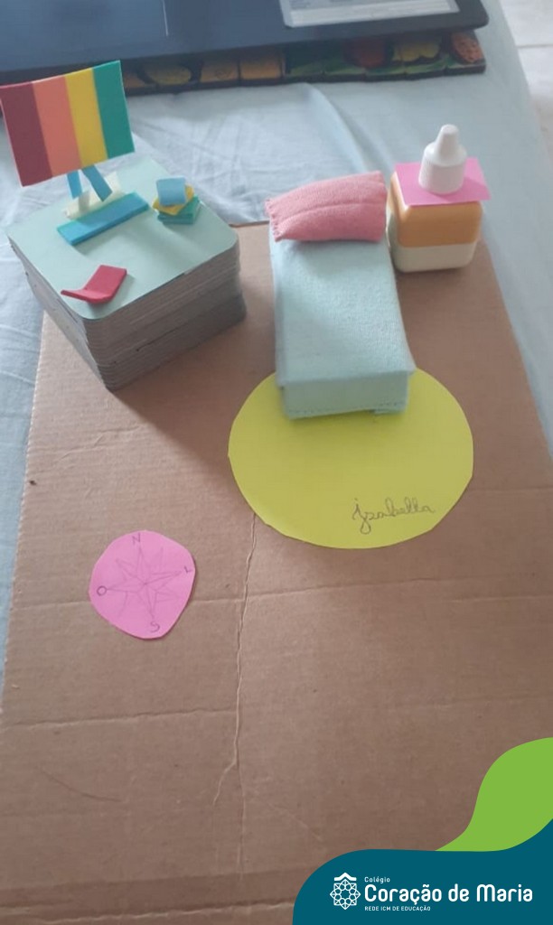 As turmas 61, 62 e 63 foram desafiados pela Professora Meliana a utilizar as representações gráficas através de maquetes e plantas, na reprodução de seus quartos. Foram utilizados os conhecimentos construídos durante as atividades domiciliares: orientação e localização, representações cartográficas, mapas, legendas. Nessas representações os alunos usaram a orientação pelo sol para indicar o ponto cardeal onde se localizava o quarto na casa, aprendendo assim a se localizar no meio onde vive.