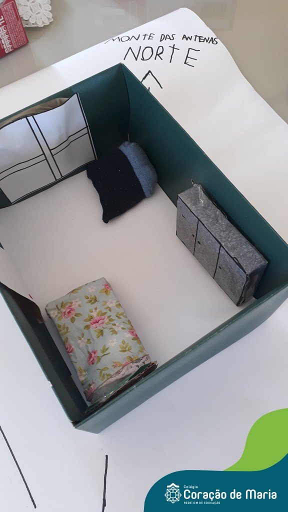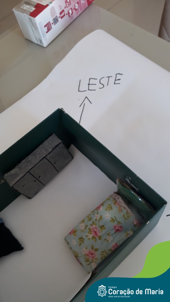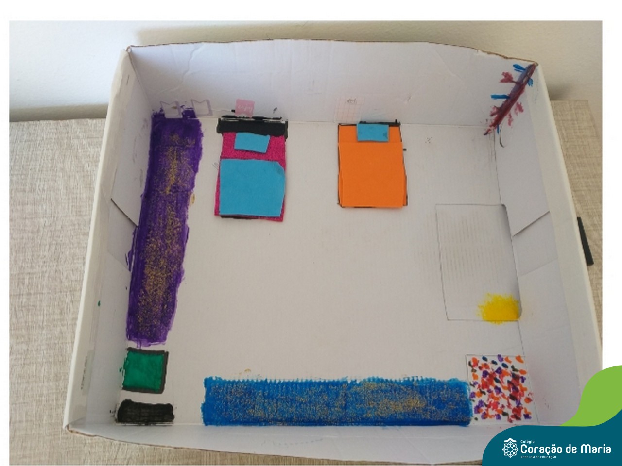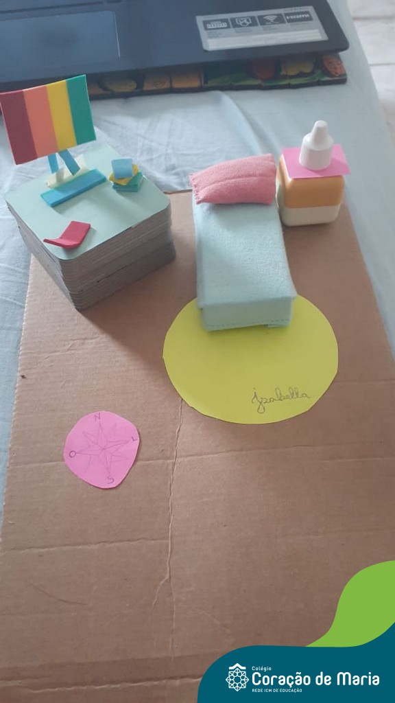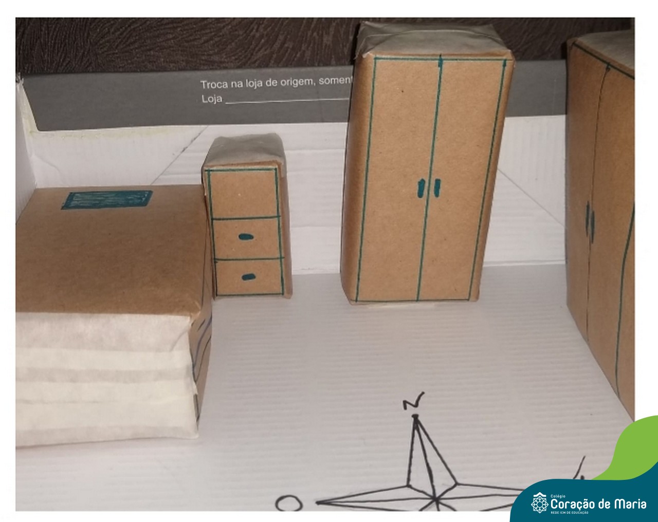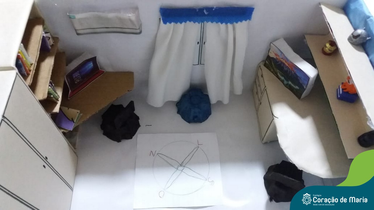 As turmas 61, 62 e 63 foram desafiados pela Professora Meliana a utilizar as representações gráficas através de maquetes e plantas, na reprodução de seus quartos. Foram utilizados os conhecimentos construídos durante as atividades domiciliares: orientação e localização, representações cartográficas, mapas, legendas. Nessas representações os alunos usaram a orientação pelo sol para indicar o ponto cardeal onde se localizava o quarto na casa, aprendendo assim a se localizar no meio onde vive.