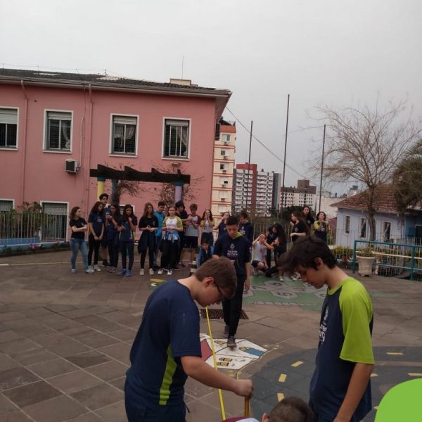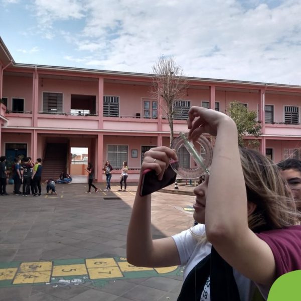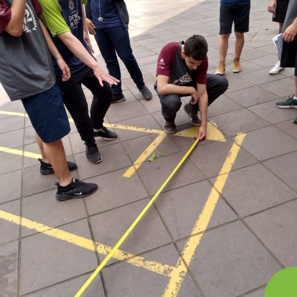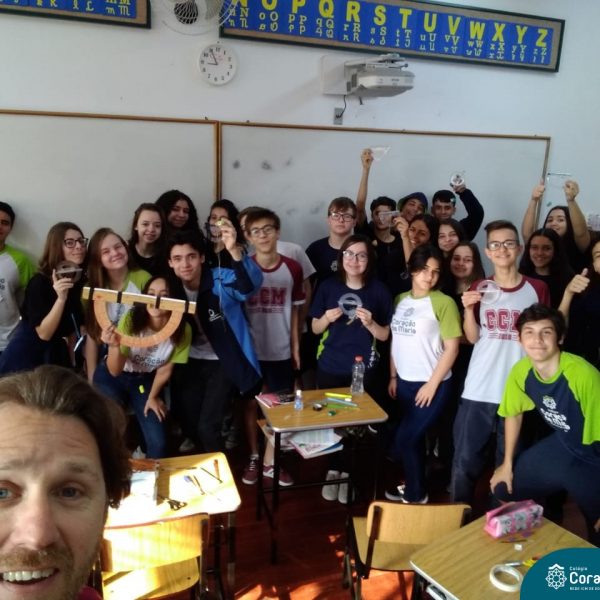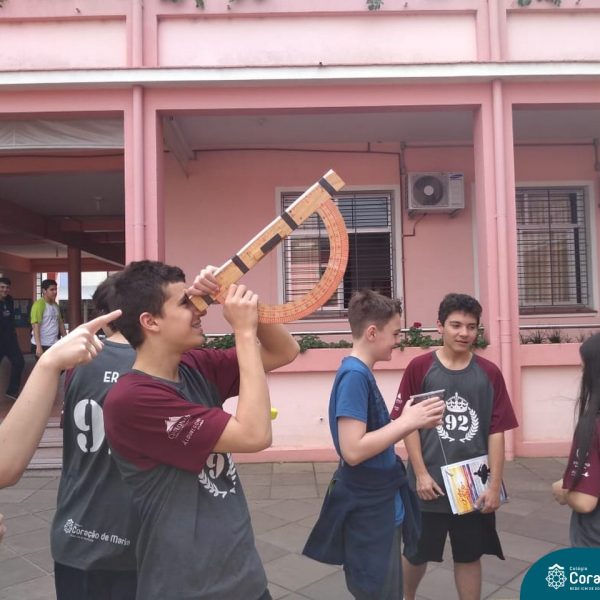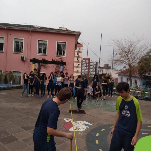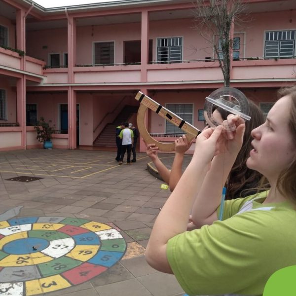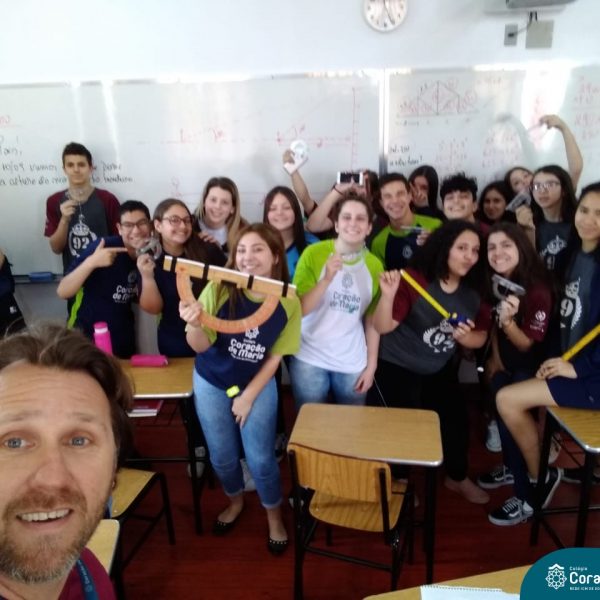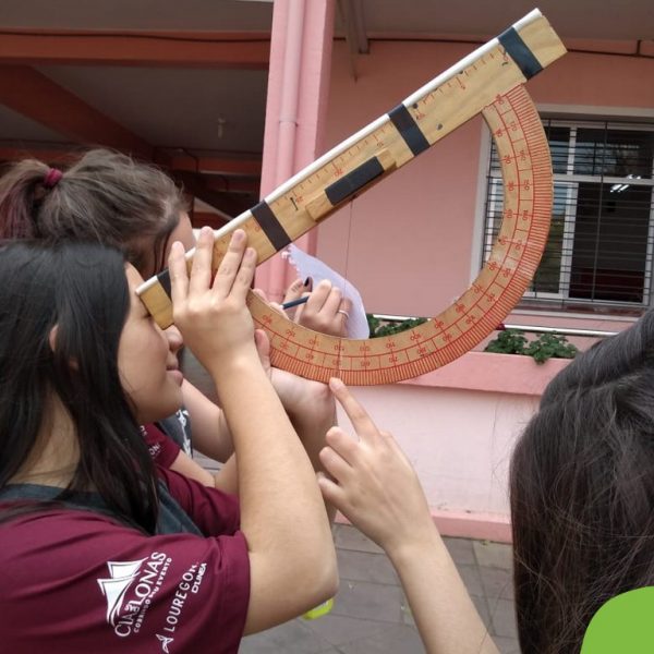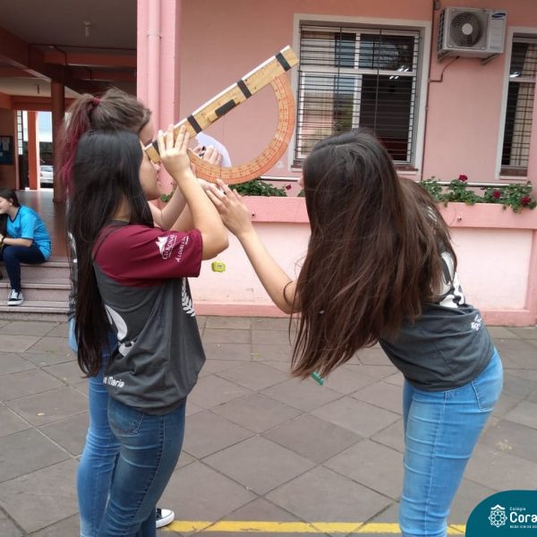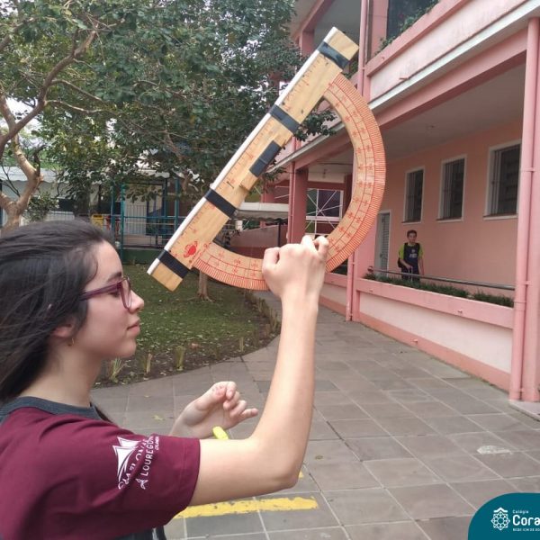 Compreender o sentido de cada nova aprendizagem é um desafio tanto para os alunos, quanto para os professores. As turmas 91 e 92 (9ºs anos do Ensino Fundamental) realizaram uma atividade prática envolvendo razões trigonométricas sob a orientação do professor André Eduardo Ventorini. Os alunos construíram um aparelho que mede ângulos e com ele calcularam a medida da altura do prédio da escola.