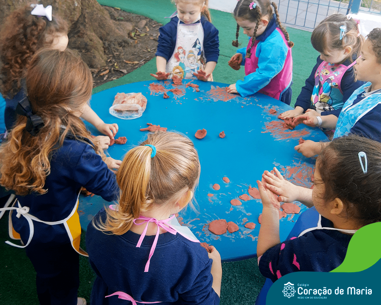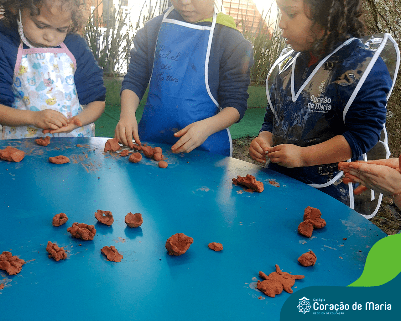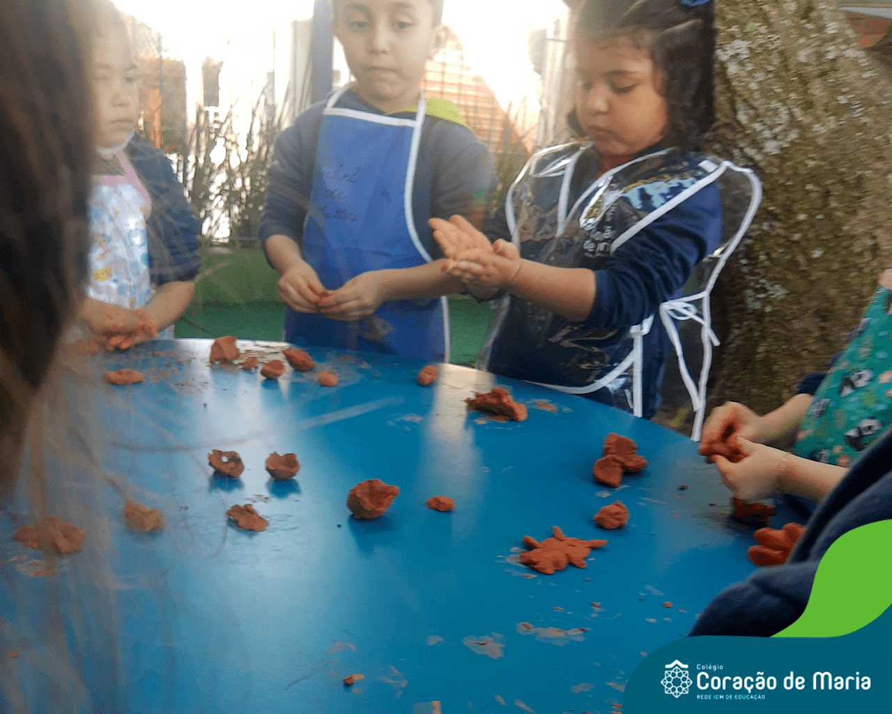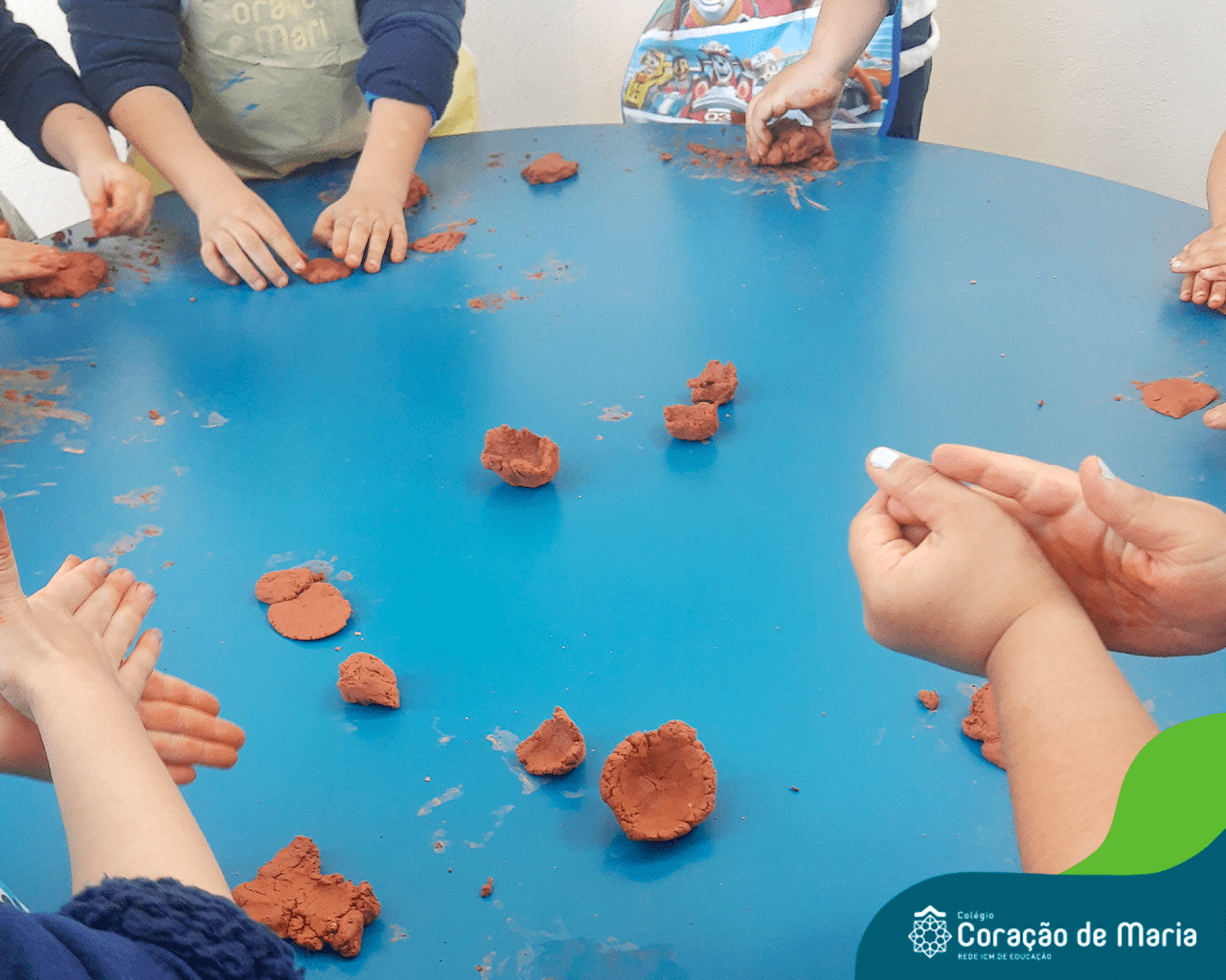 O uso da argila pelas crianças proporciona ricas experiências sensoriais, assim como possibilidades ilimitadas para modelar e dar forma aos elementos que habitam o imaginário e a realidade. Partindo da história “Cachinhos Dourados”, as crianças foram convidadas a criarem tigelas, ursos, cavernas ou demais imagens que relacionavam a história experienciada. Foi um momento de muita criatividade e alegria!