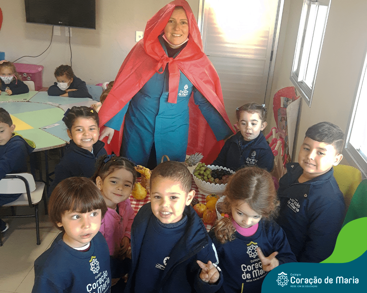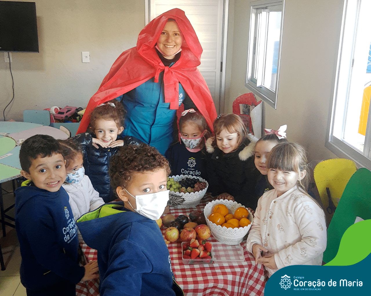 Para iniciar os estudos as professoras fizeram uma contação de história com a “chapeuzinho vermelho”, após, com propostas práticas, utilizamos variados recursos para contextualizar e relacionar as partes do corpo com os sentidos. A crianças foram convidadas a tocar, cheiras, recolher flores e folhas, tiveram contato com diferentes texturas e muitas outras descobertas.