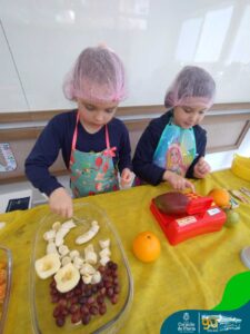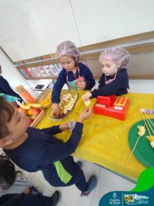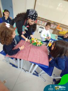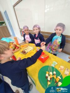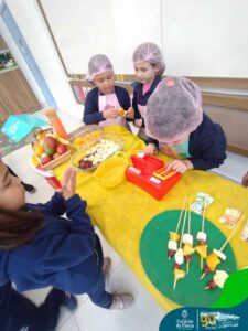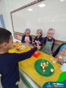 Restaurante Didático: Enquanto um grupo se ocupava na feira, outro assumia a responsabilidade de criar um cardápio surpreendente. Os ingredientes? Nada menos que produtos adquiridos na feira! O resultado final encantou os clientes com o “prato” do dia: espetinho de frutas frescas!