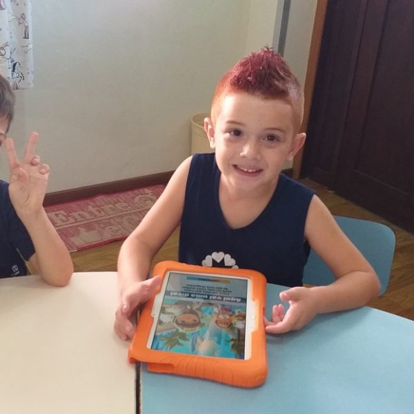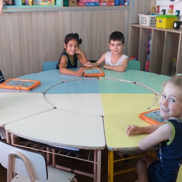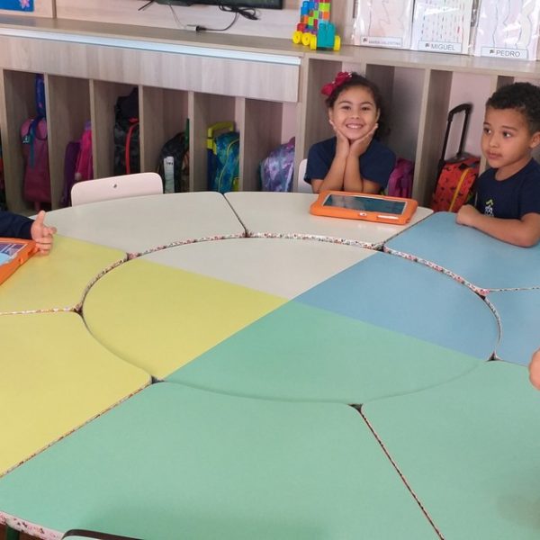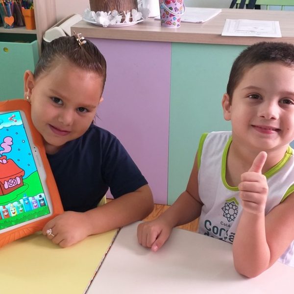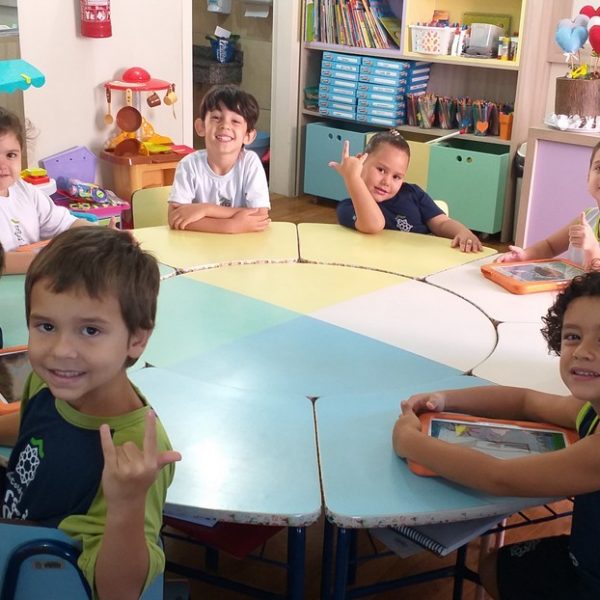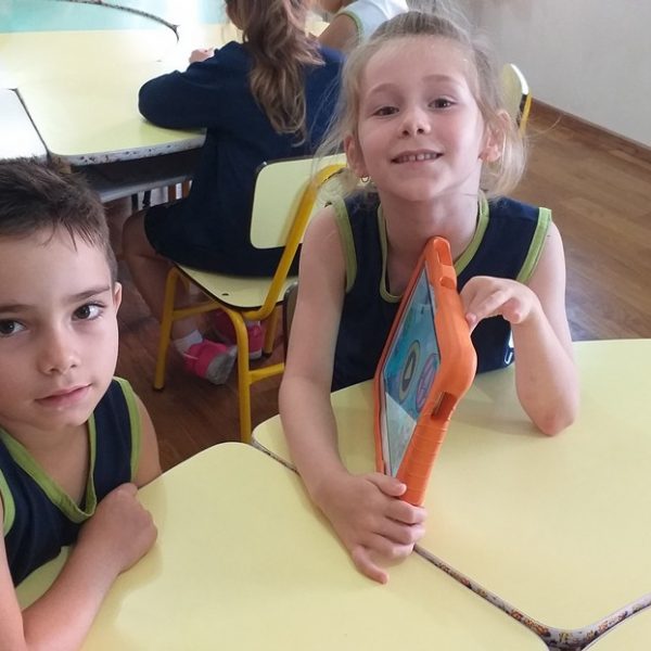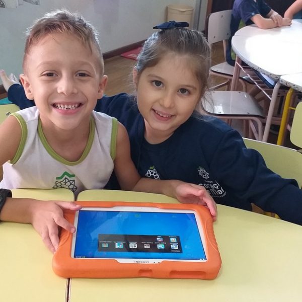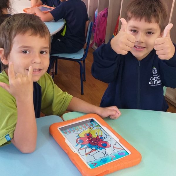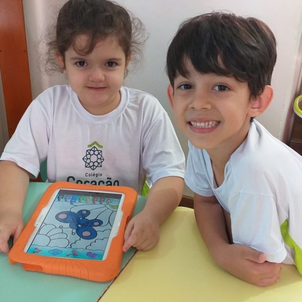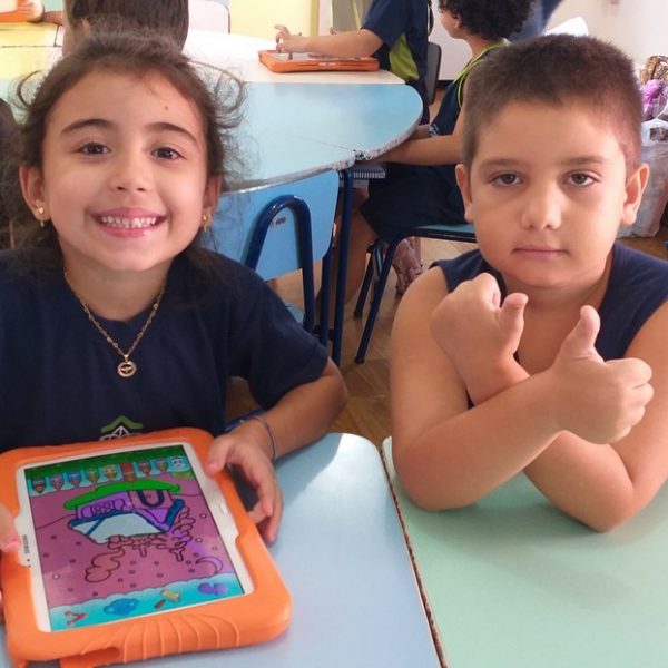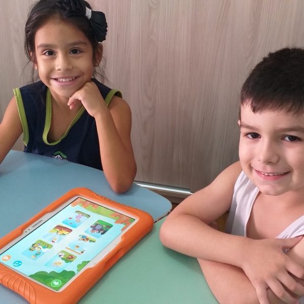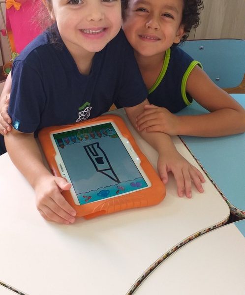Os tablets estão sendo utilizados na turma Pré 2A como complemento das atividades desenvolvidas em sala de aula, ajudando na coordenação motora, concentração, no trabalho com as letras do alfabeto e números, além de propiciar interação, integração e respeito com o outro.