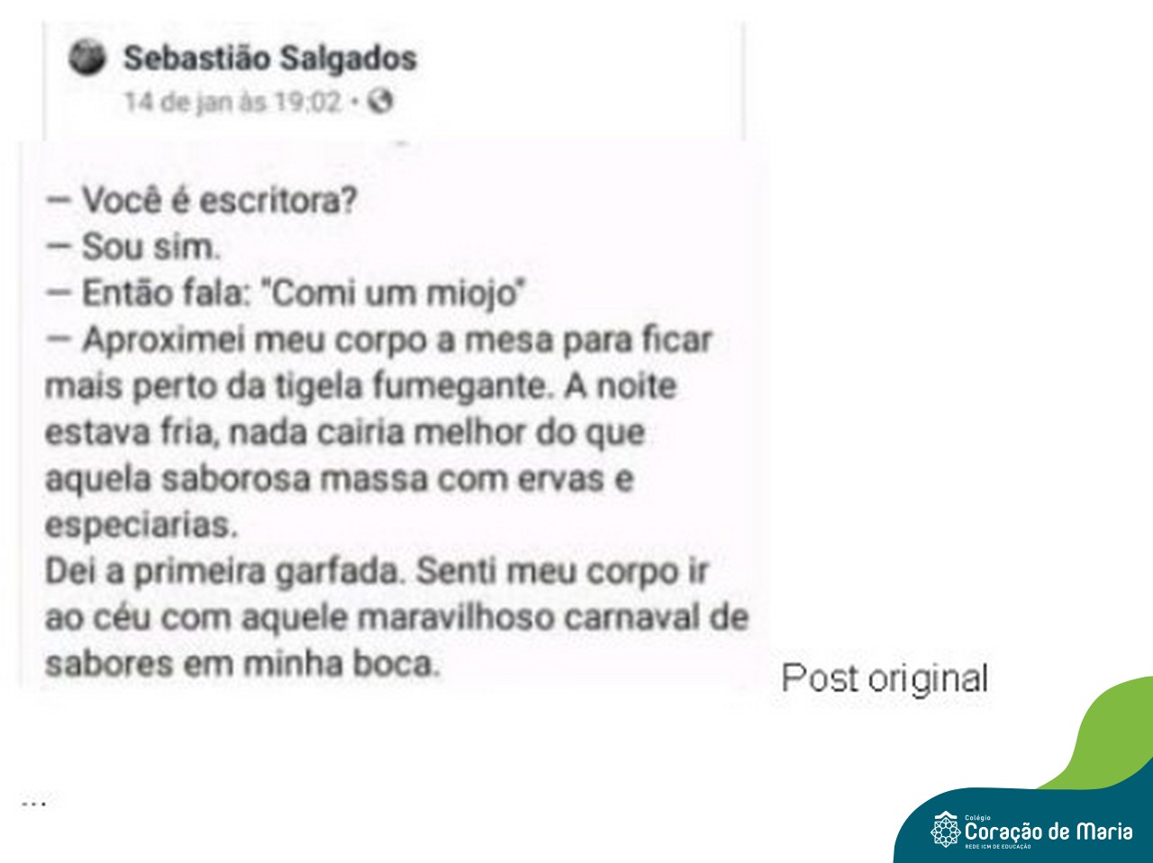 Inspirados na página de humor Sebastião Salgados, os alunos dos oitavos e nonos anos, na aula de Língua portuguesa da Professora Cristiane S. Gonçalves, ressuscitaram um dos melhores memes relacionados a comida. O Festival Miojo Literário consiste na brincadeira com a descrição do ato de comer macarrão instantâneo, simulando o olhar de um escritor (ver postagem original) A postagem gerou uma leva de comentários geniais na página na época , e, nós , não poderíamos ficar de fora. Assim, os alunos trouxeram personagens , autores, youtubers, cantores…enfim, um pouco do universo deles para a prática da escrita criativa e da interação , a partir do diálogo : “-Você é o/ a_______?, -Sou, sim! -Então fala, “comi um miojo”…