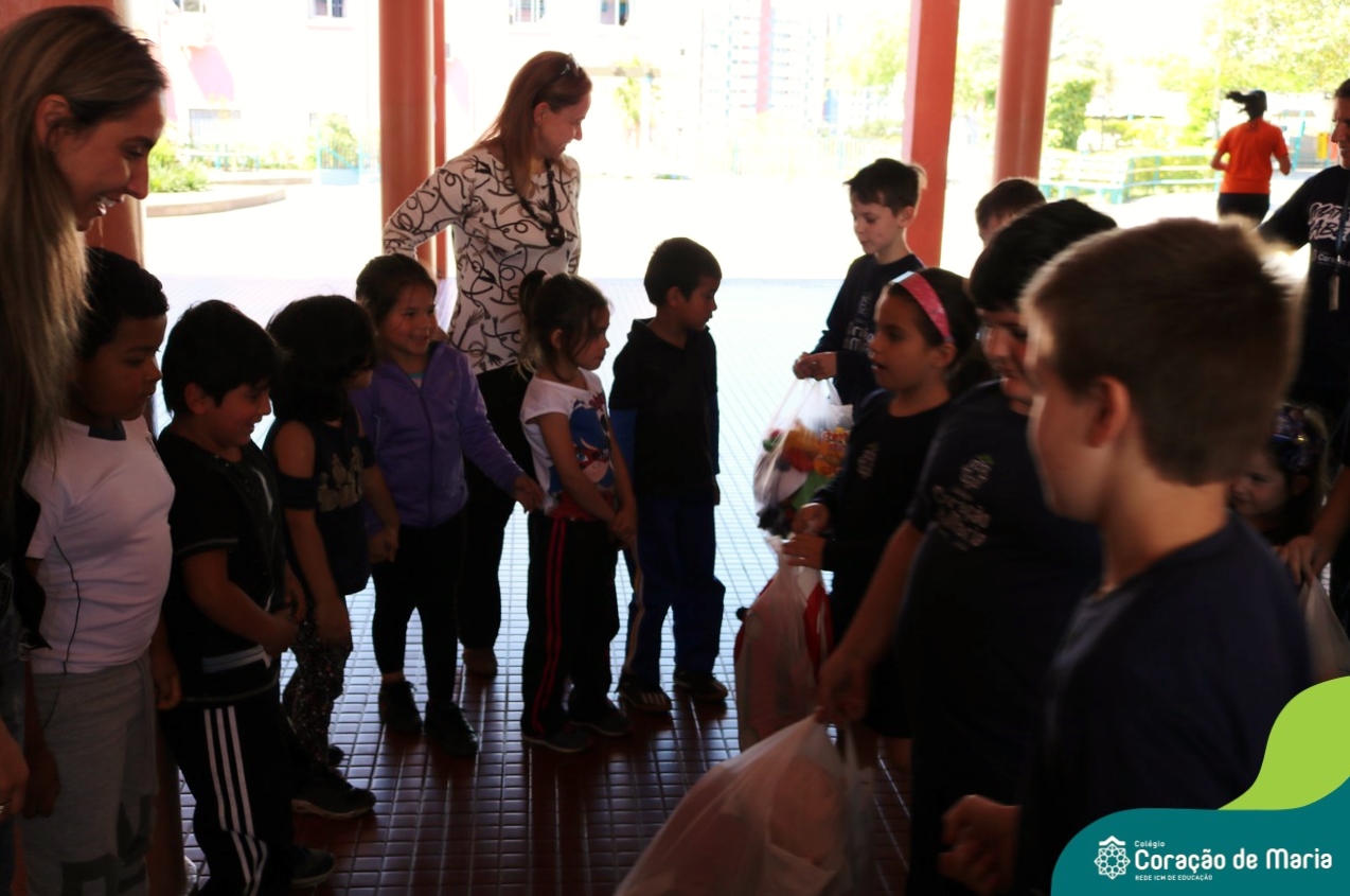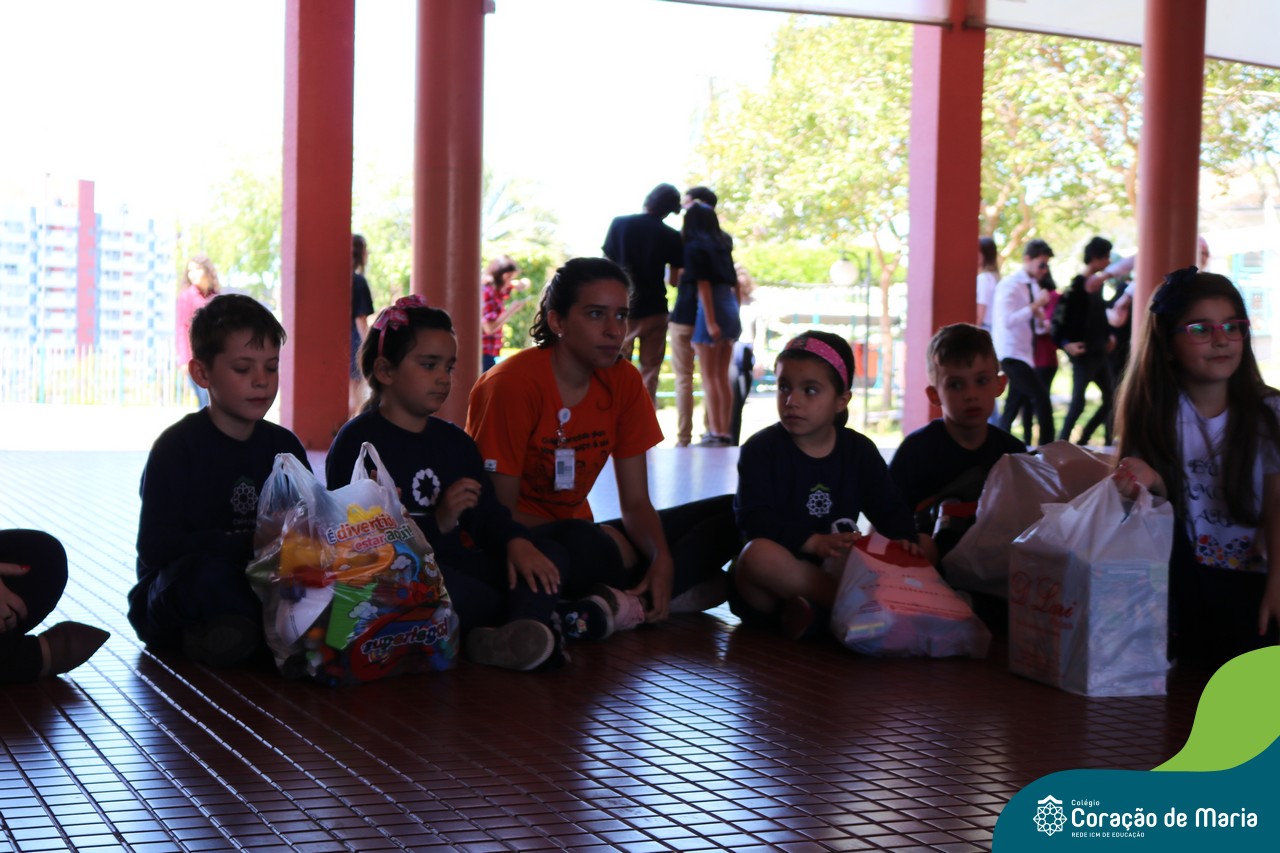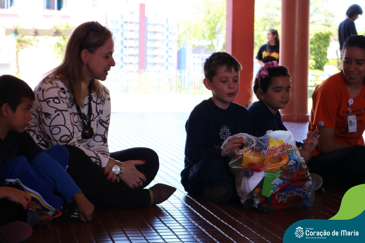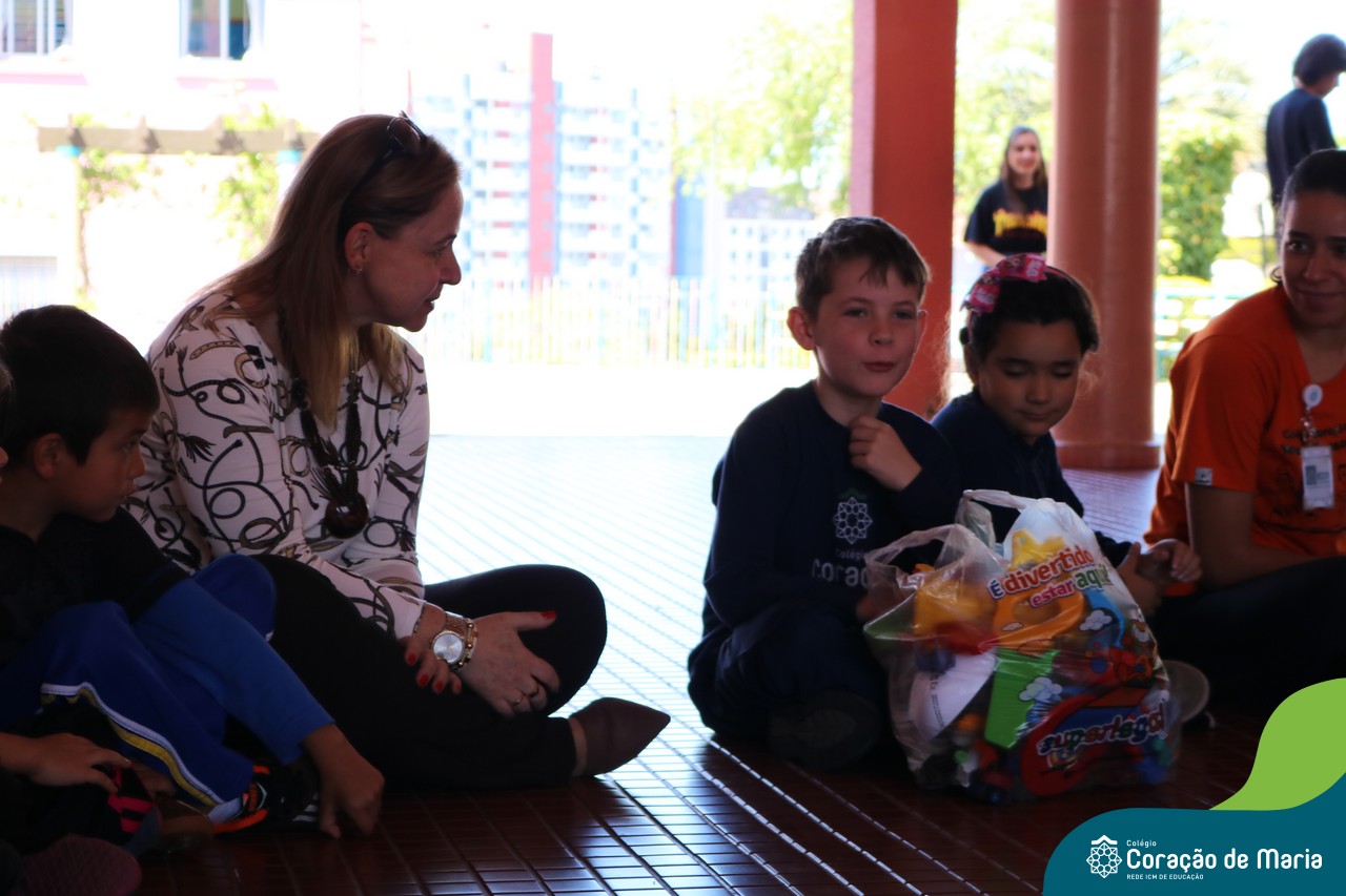 O Turno Extracurricular desenvolveu no mês de outubro uma campanha de arrecadação de brinquedos e livros, tendo apoio dos alunos da Educação Infantil e Anos Iniciais. A ideia foi compartilhar alegria com crianças mais necessitadas, no mês destinando a elas. No dia 24 de outubro, professoras e alunos representantes da EMEI Montanha Russa vieram receber as expressivas e carinhosas doações aqui no Colégio.