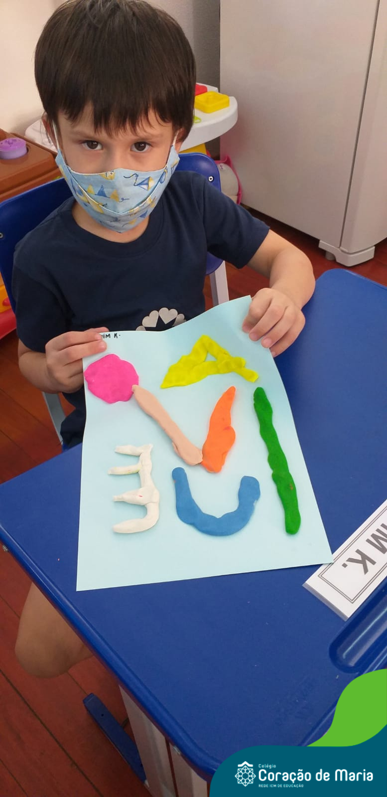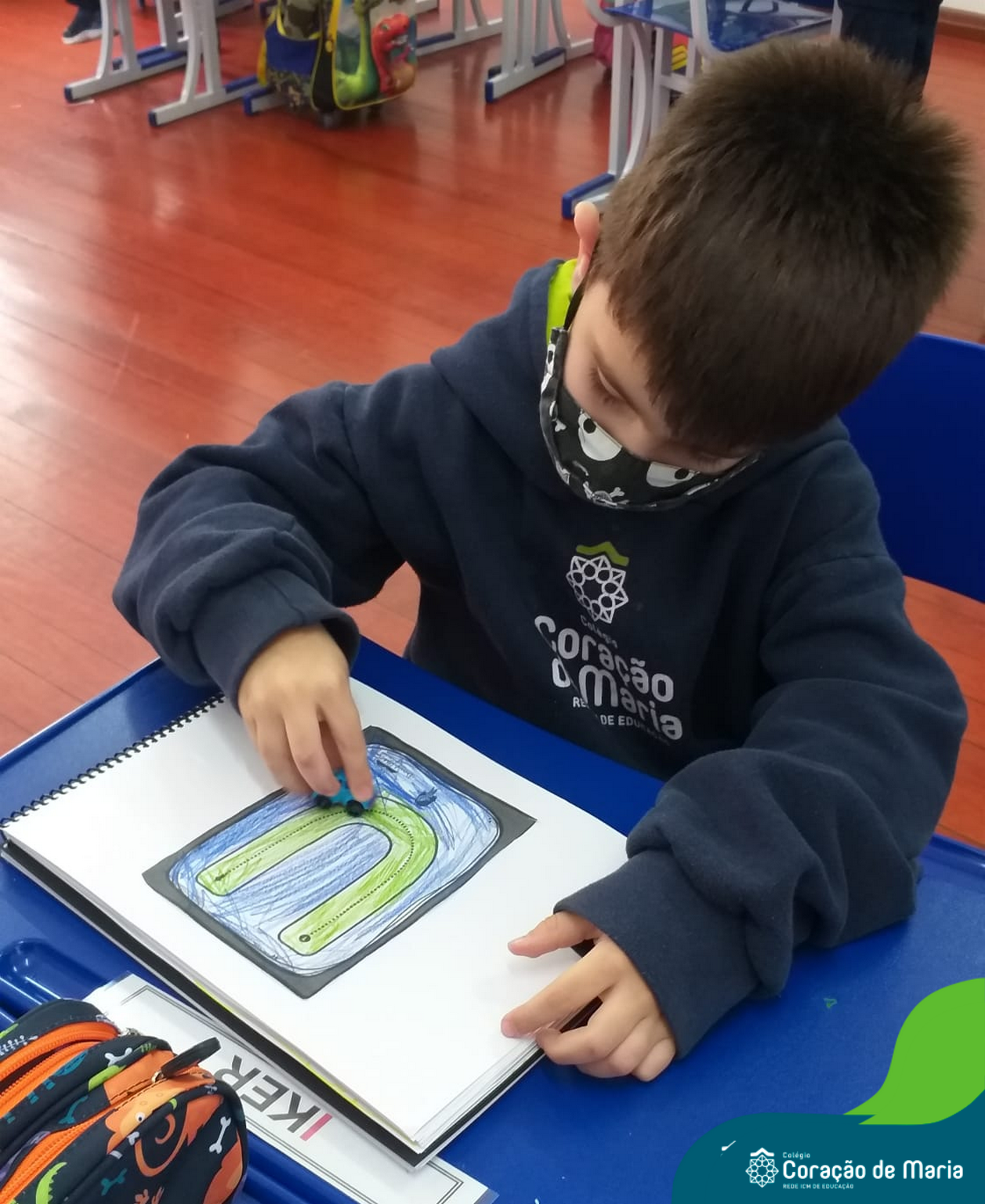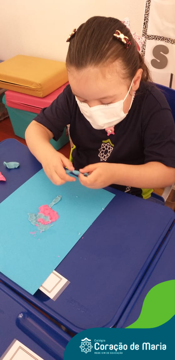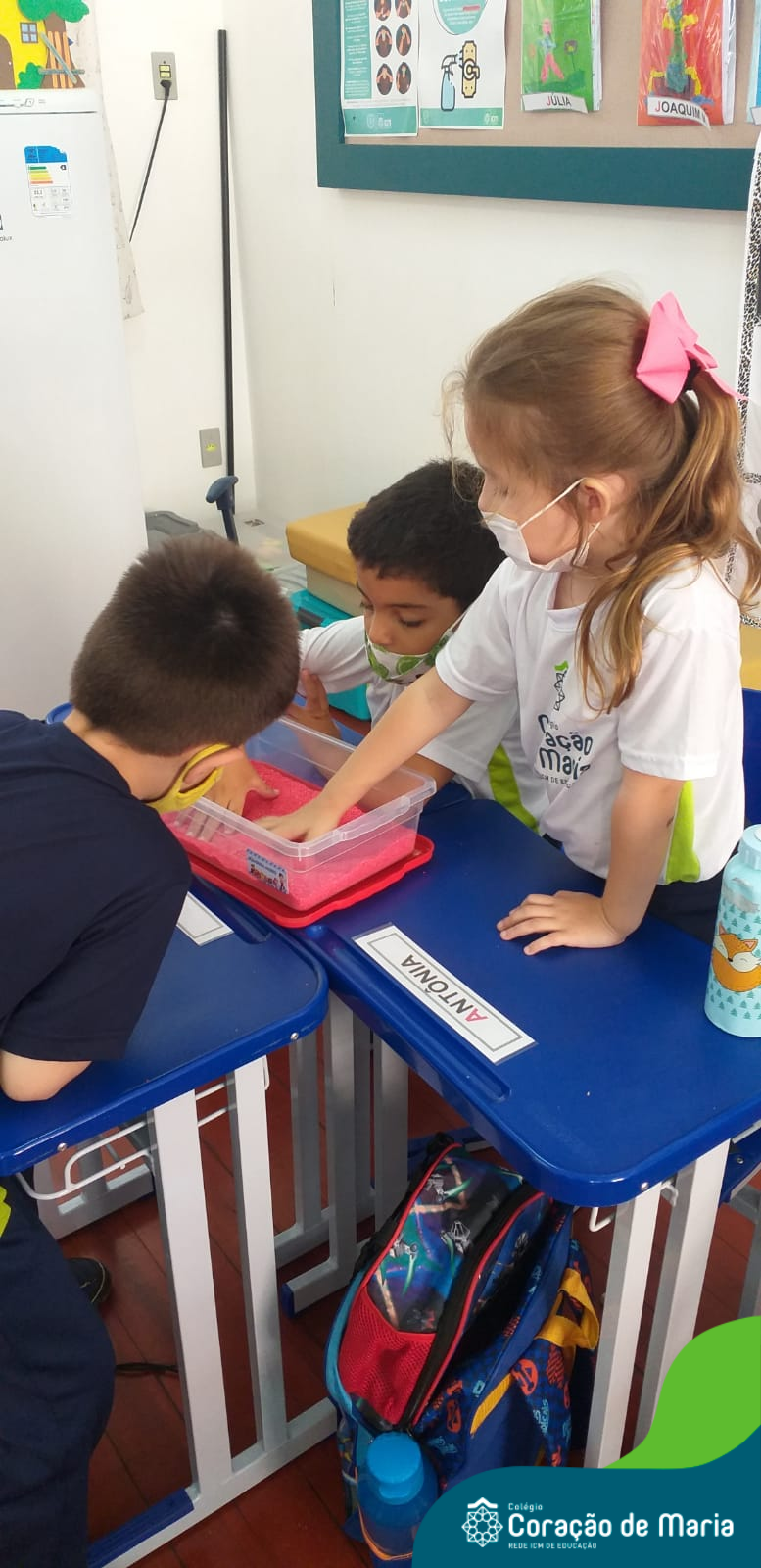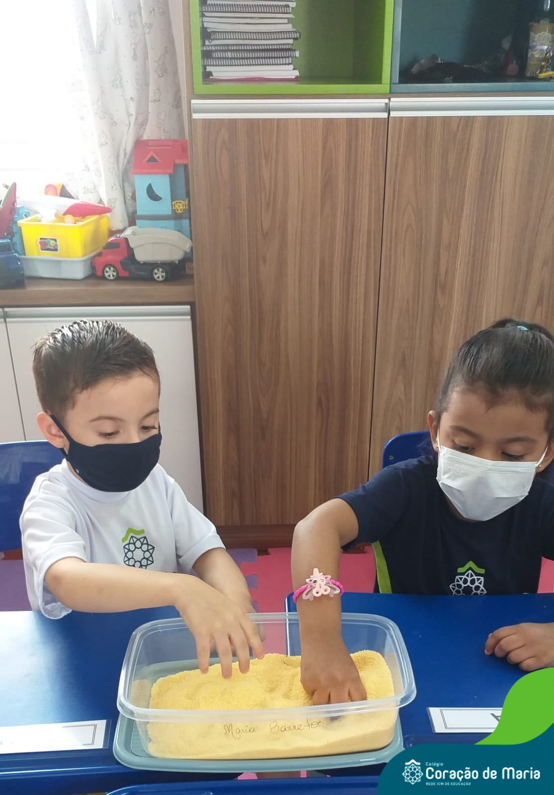 Essa descoberta aconteceu através de um circuito, onde experienciaram e manipularam materiais como, areia colorida, massinha de modelar e tinta para escrever, modelar e fazer o traçado das novas amigas. Foi um momento cheio de significados, partilha e integração, além de desenvolver e aprimorar novas habilidades.