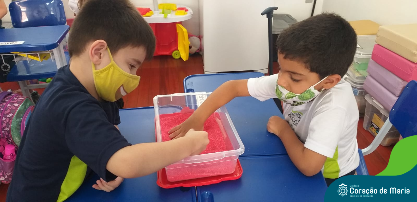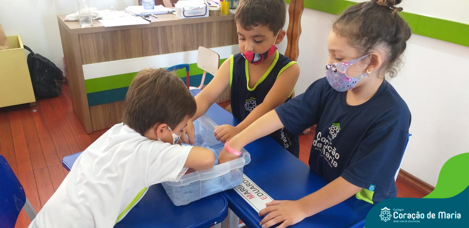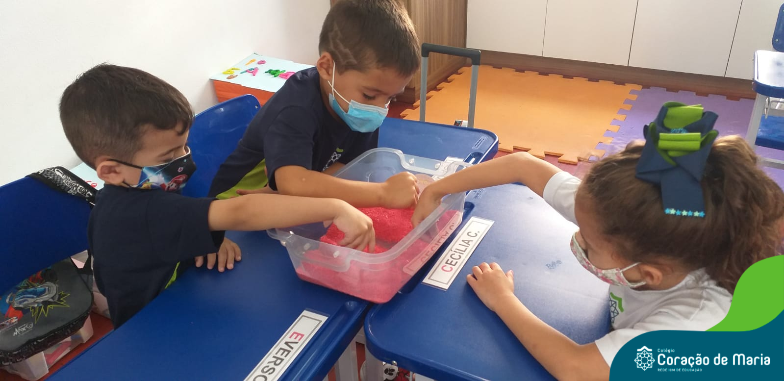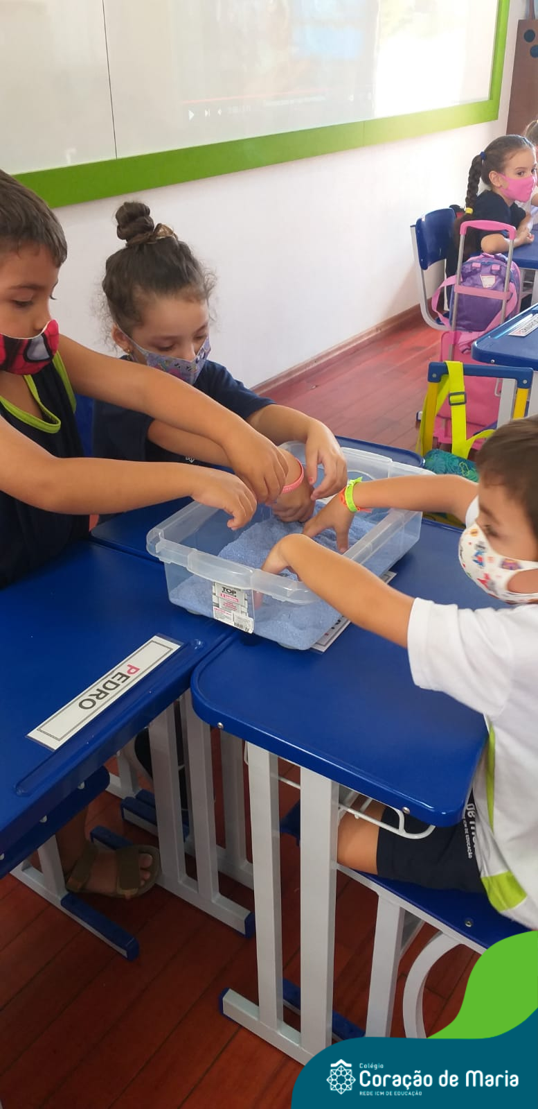 Essa descoberta aconteceu através de um circuito, onde experienciaram e manipularam materiais como, areia colorida, massinha de modelar e tinta para escrever, modelar e fazer o traçado das novas amigas. Foi um momento cheio de significados, partilha e integração, além de desenvolver e aprimorar novas habilidades.