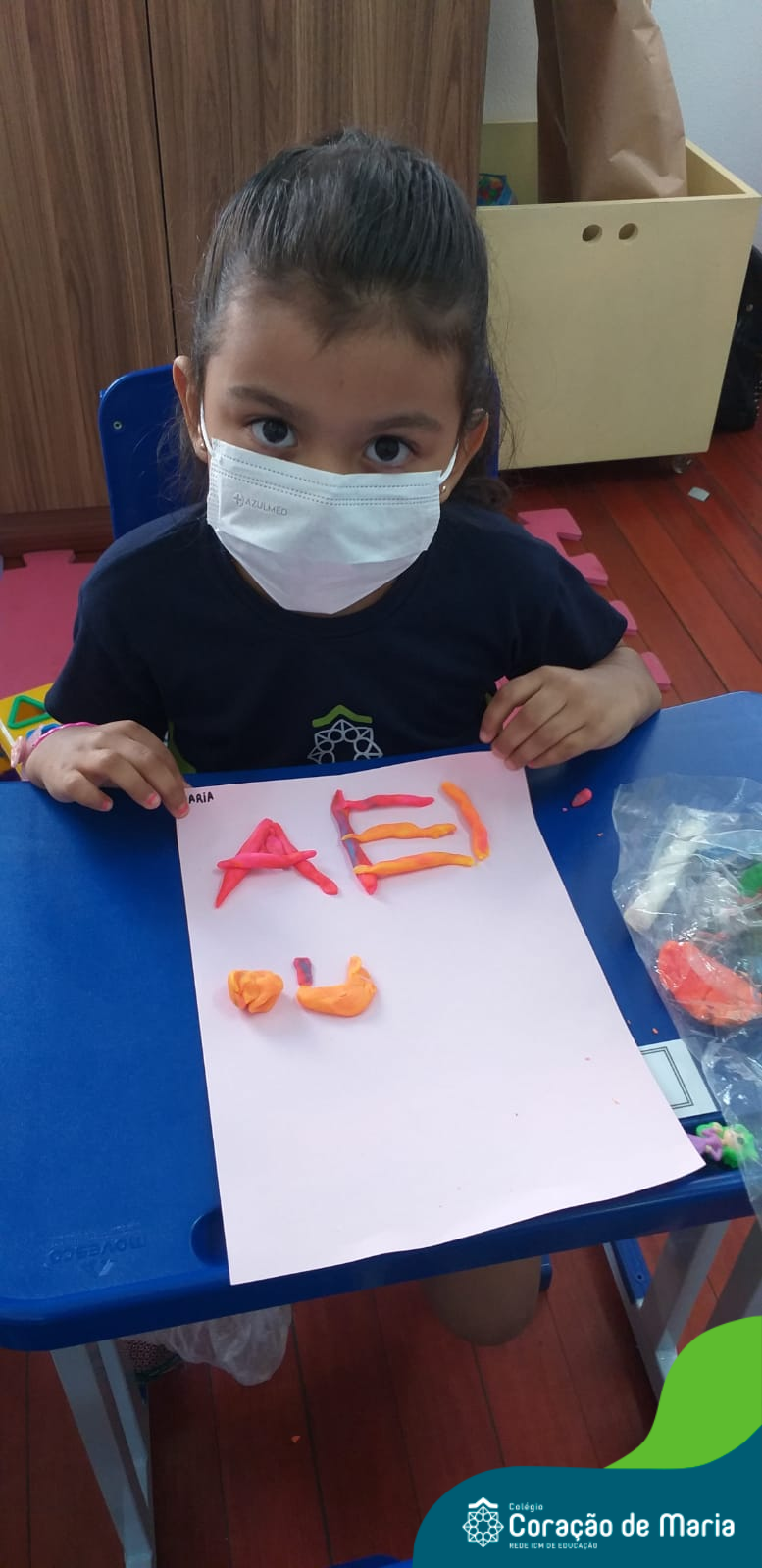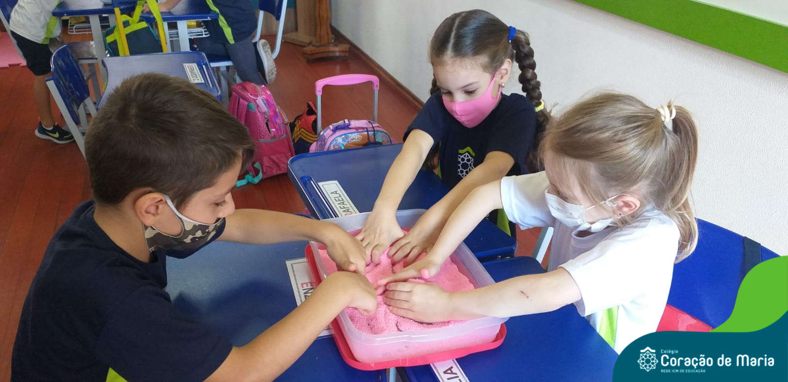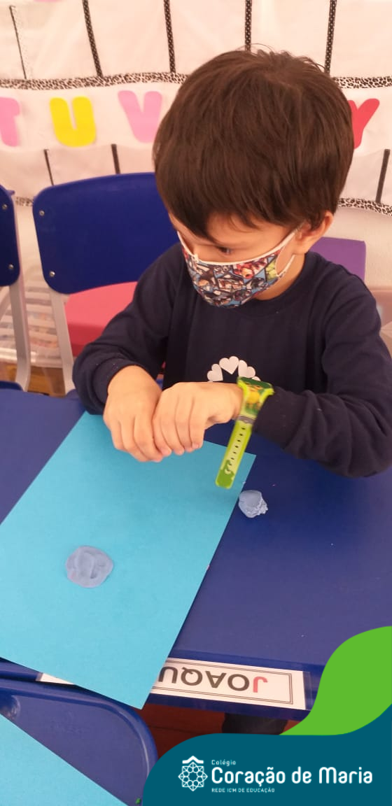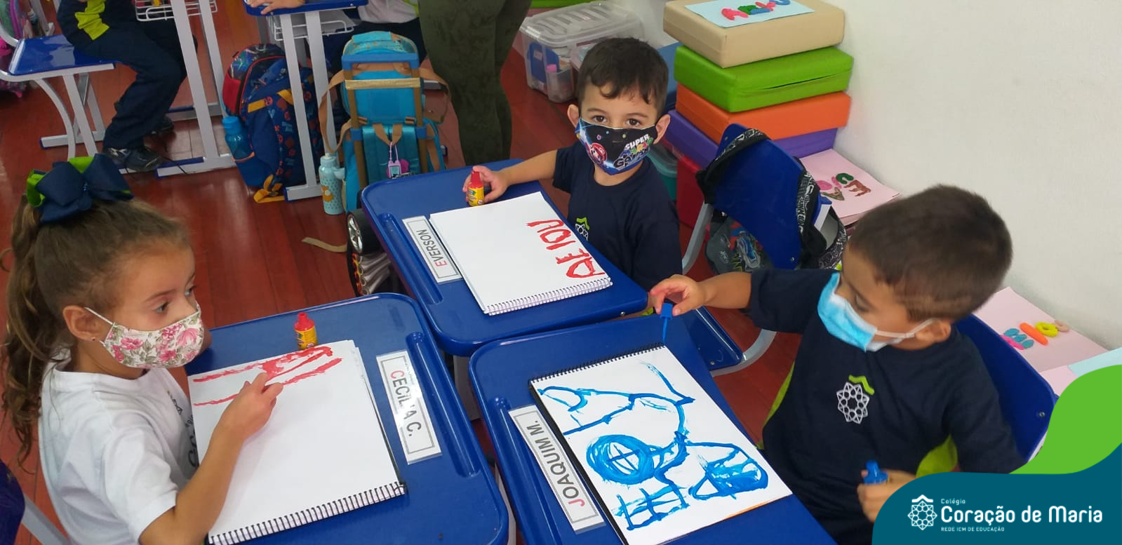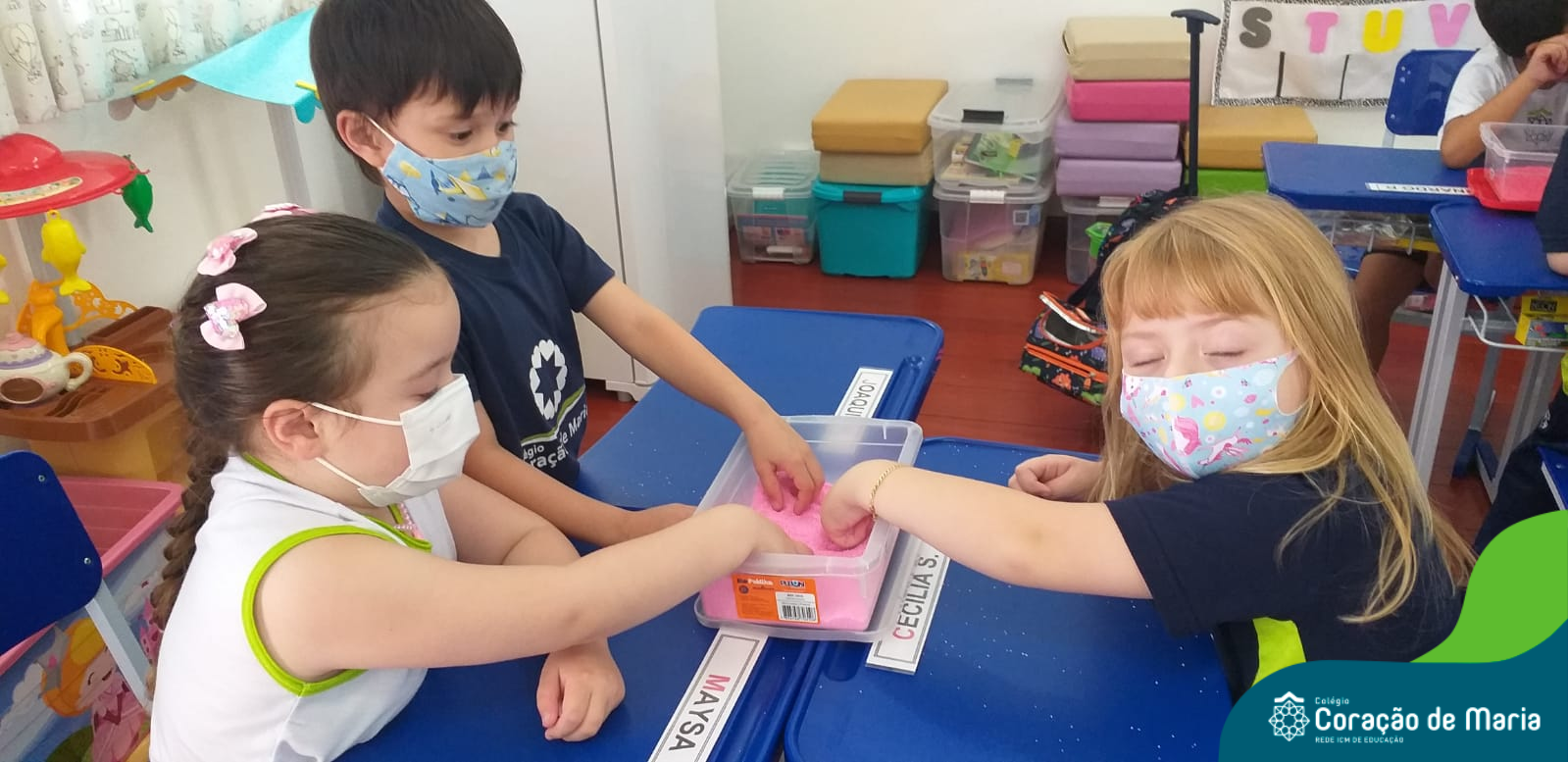 Essa descoberta aconteceu através de um circuito, onde experienciaram e manipularam materiais como, areia colorida, massinha de modelar e tinta para escrever, modelar e fazer o traçado das novas amigas. Foi um momento cheio de significados, partilha e integração, além de desenvolver e aprimorar novas habilidades.