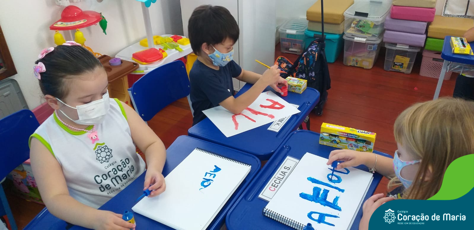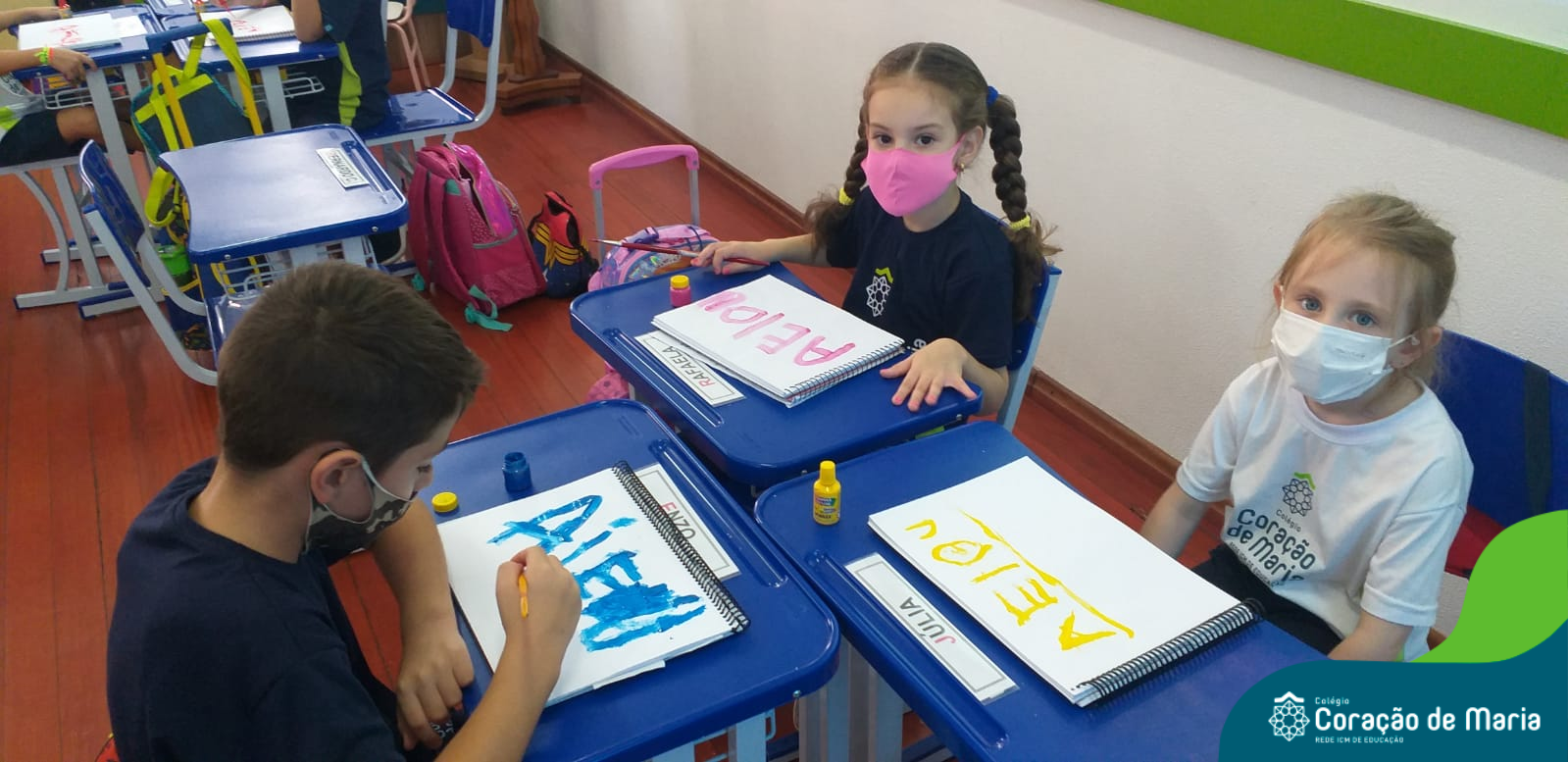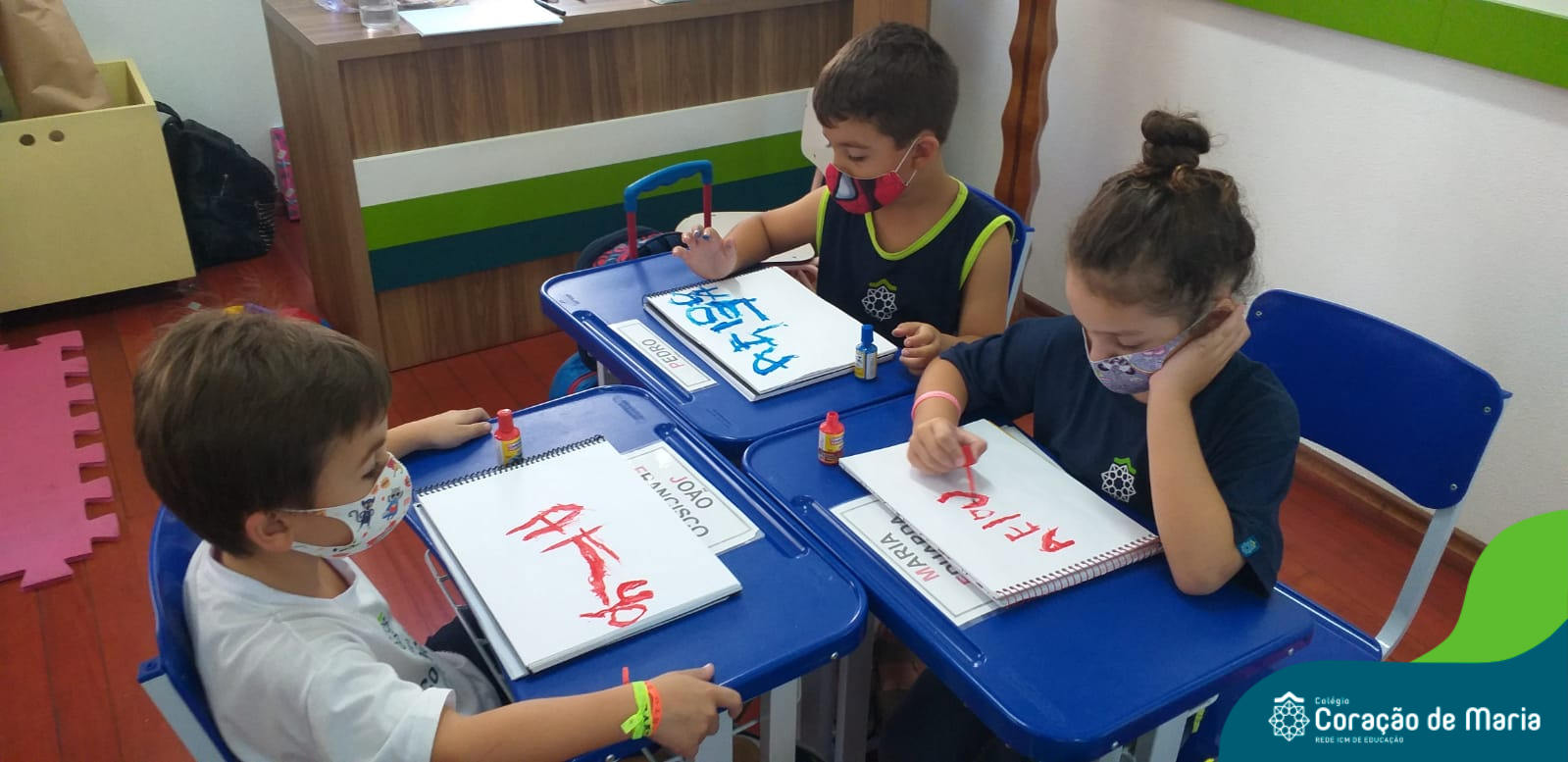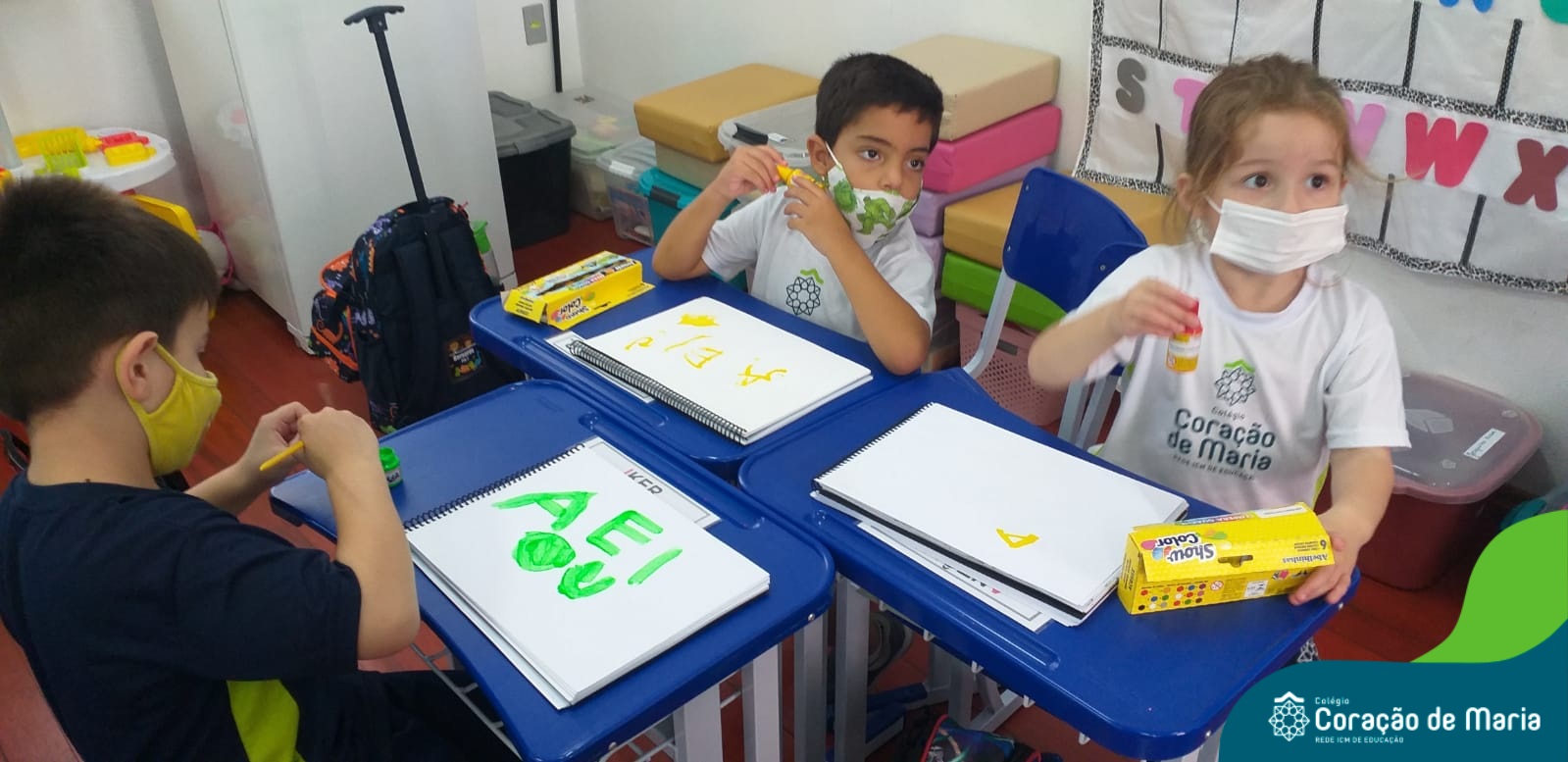 Essa descoberta aconteceu através de um circuito, onde experienciaram e manipularam materiais como, areia colorida, massinha de modelar e tinta para escrever, modelar e fazer o traçado das novas amigas. Foi um momento cheio de significados, partilha e integração, além de desenvolver e aprimorar novas habilidades.
