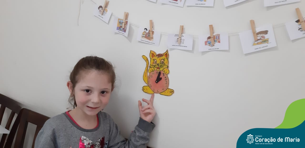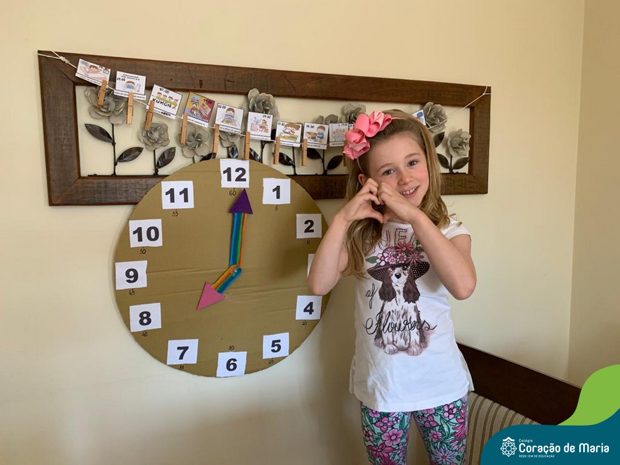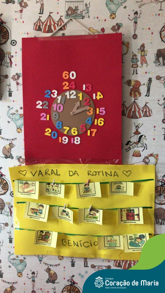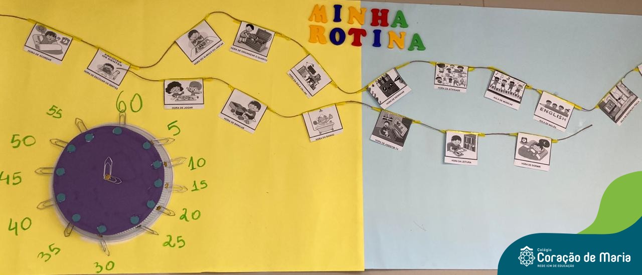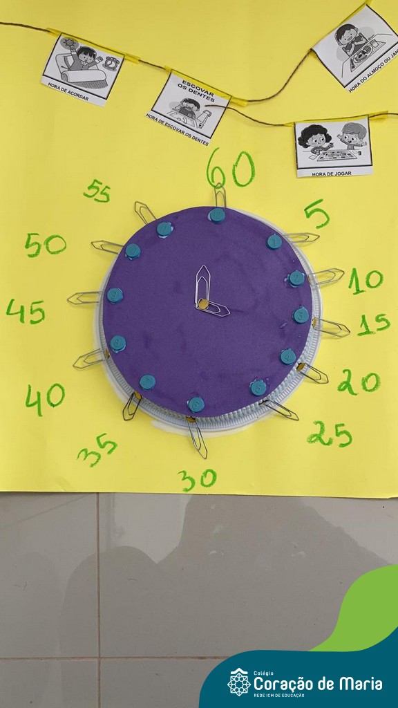 Além do calendário, que é trabalhado diariamente em aula, a rotina e o relógio também são instrumentos que explicam e compõem o cotidiano das crianças.