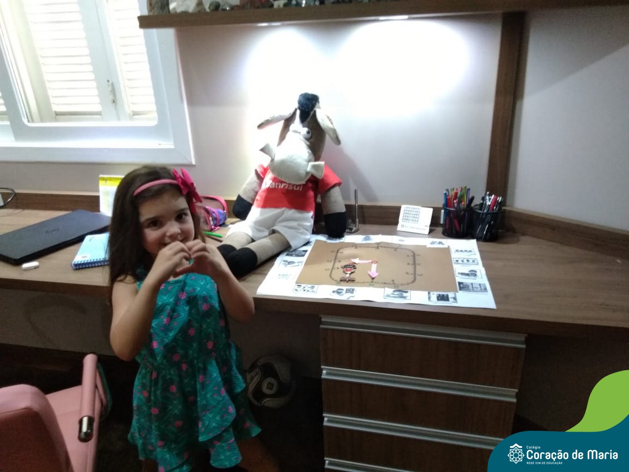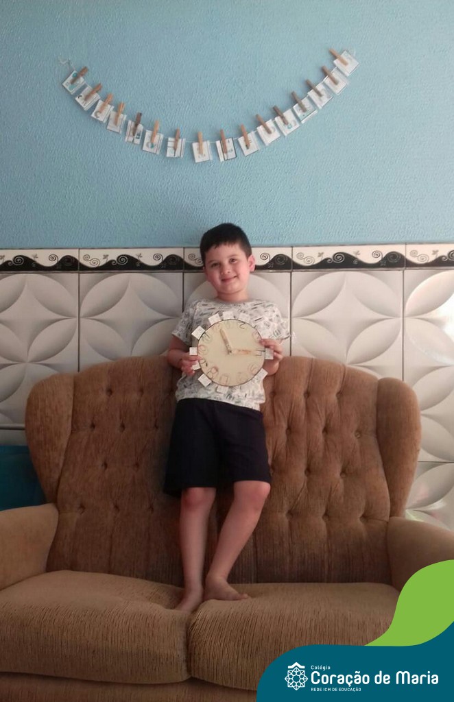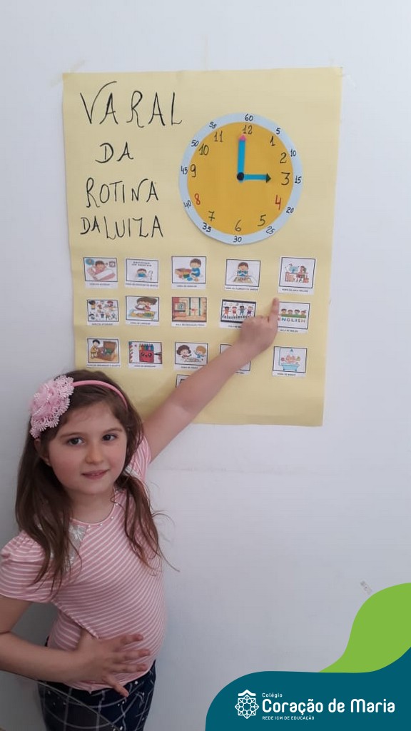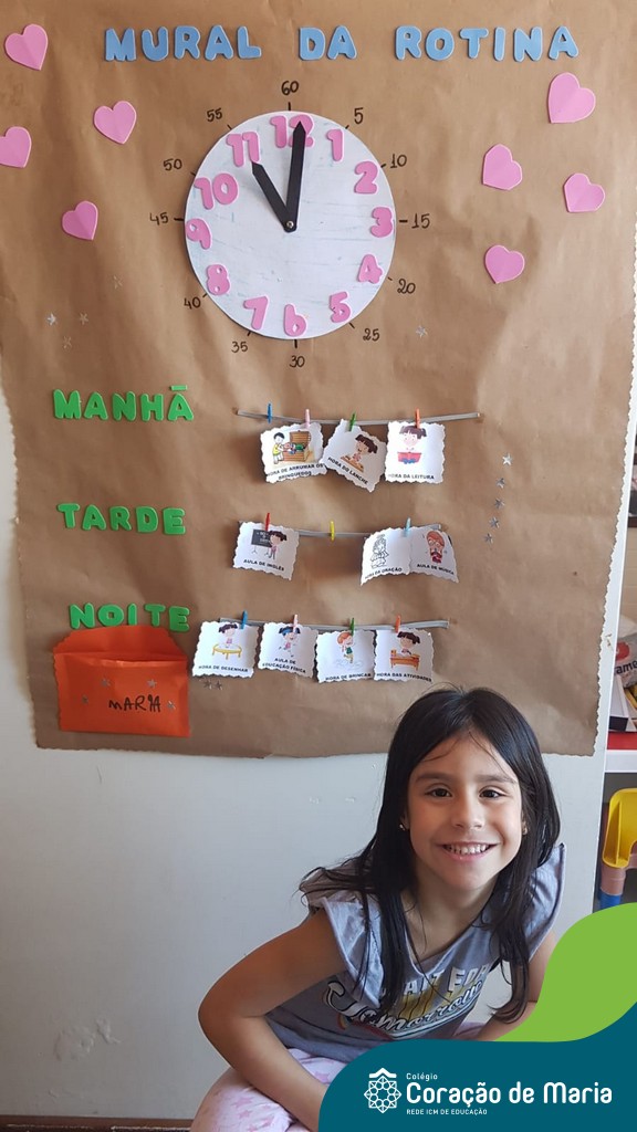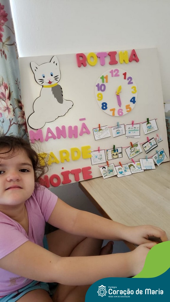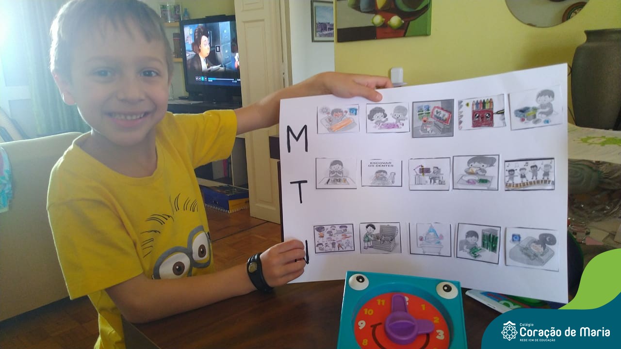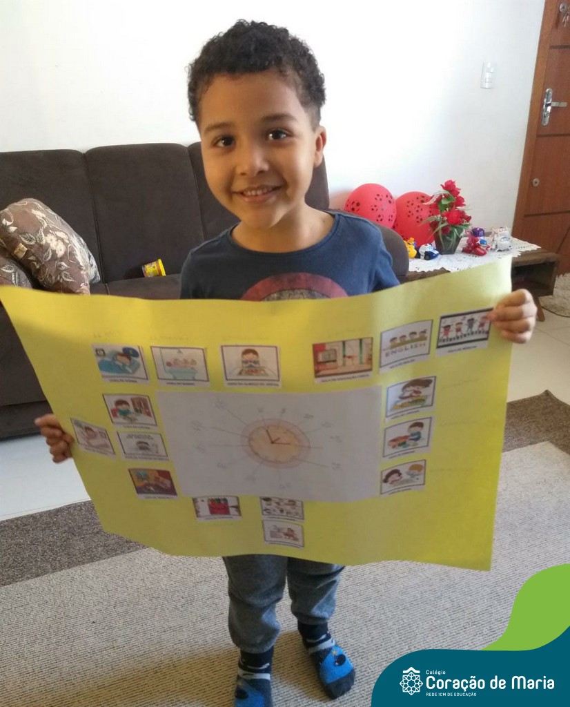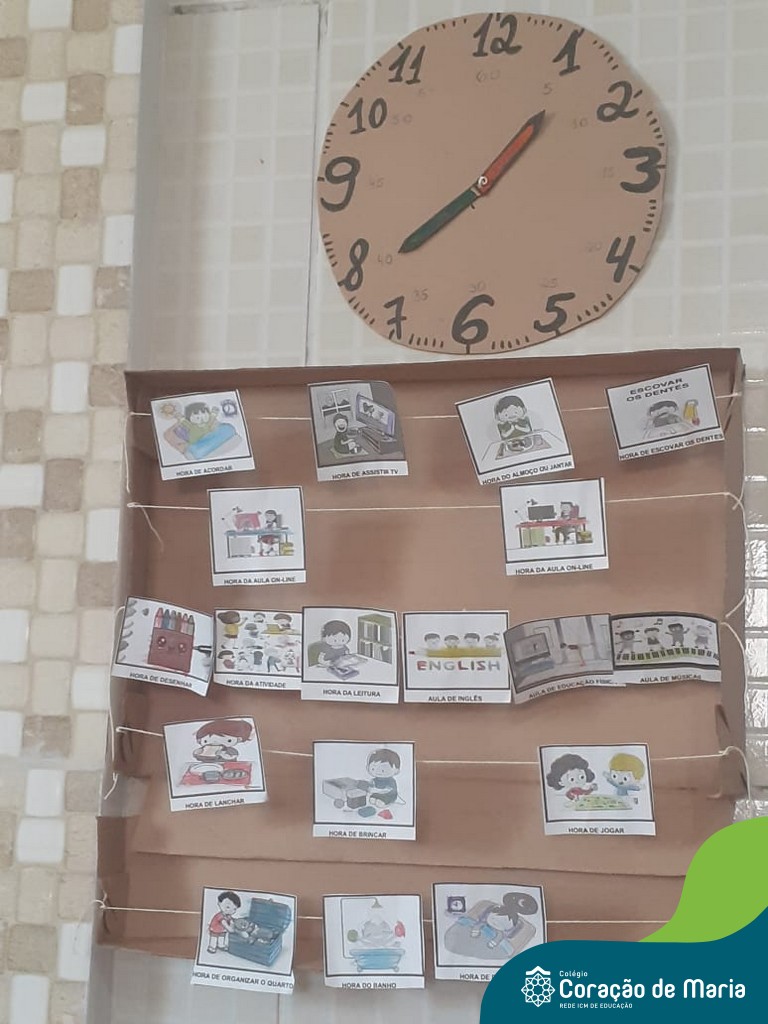 Nesse sentido, a turma Pré 2A e suas famílias construíram esses meios de reconhecer o tempo e o espaço de forma simples e divertida, para ser utilizado no início de cada encontro on-line, reproduzindo assim, as ações que eles praticam todos os dias e desenvolvendo a autonomia para a execução das tarefas diárias.