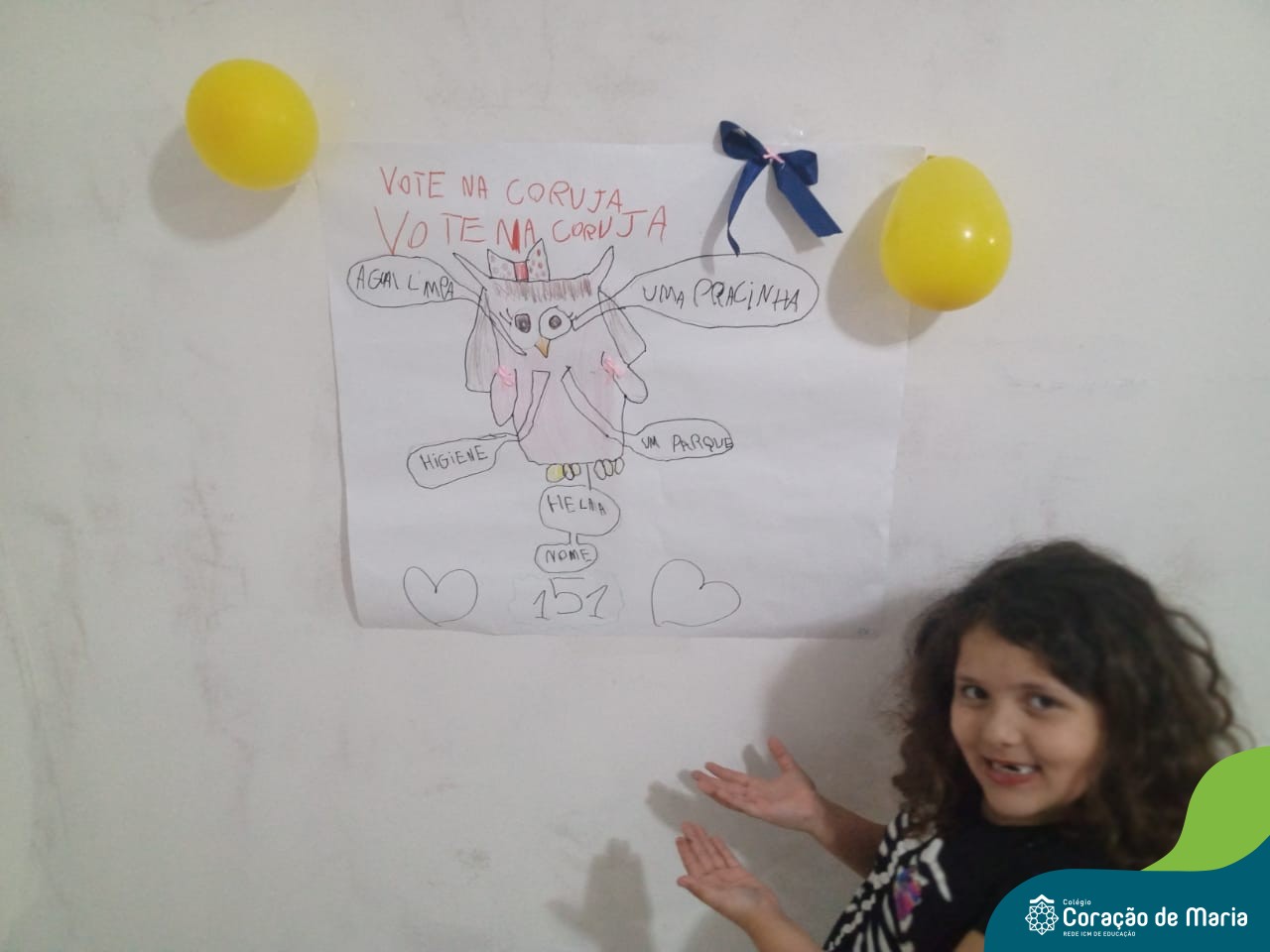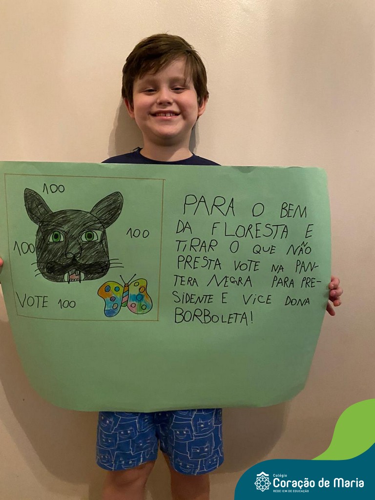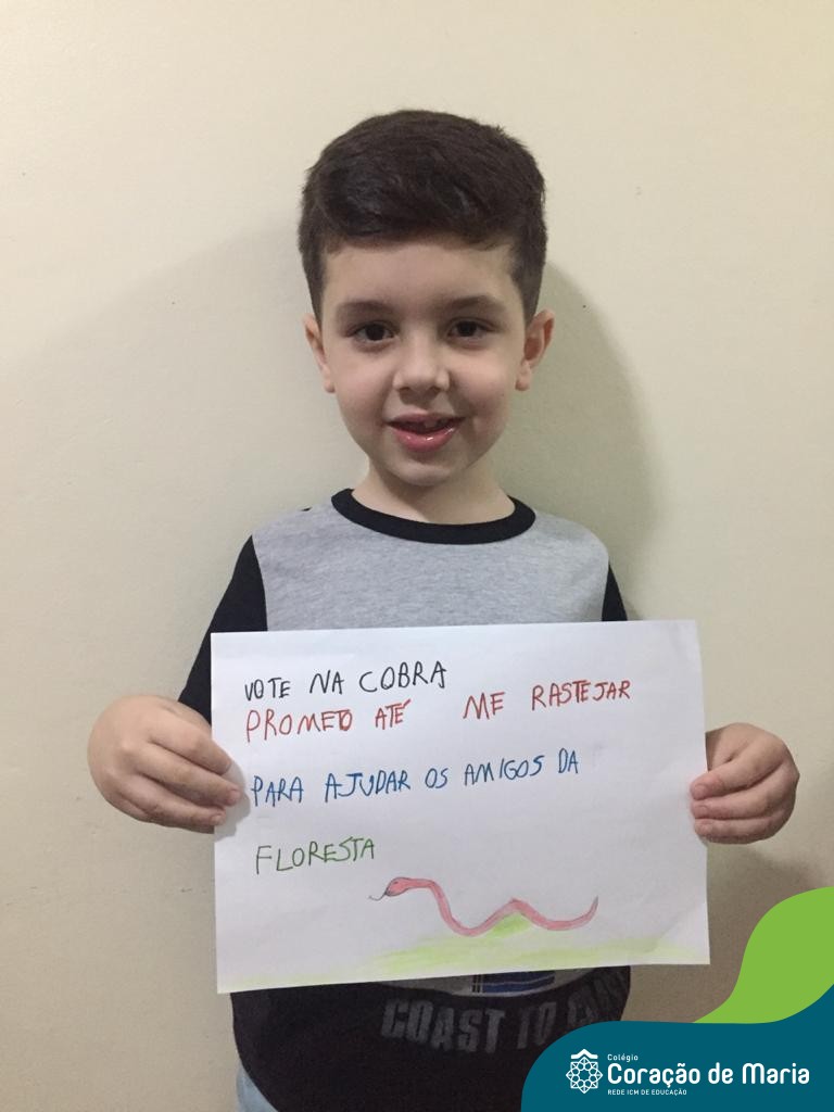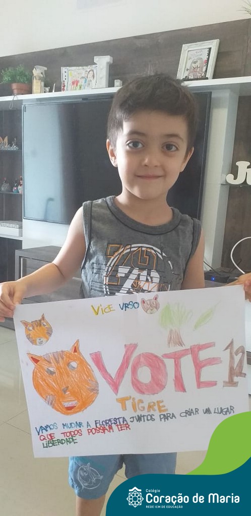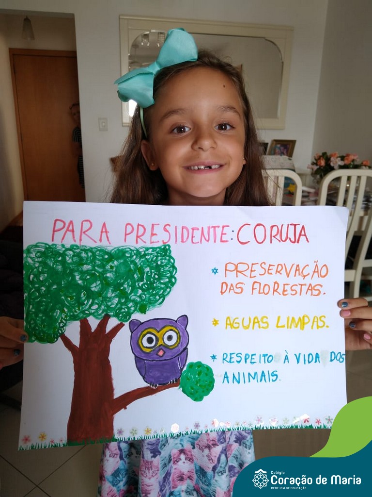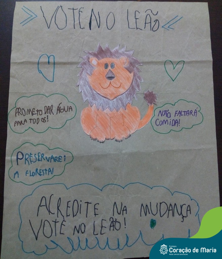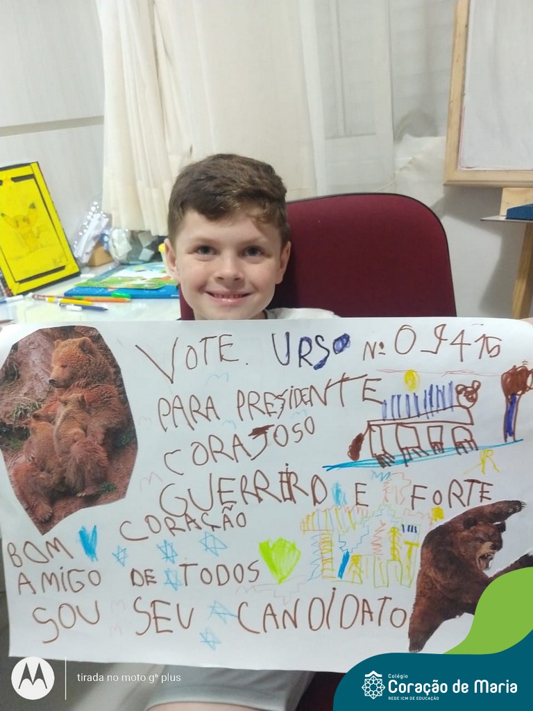 As professoras dos Primeiros Anos abordaram o assunto referente às eleições com a história “Eleições dos bichos”. A partir da história as crianças confeccionaram cartazes escolhendo representar um bichinho de sua preferência e fazendo a sua própria campanha para ser o presidente da floresta. O resultado deste trabalho pode ser conferido através dos registros fotográficos enviados pelas famílias.