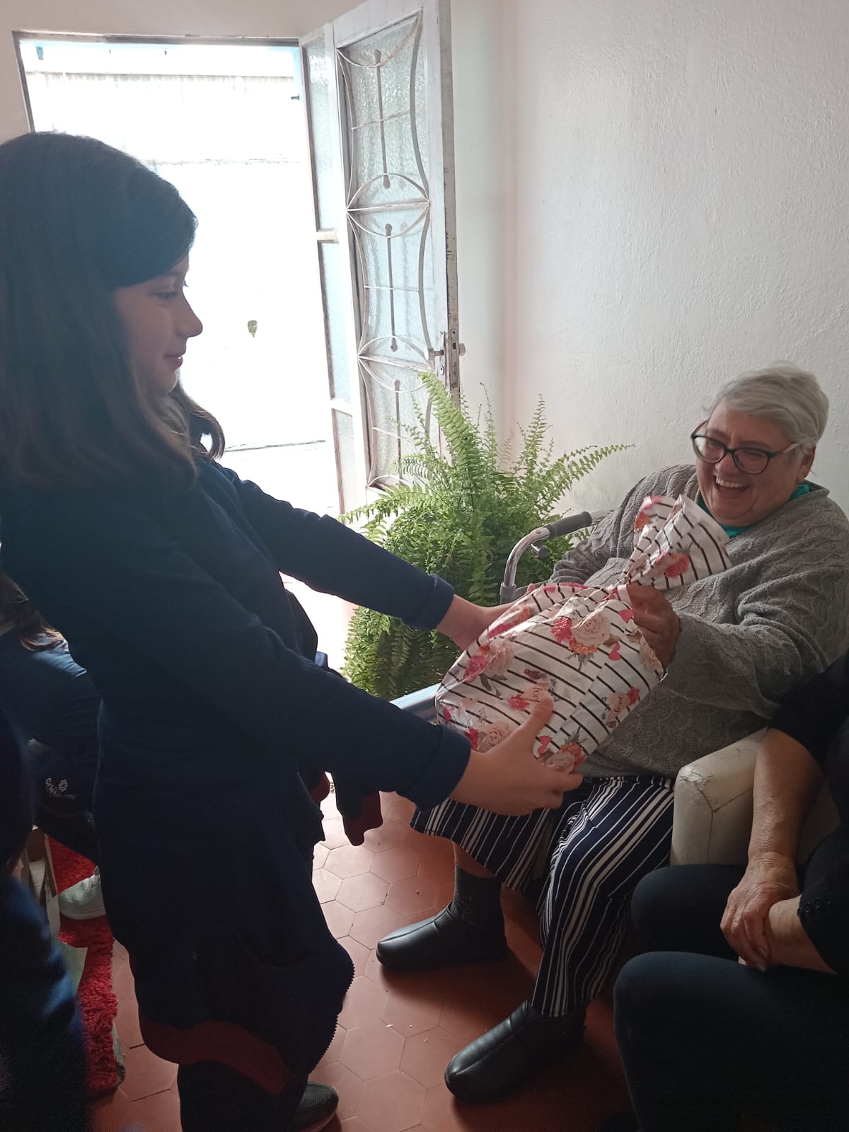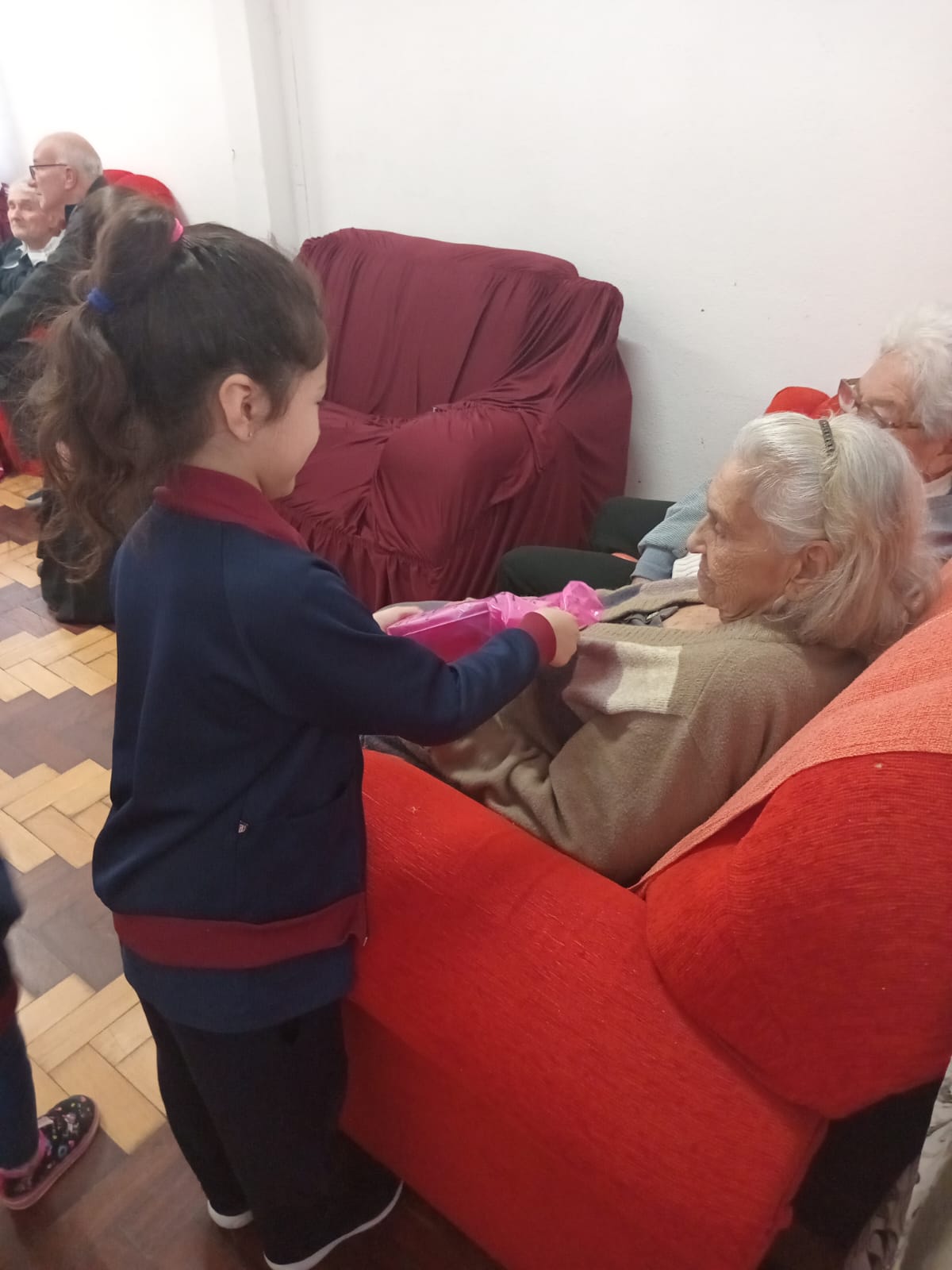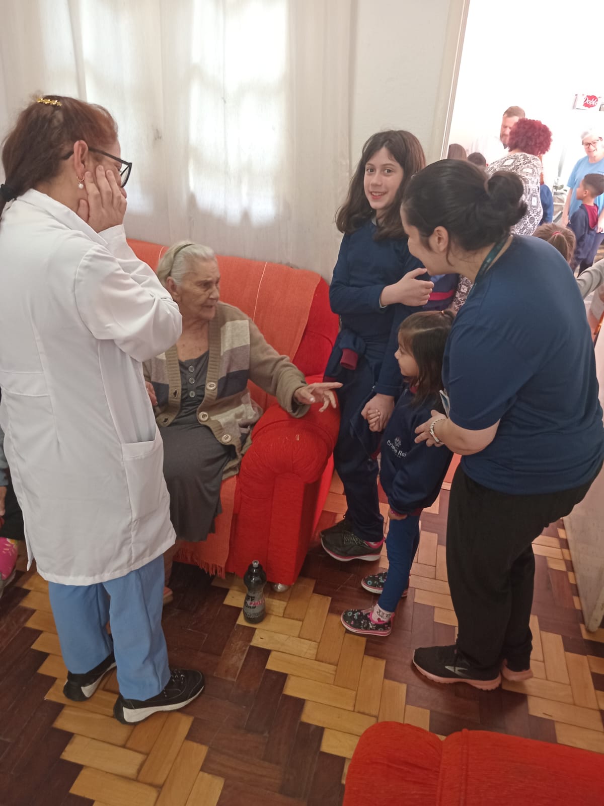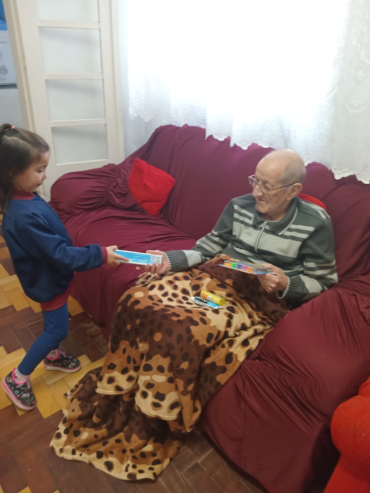 Durante a visita, os representantes das turmas, acompanhados por uma das professoras , tiveram a oportunidade de conviver e interagir com os idosos. Esse encontro permitiu que os estudantes compartilhassem não apenas os materiais arrecadados, mas também gestos de carinho e respeito, proporcionando momentos de conversa, troca de experiências e afeto. Cada abraço, sorriso e olhar carregado de gratidão e ternura tornou a tarde ainda mais significativo para todos.