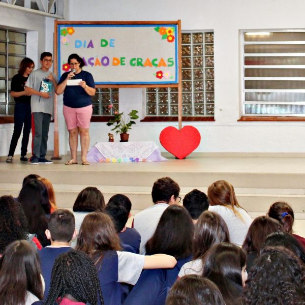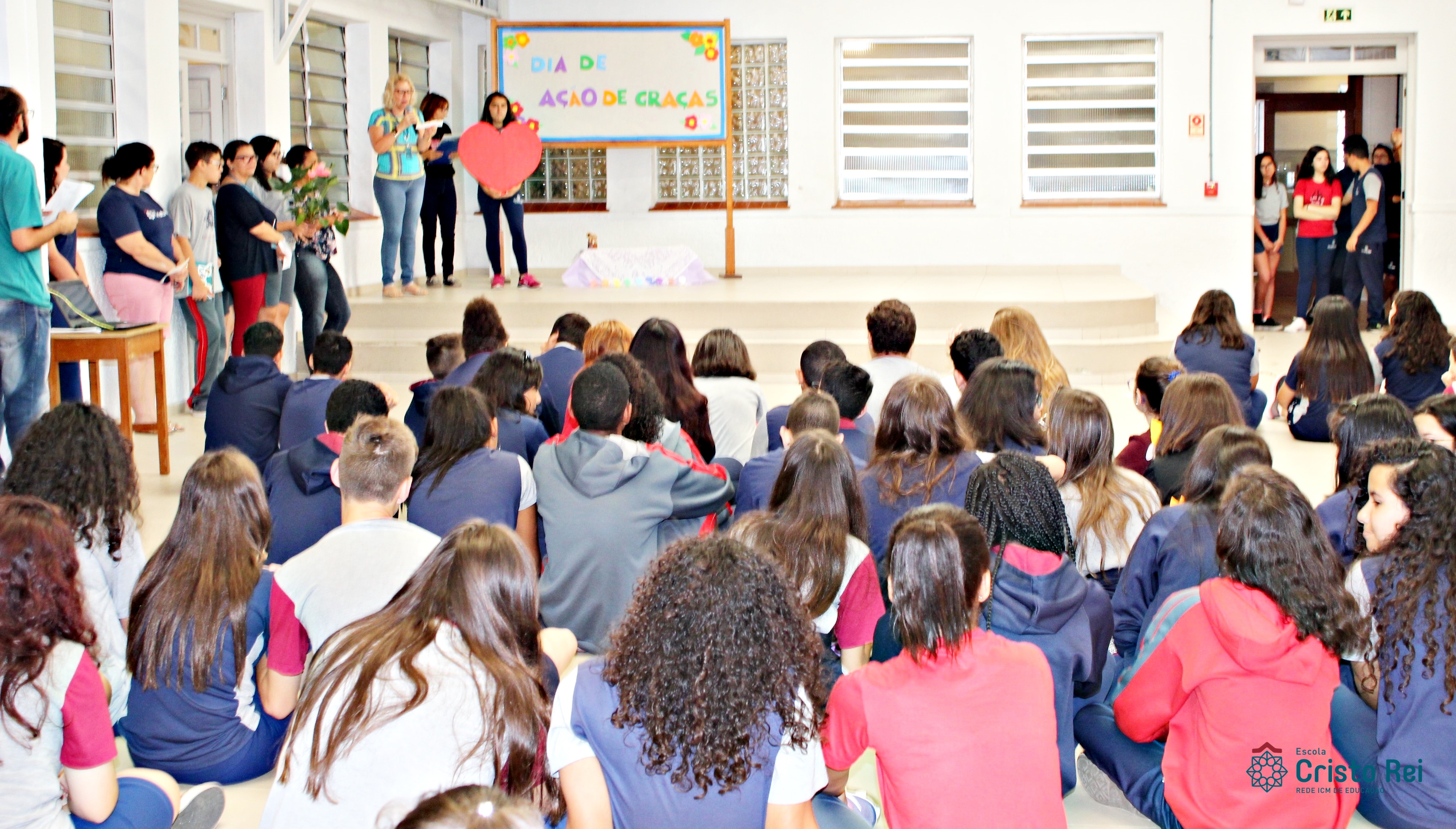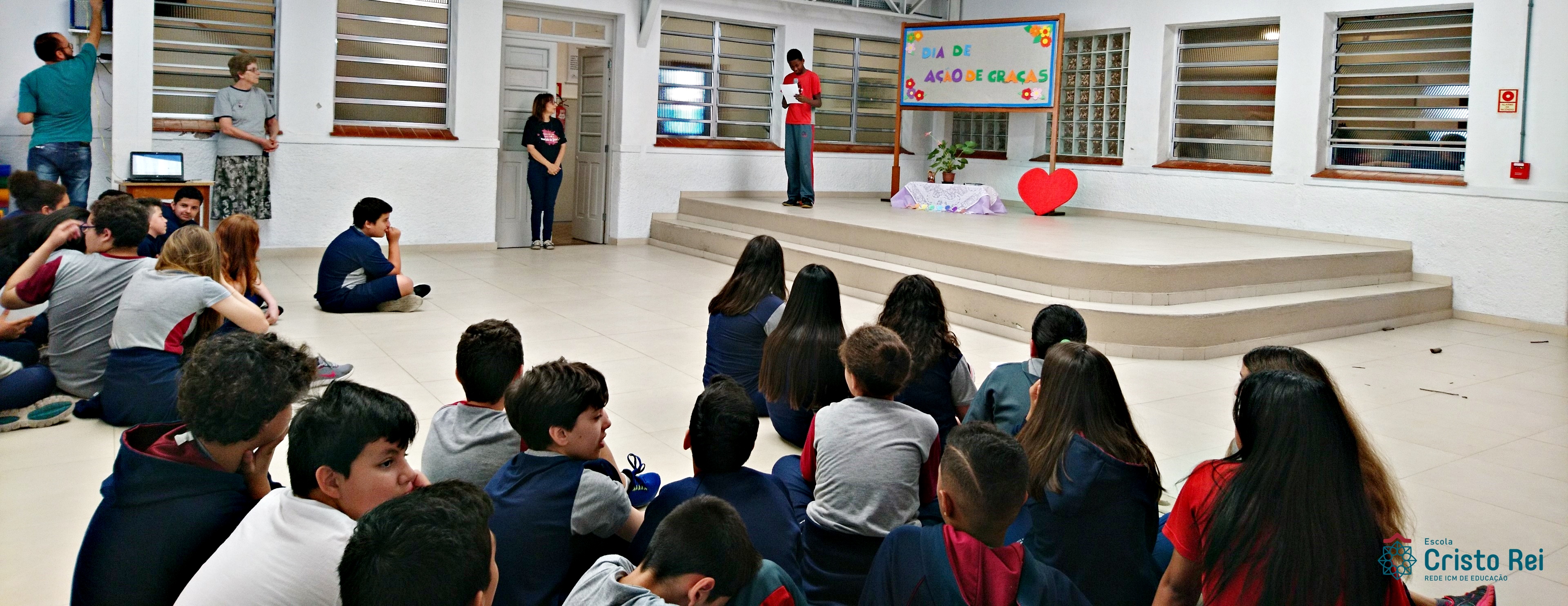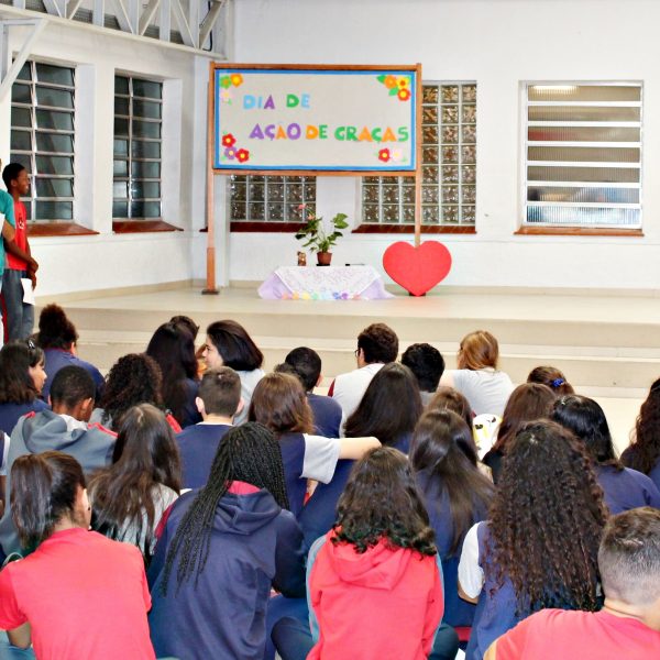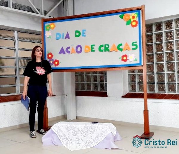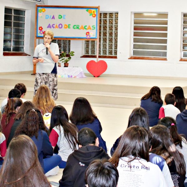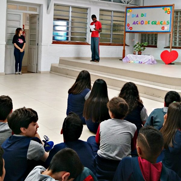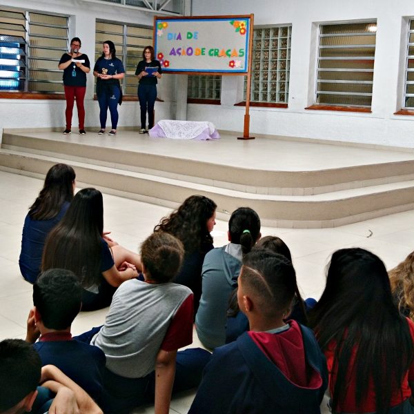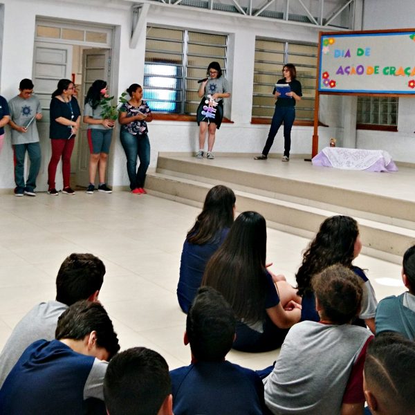 Professores/colaboradores, alunos e Irmãs, participaram de um momento celebrativo por ocasião do Dia Nacional de Ação de Graças, dinamizado pela Pastoral Escolar.