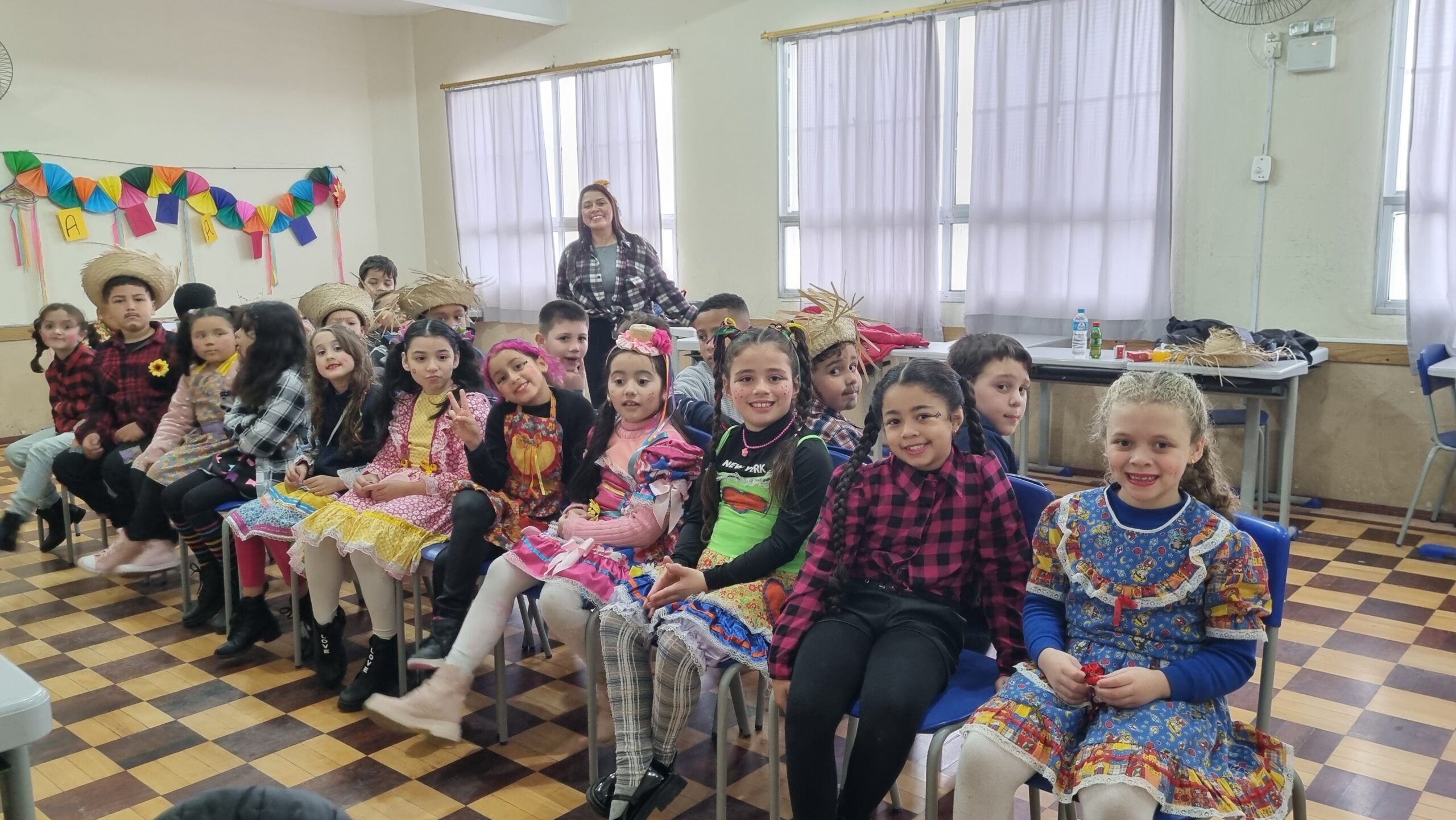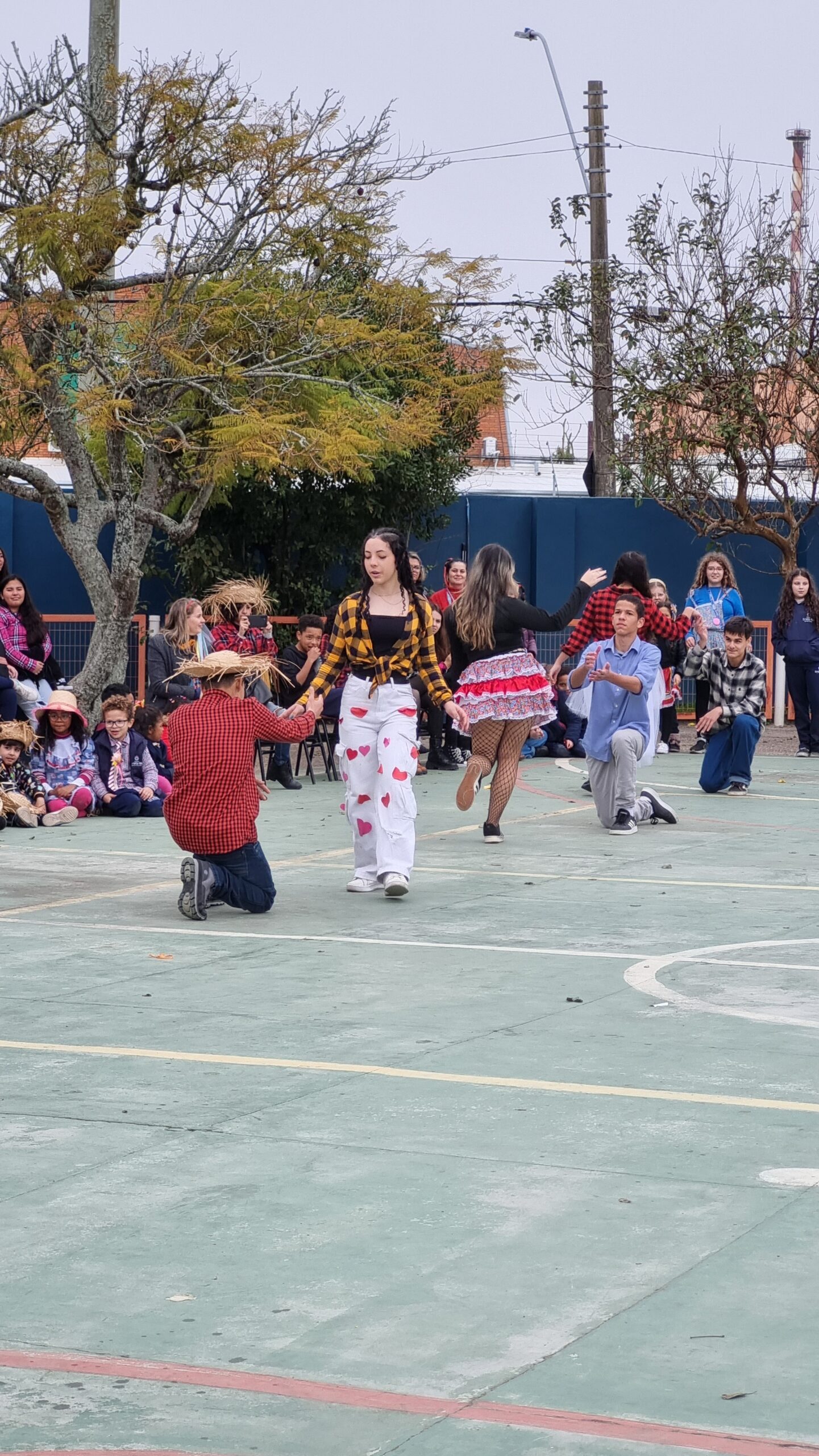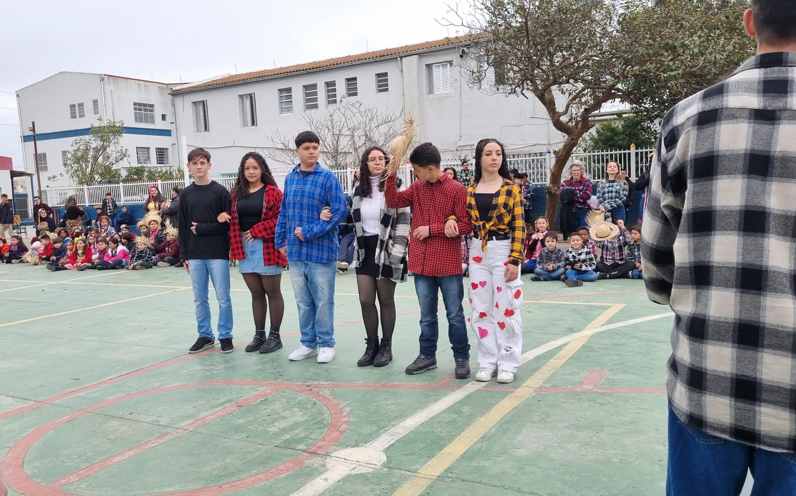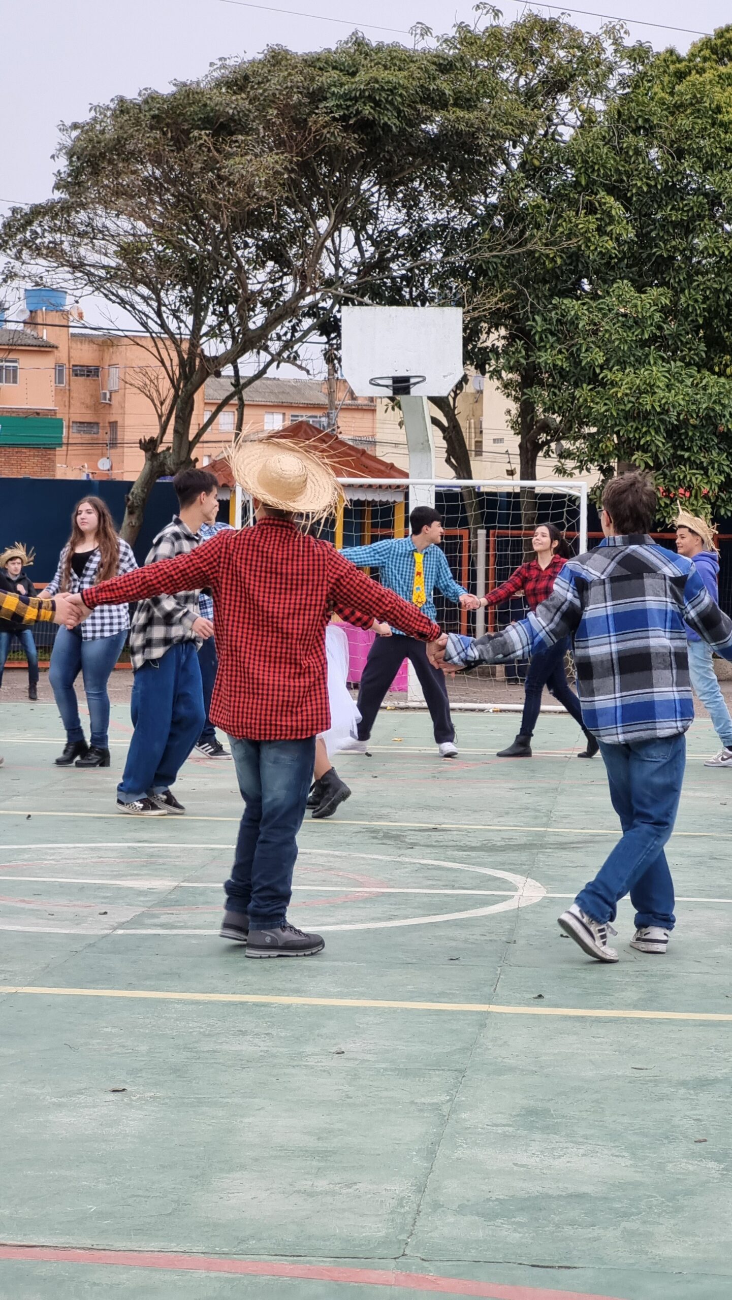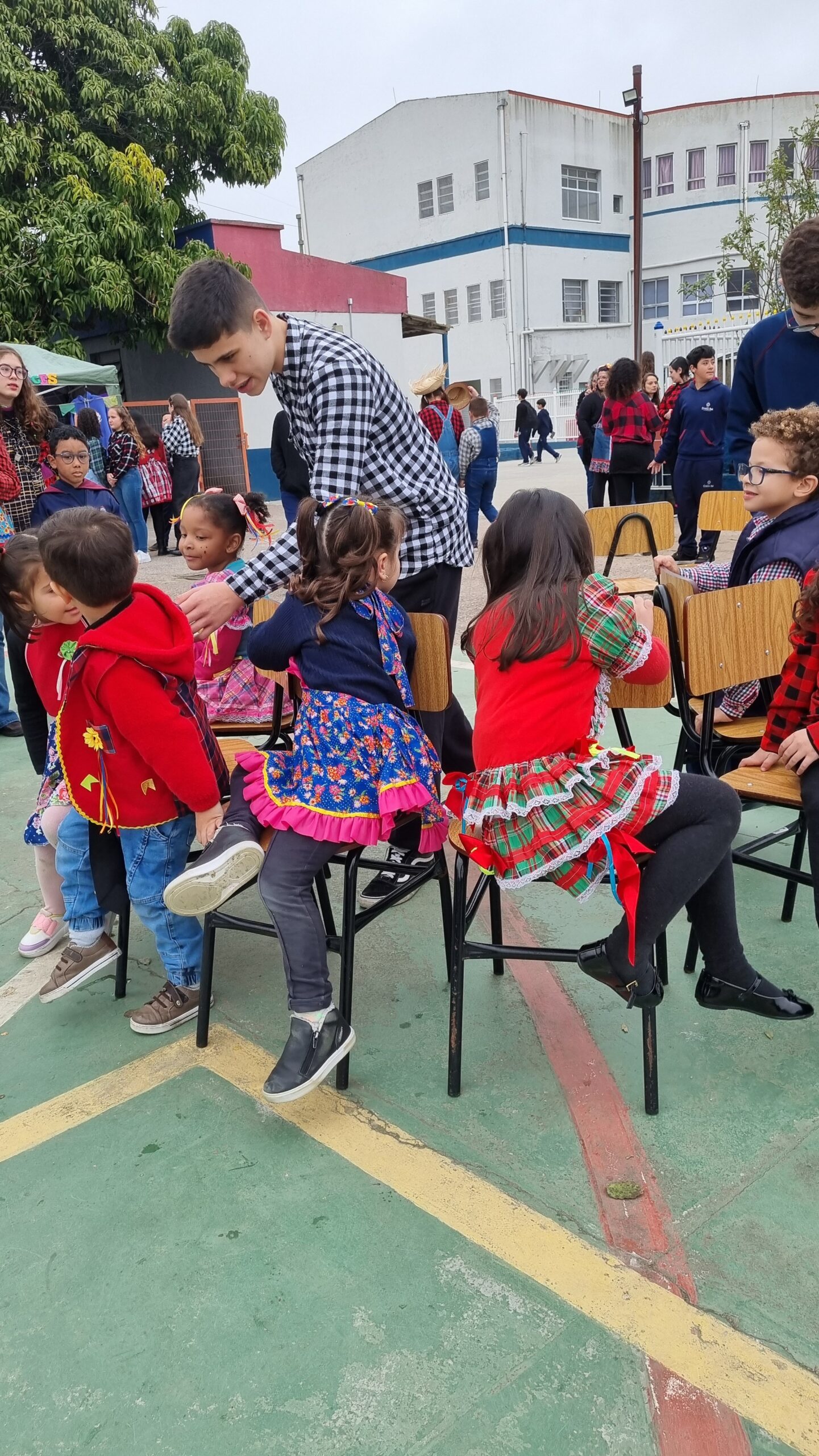 Neste ano, a comemoração junina aconteceu em 20 de julho, com a presença animada de estudantes e professores, fortalecendo laços de amizade. O dia teve uma atmosfera de felicidade e contentamento, com muitas atividades divertidas e mesas decoradas de forma caprichosa por cada grupo de alunos dos anos finais. Enquanto isso, as crianças da Educação Infantil e dos Anos iniciais se divertiram com seus professores, desfrutando de brincadeiras e guloseimas deliciosas. Os estudantes também apreciaram uma encenação de casamento caipira promovida pelos colegas dos anos finais, seguida por muita música e dança. Para encerrar a manhã, todos os alunos se uniram em uma integração calorosa, que culminou na tradicional dança das cadeiras em conjunto com as crianças mais novas.
