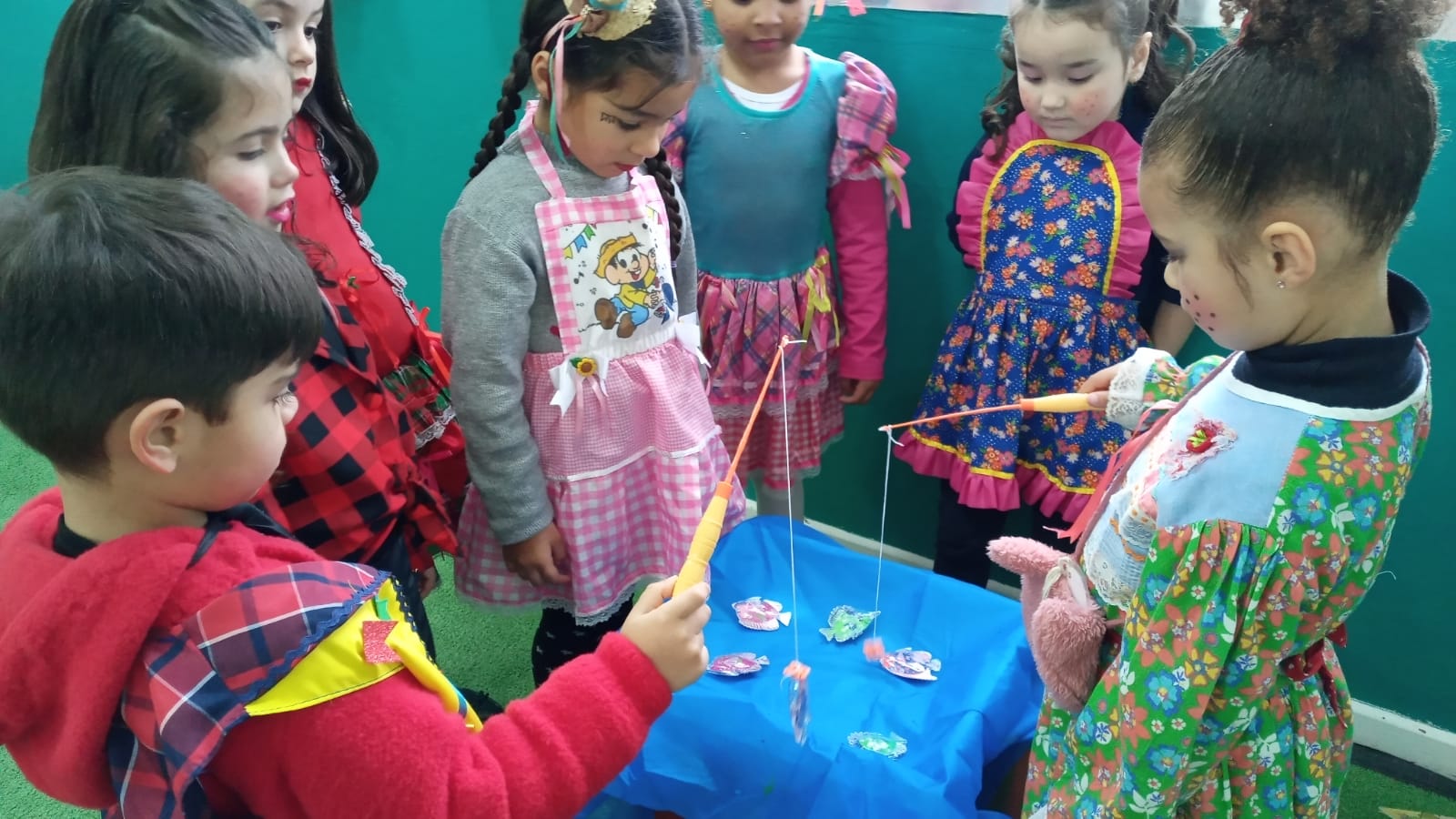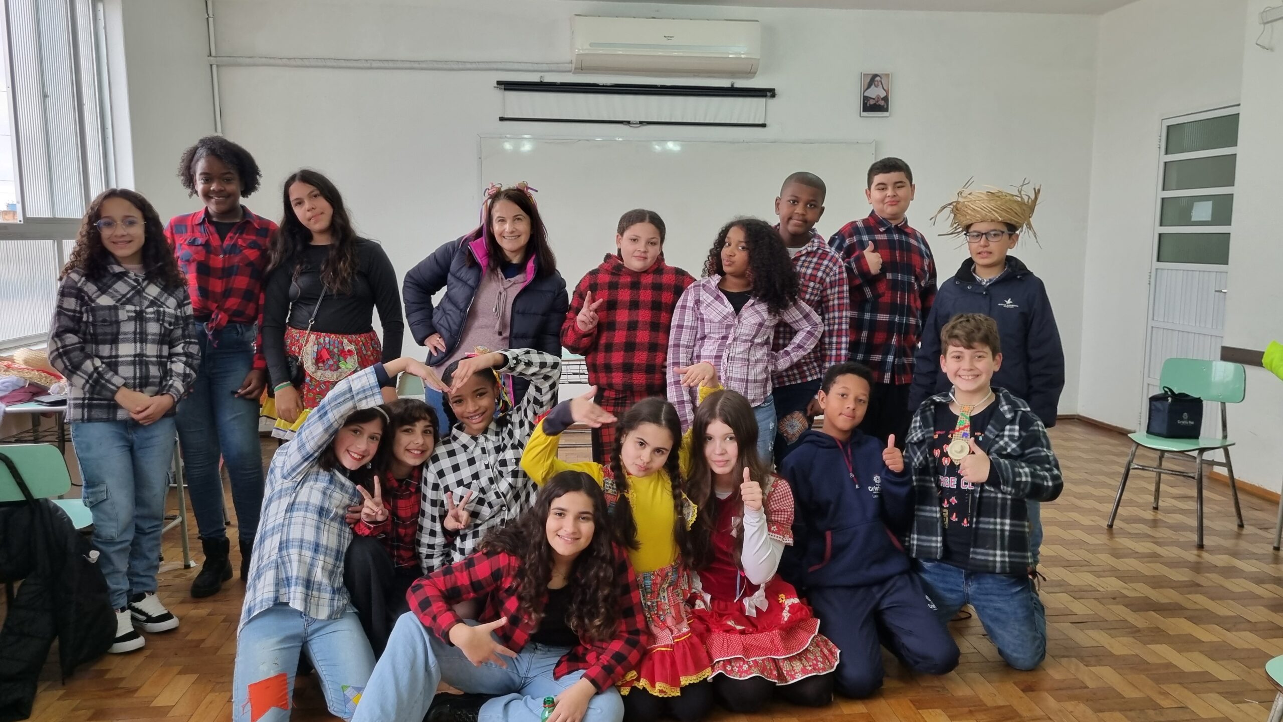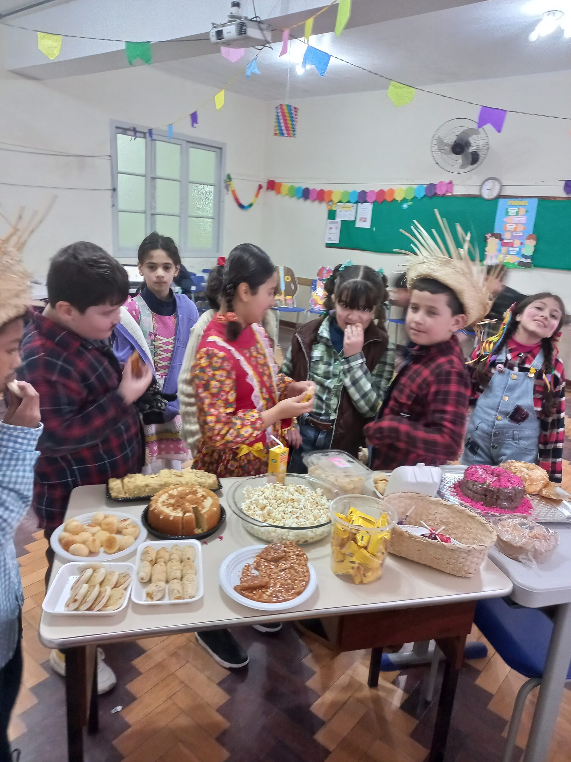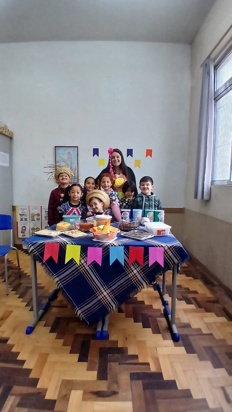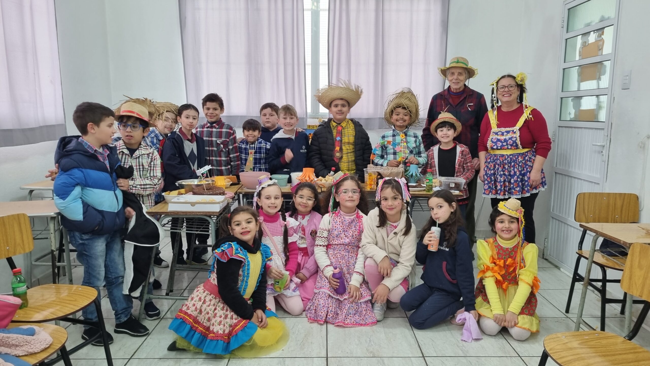 Neste ano, a comemoração junina aconteceu em 20 de julho, com a presença animada de estudantes e professores, fortalecendo laços de amizade. O dia teve uma atmosfera de felicidade e contentamento, com muitas atividades divertidas e mesas decoradas de forma caprichosa por cada grupo de alunos dos anos finais. Enquanto isso, as crianças da Educação Infantil e dos Anos iniciais se divertiram com seus professores, desfrutando de brincadeiras e guloseimas deliciosas. Os estudantes também apreciaram uma encenação de casamento caipira promovida pelos colegas dos anos finais, seguida por muita música e dança. Para encerrar a manhã, todos os alunos se uniram em uma integração calorosa, que culminou na tradicional dança das cadeiras em conjunto com as crianças mais novas.