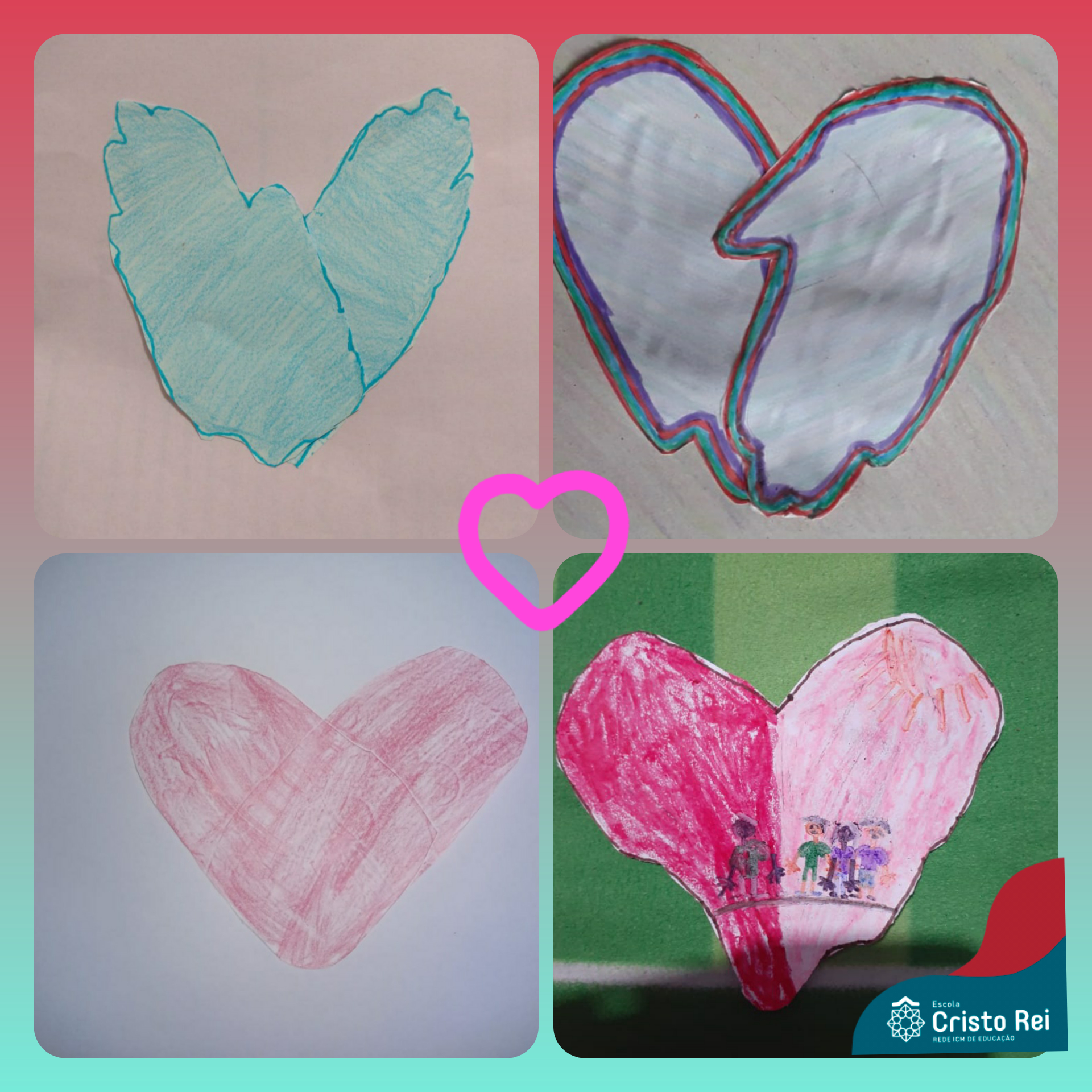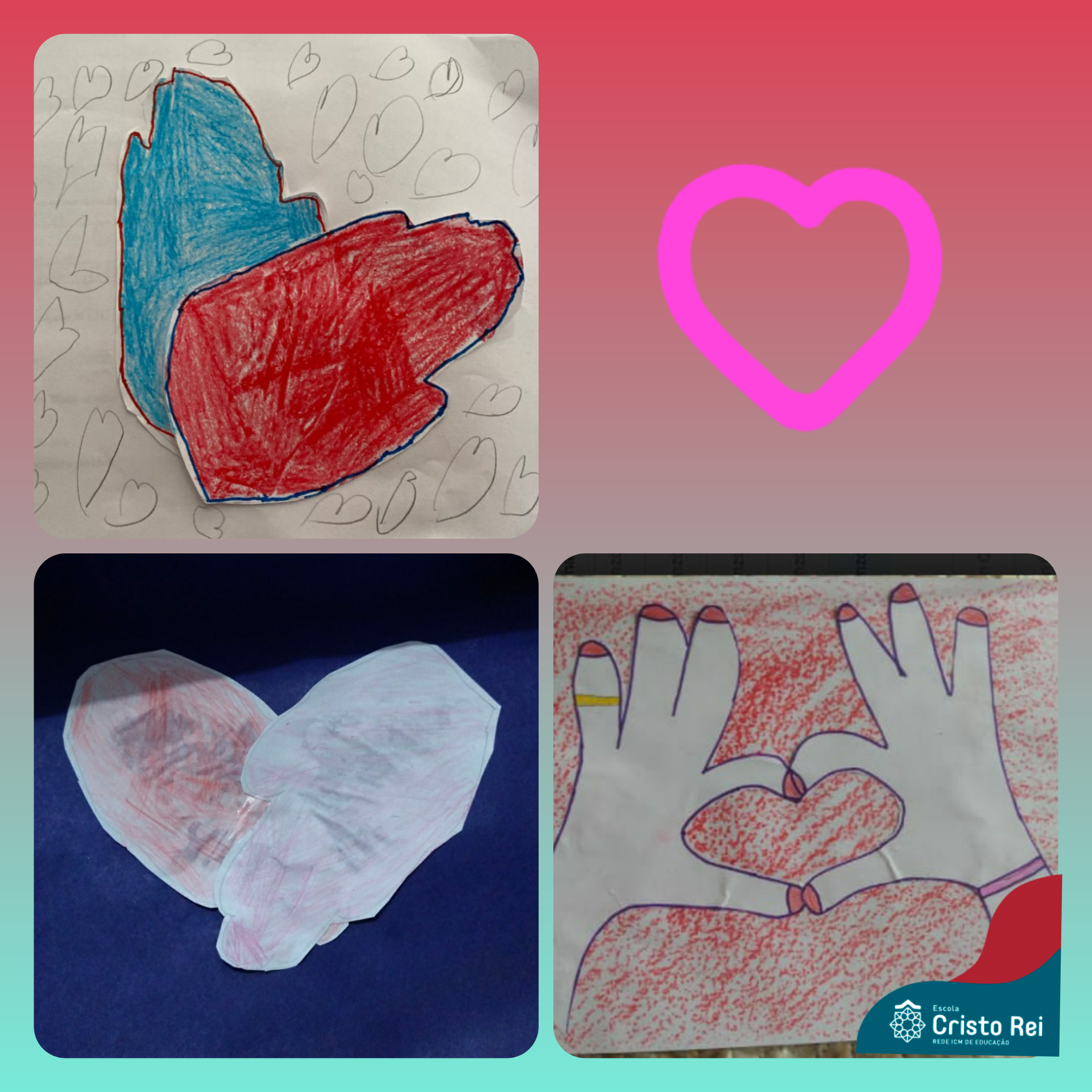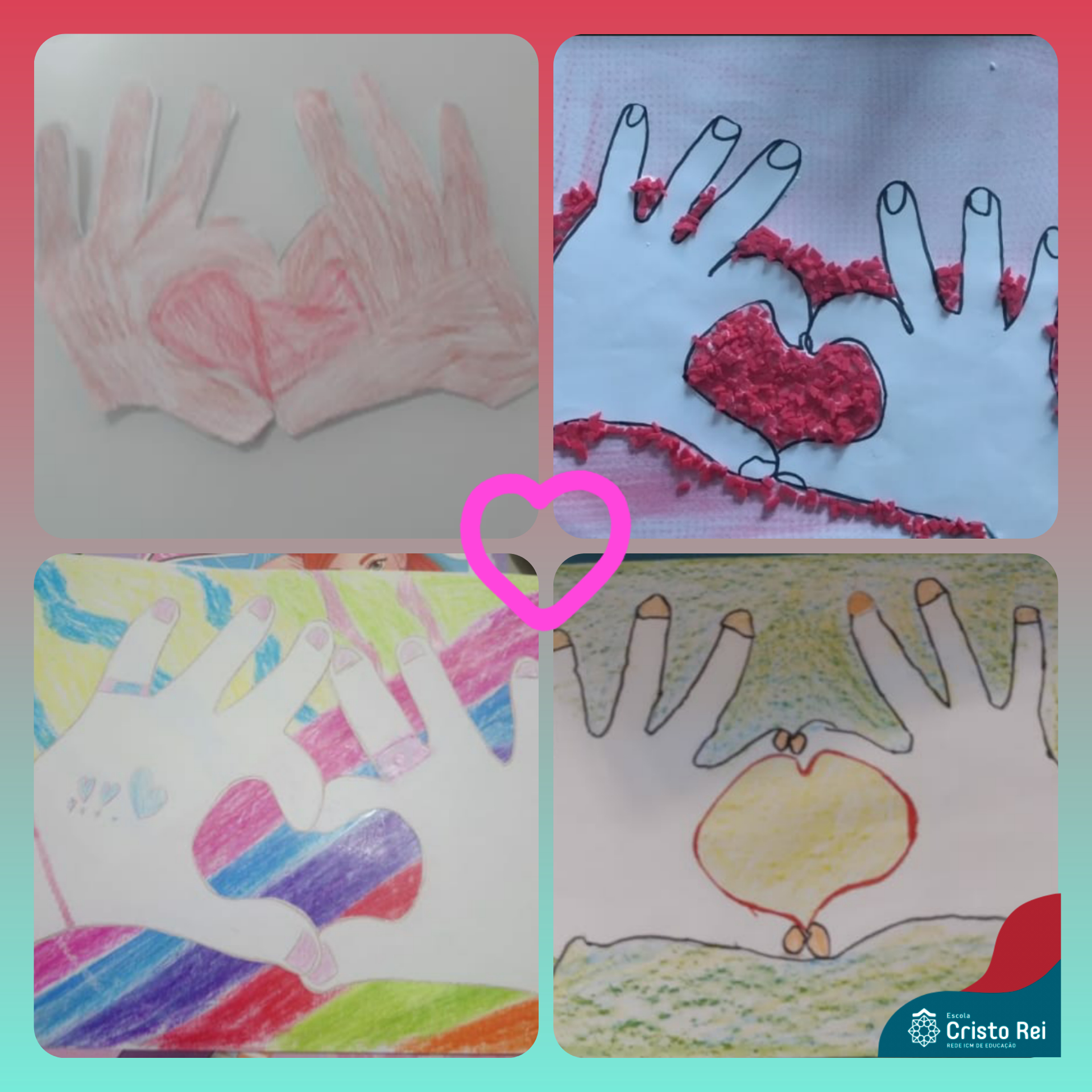 Os alunos do 3º ano realizaram uma atividade lúdica, representando o carinho que transmitimos através de gestos, utilizando o desenho das duas mãos para formar um coração.