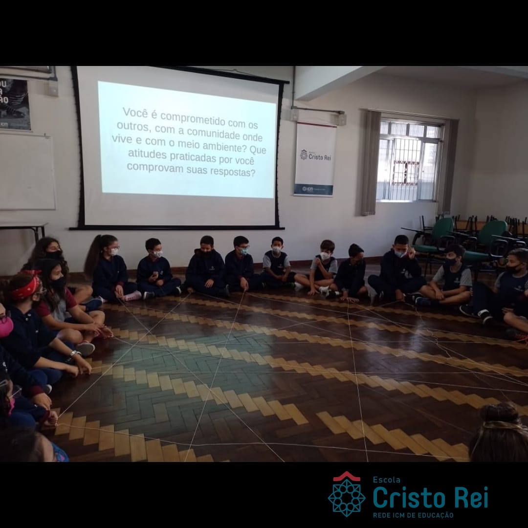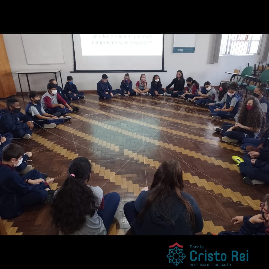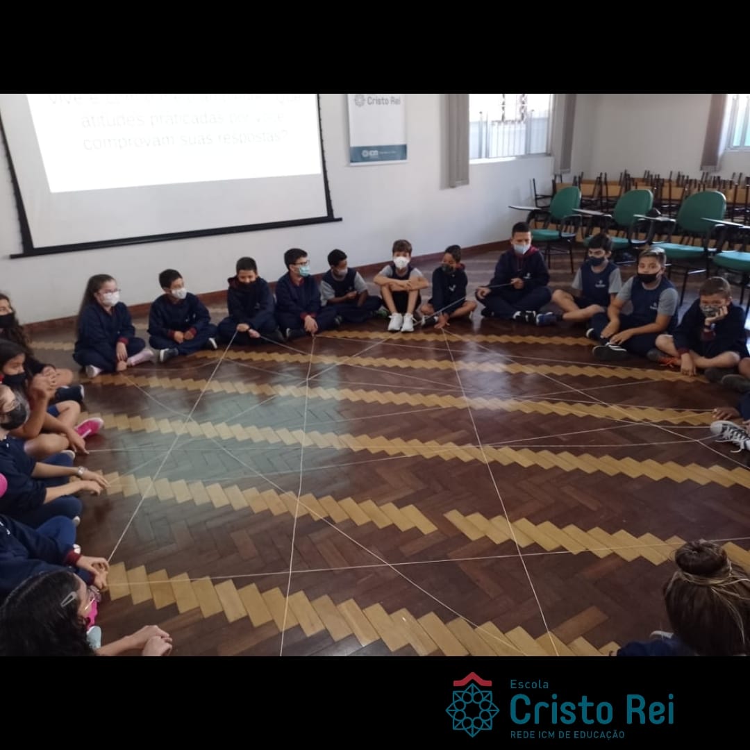 Atividade “Teia da Vida: somos todos irmãos e irmãs” desenvolvida pelos alunos do 6º ano na disciplina de Ensino Religioso a partir do conteúdo “Vivemos no Mundo”. Uma dinâmica que nos permite conhecer melhor uns aos outros e compreender que, no mundo, tudo está interligado.