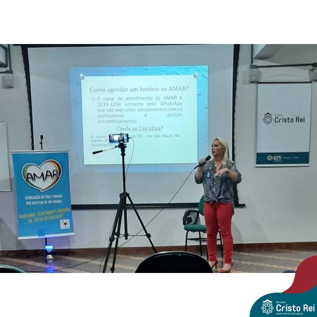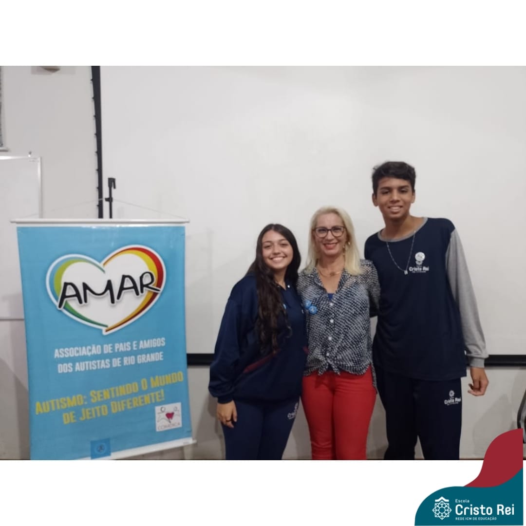 Palestra alusiva ao “Abril Azul, Mês de conscientização sobre o autismo”, com Rosane Silva (representante da AMAR – Associação de pais e amigos dos autistas de Rio Grande). Evento fruto do projeto desenvolvido pelos alunos do 9° ano, referente à inclusão na escola.