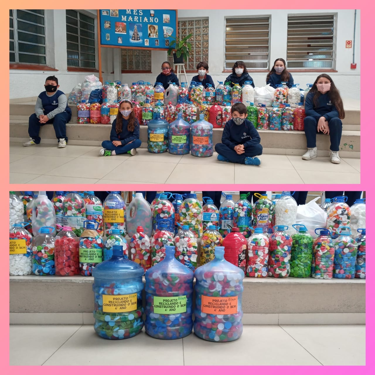 Estudantes do 4° ano realizam a entrega das tampinhas que arrecadaram nos meses de abril e maio, no Projeto Reciclando e construindo o bem, ao Asilo das Flores.