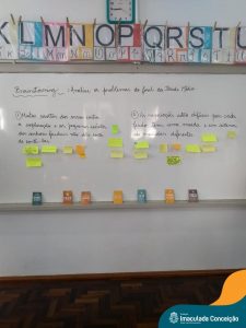A professora de História, Andreia Kich Dessian, trouxe para a turma 71, dois problemas que desestabilizaram o sistema feudal, do final da Idade Média. Os alunos foram desafiados a pensar soluções para esses problemas, seguindo as regras da tempestade de ideias.  Ao final, as ideias foram ligadas àquilo que realmente aconteceu na História: a Formação dos Estados Nacionais.