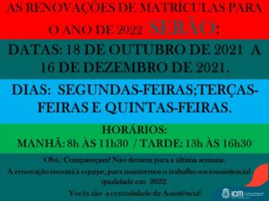 Na próxima semana, dia 18 de Outubro as renovações iniciarão. Estamos esperando por você! Venha com antecedência, não deixe para a última semana.